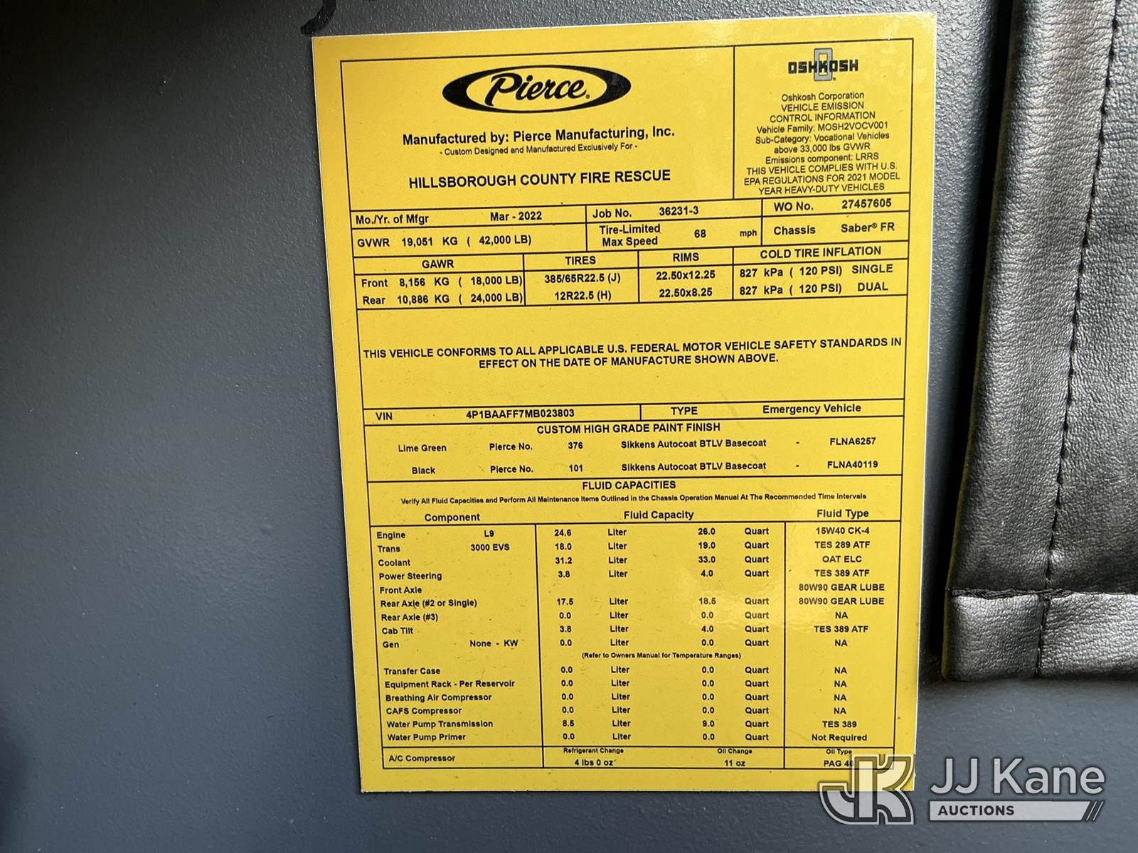 2021 Pierce Arrow XT Fire Truck, 12.5L L6 diesel, Auto, A/C, True Mileage Unknown Hillsborough County BOCC Unit (Seller States: Salt Water Damage)(Not Running, Condition Unknown)(Parts Missing/Removed, No Key Needed)(FL Residents Purchasing Titled Items - tax, title & registration fees will be collected at the maximum rate of $400.00 under 25,999 and $800.00 for Over 26,000 and $250.00 trailers - Proof of insurance is mandatory; Out of State Residents Purchasing Title Items - tax will be collected based upon your state rate.) This is a Titled Item NOTE: This unit is being sold AS IS/WHERE IS via Timed Auction and is located in Thonotosassa, FL. Inspection & preview days for this unit are the 2 business days prior to the first day of items closing for this auction, item is located at 11720 N US 301 Thonotosassa, Fl 33592 and hours of operations are 8a-4p. For pre-sale questions, please contact Office Staff @ (813) 986-2485. (Buyer is responsible for removal. Assistance by consignor or JJ Kane Auctioneers is not assured.)