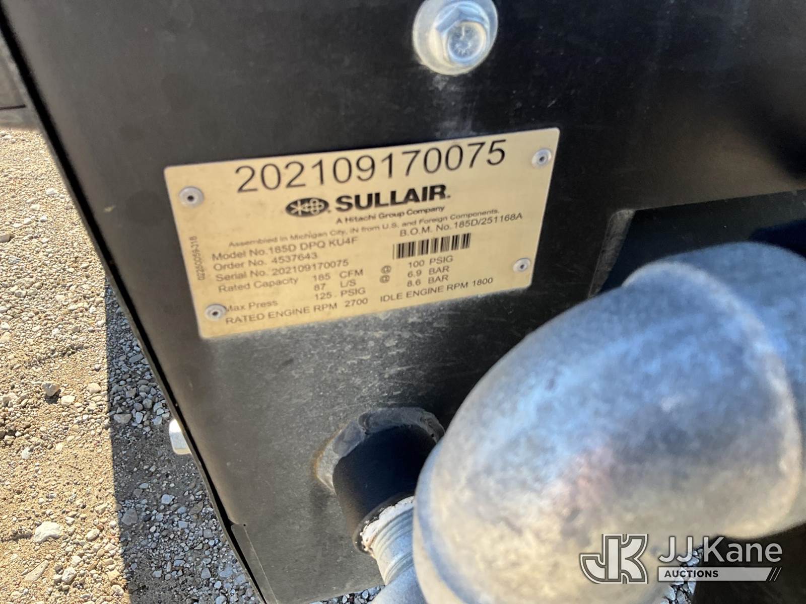 2021 Sullivan 185D DPQ Air Compressor, Kubota diesel, City of Plano Owned (Runs) (Per Seller: Coolant In Oil) (Reads 202 hours) This is a Titled Item NOTE: This unit is being sold AS IS/WHERE IS via Timed Auction and is located in Waxahachie, TX. Inspection & preview days for this unit are the 2 business days prior to the first day of items closing for this auction, item is located at 999 Solon Rd Waxahachie, TX 75165 and hours of operations are 8a-4p. For pre-sale questions, please contact Alex Bayless @ (469) 550-4938. (Buyer is responsible for removal. Assistance by consignor or JJ Kane Auctions is not assured.)