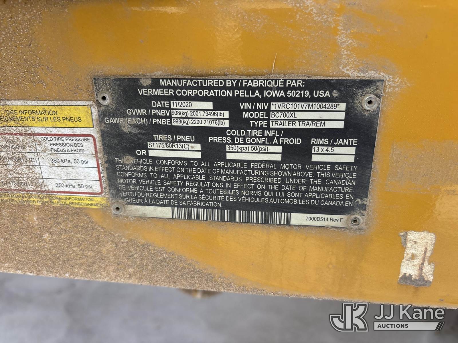 2021 Vermeer BC700XL Portable Chipper (6 in), s/n 1VRC101V7M1004289, gas Trailer Mounted (No Title) (Runs) (Reads 436 hours) NOTE: This unit is being sold AS IS/WHERE IS via Timed Auction and is located in Rome, NY. Inspection & preview days for this unit are the 2 business days prior to the first day of items closing for this auction, item is located at 5835 Success Dr Rome, NY 13440 and hours of operations are 8a-4p. For pre-sale questions, please contact Ryan Jackson @ (315) 749-3790 or Ryan.Jackson@jjkane.com. (Buyer is responsible for removal. Assistance by consignor or JJ Kane Auctions is not assured.)