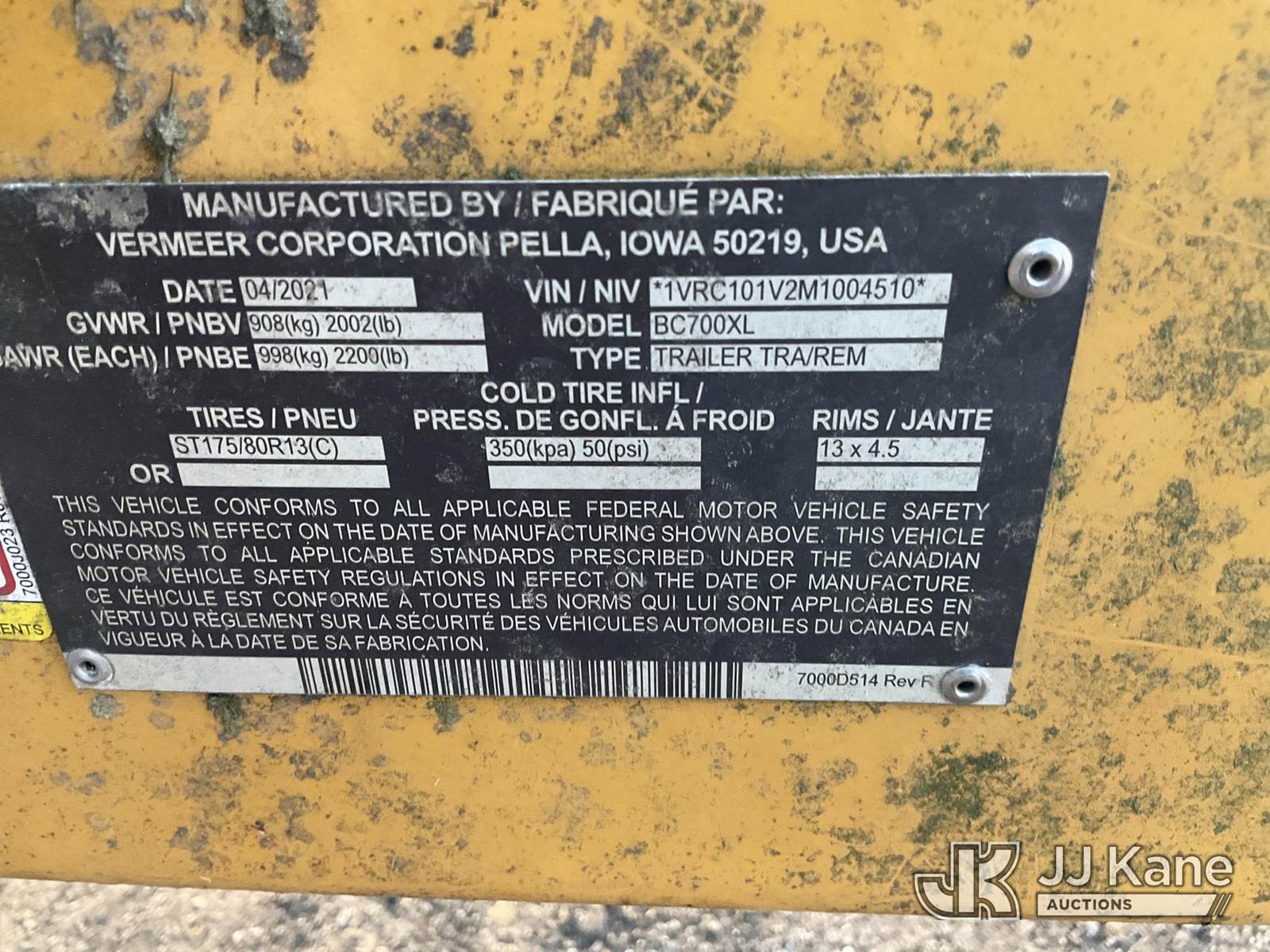2021 Vermeer BC700XL Portable Chipper (6in Disc), s/n 1VRC101V2M1004510, gas, Trailer Mounted (No Title) (Runs) (Reads 270 hours) NOTE: This unit is being sold AS IS/WHERE IS via Timed Auction and is located in Plymouth Meeting, PA. Inspection & preview days for this unit are the 2 business days prior to the first day of items closing for this auction, item is located at 1402 Conshohocken Rd Plymouth Meeting, PA 19462 and hours of operations are 8a-4p. For pre-sale questions, please contact Bruce Thomas @ (267) 887-0392 or bruce.thomas.jr@jjkane.com. (Buyer is responsible for removal. Assistance by consignor or JJ Kane Auctions is not assured.)