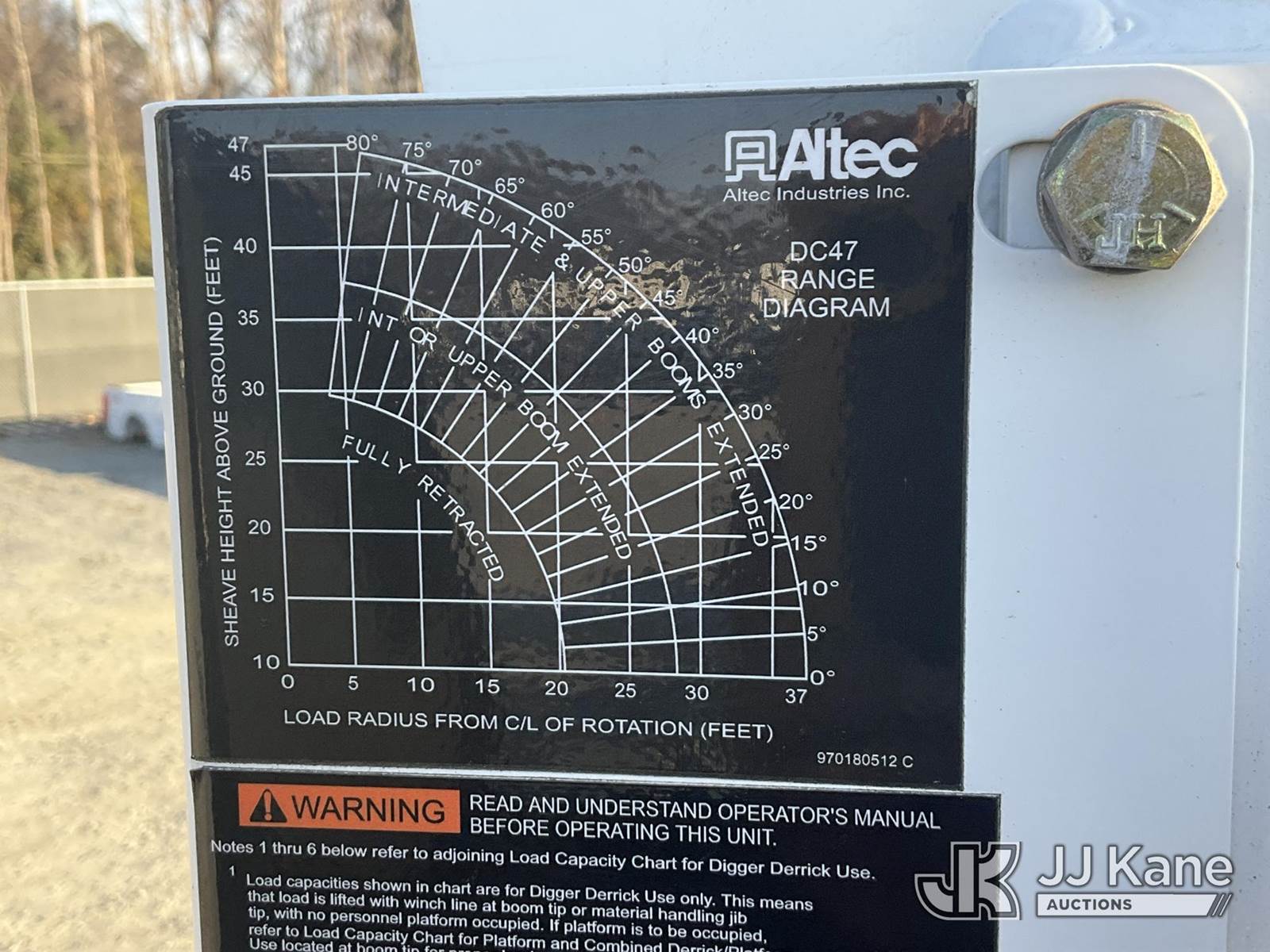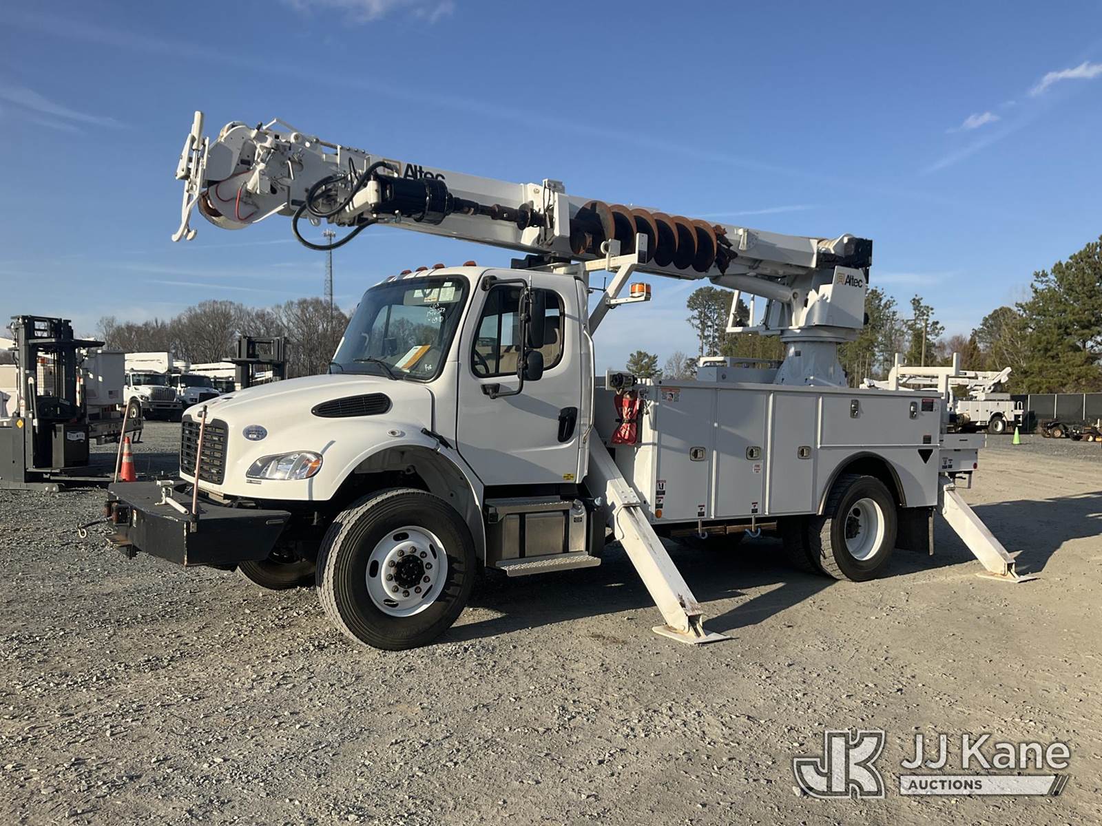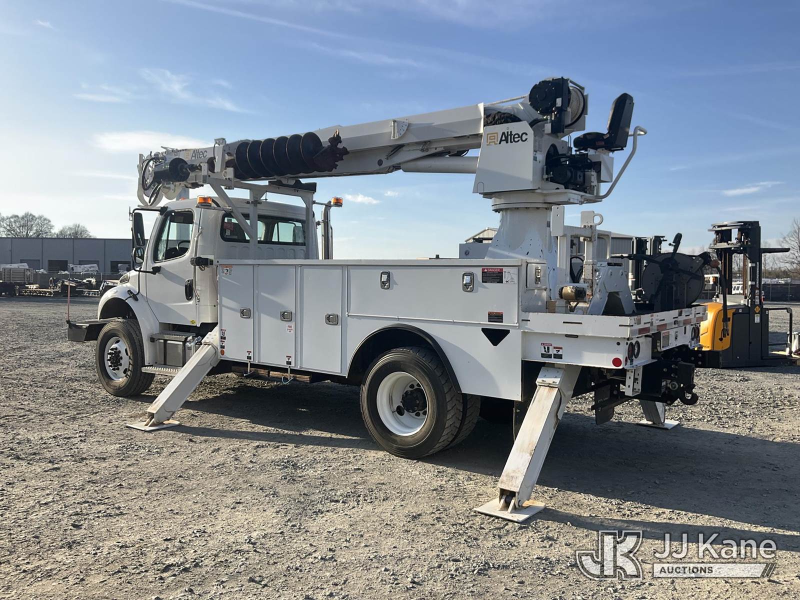 Altec DC47-TR, 23,790 Lb Digger Derrick s/n 0122EU5515, with 47 ft sheave height, 3 section hyd boom, 2 spd digger, heel winch, pole guides, riding console & 4 hyd outriggers, rear mounted on 2022 Freightliner M2 106 Utility Truck, Cummins 6.7L diesel, Auto, A/C, with front winch, (20,682 miles) (Runs & Moves) (Upper Condition Unknown, Hyd Leak) This is a Titled Item NOTE: This unit is being sold AS IS/WHERE IS via Timed Auction and is located in China Grove, NC. (Manuals provided in cab) (Buyer is responsible for removal. Assistance by consignor or JJ Kane Auctions is not assured.)