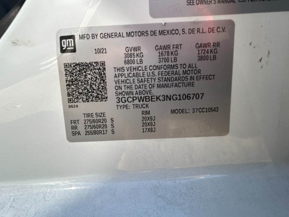 2022 CHEVROLET SILVERADO 1500 CREW CAB PICKUP TRUCK, 2.7L gasoline, automatic, a/c, pw, pdl, pm, tow package. s/n:3GCPWBEK3NG106707