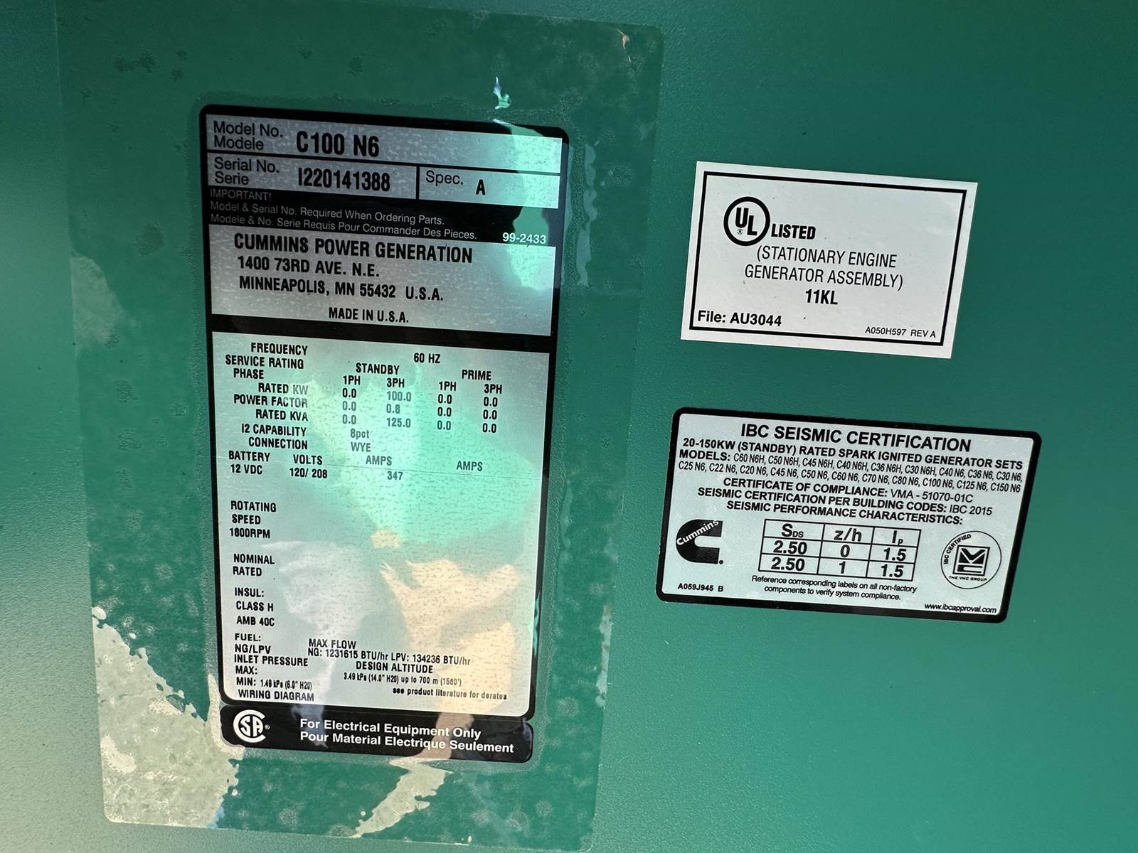 New Cummins 100 kW standby natural gas / propane generator set, model C100N6, SN-I220141388. Cummins QSJ5.9G-G3 engine rated 162 HP at 1800 RPM, SN-LB009309, EPA certified. 3/60/120/208V, 12 lead reconnectable to other voltages. 200-600 Amp adjustable 100% rated main-line circuit breaker. PMG permanent magnet generator. Engine cooling radiator rated 50C/122F ambient. UL 2200 listed. Seismic certified. PowerCommand 2.3 digital control panel. Battery charger 6 Amp. Coolant heater 1000W. Aluminum sound attenuated enclosure 180 MPH wind rating. Battery and start up not included. 0 Hours. Year 2022. Cummins 10 Yr 5000 Hr limited warranty thru March 19, 2034. Overall dimensions 41W x 119L x 64H on 6H blocks, 2960 lbs. FOB Waukesha, WI