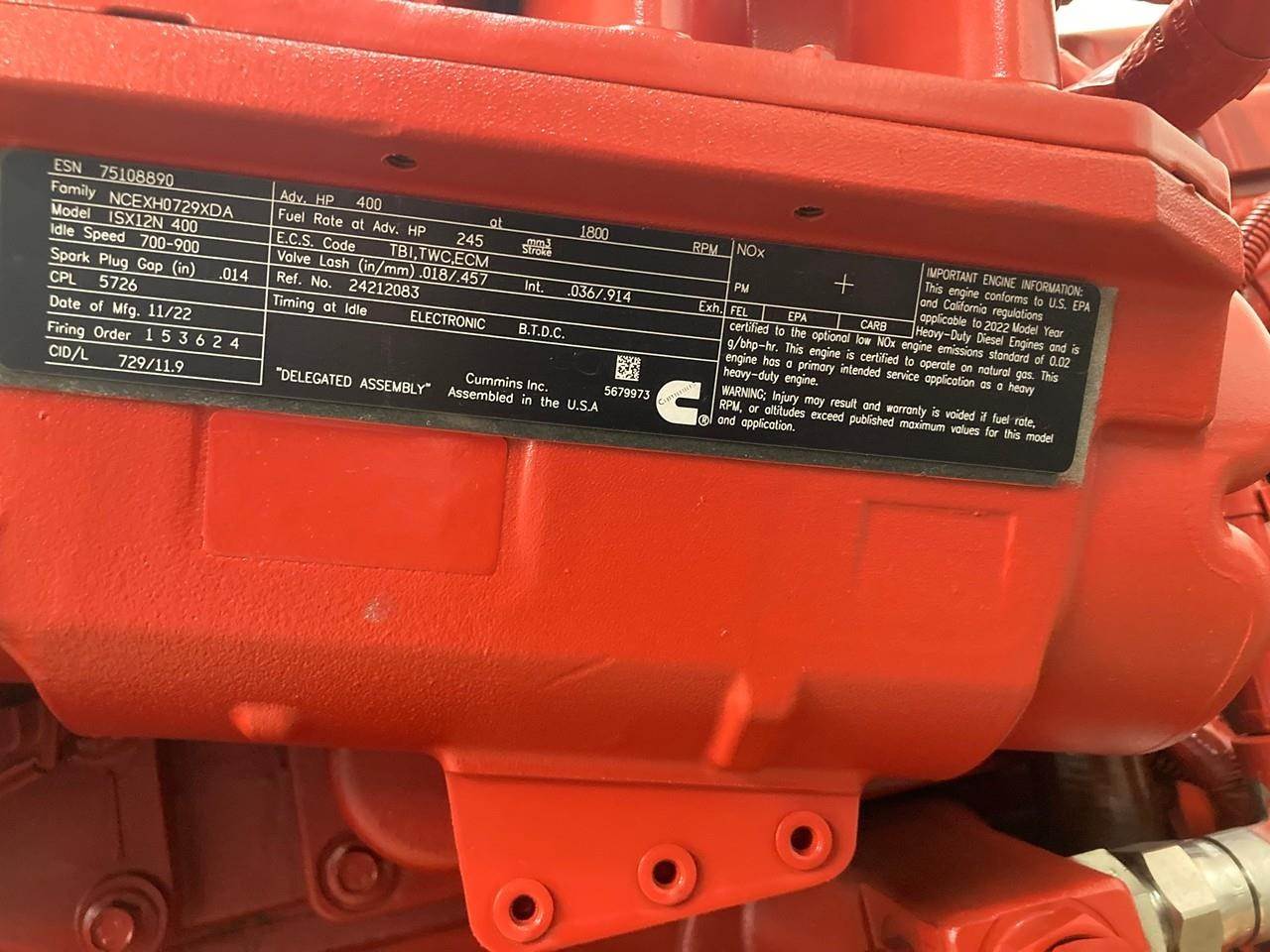 NEW 2022 CUMMINS ISX12N 400HP NATURAL GAS ENGINE FOR SALE at ADELMAN’S TRUCK PARTS in CANTON, OHIO. COMPLETE with STARTER, FLYWHEEL, and ECM (MINUS ALTERNATOR), CM2380 FUEL SYSTEM, 400 HP @ 1800 RPM, CPL # 5726, NCEXH0729XDA FAMILY #, with TBI, TWC, & ECM EMISSION CONTROL SYSTEMS.