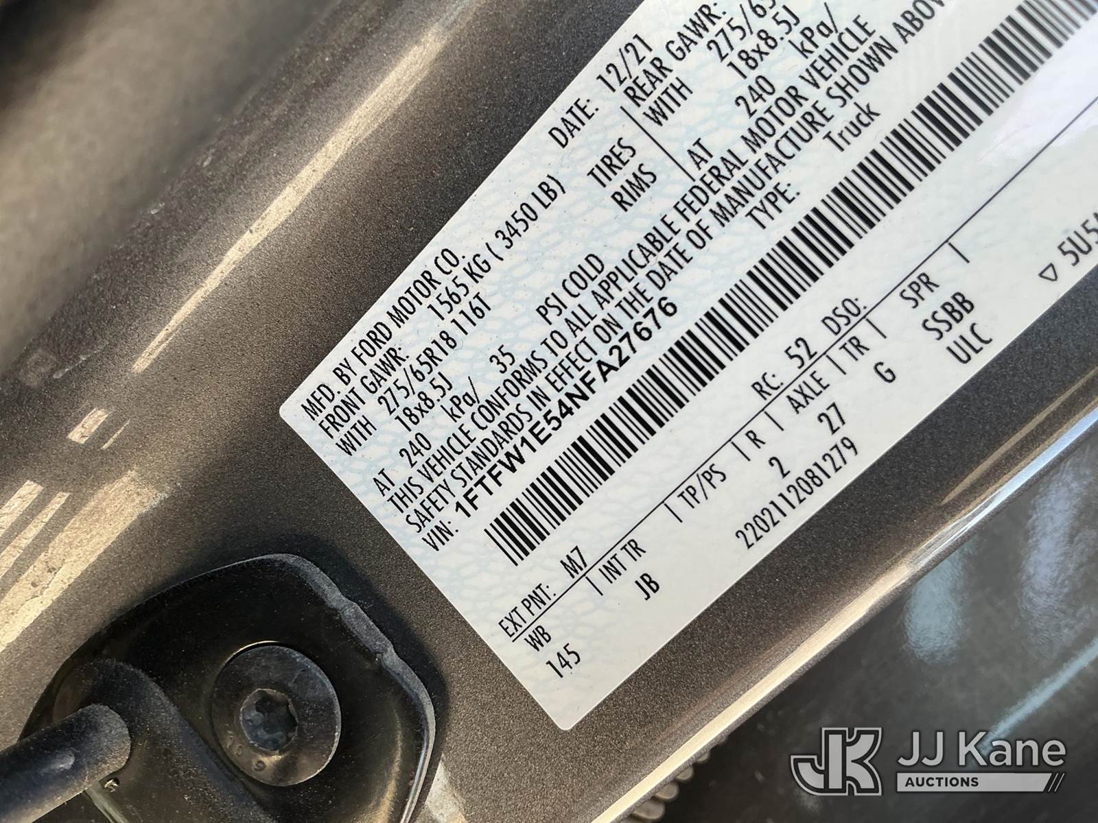 2022 Ford F-150 Crew-Cab Pickup Truck, 8-cyl gas, 4WD, 6-Speed Automatic, A/C, with Front Bumper Brush Guard , (100,982 miles) (Runs & Moves) (Per Seller: 4x4 Is Bad, Windshield Is Cracked, Rear Bumper Has Scratches, Passenger Side Rear Fender Area Black Plastic Guard Is Coming Apart Unattached, Front Bumper Right Bottom Area Is Coming Apart Unattached, Passenger Mirror Assembly Is Scratched) (Reads 6,021 hours) This is a Titled Item NOTE: This unit is being sold AS IS/WHERE IS via Timed Auction and is located in Midland, TX. For pre-sale questions please call EJ Brown at (915) 341-2565. (Buyer is responsible for removal. Assistance by consignor or JJ Kane Auctions is not assured.)