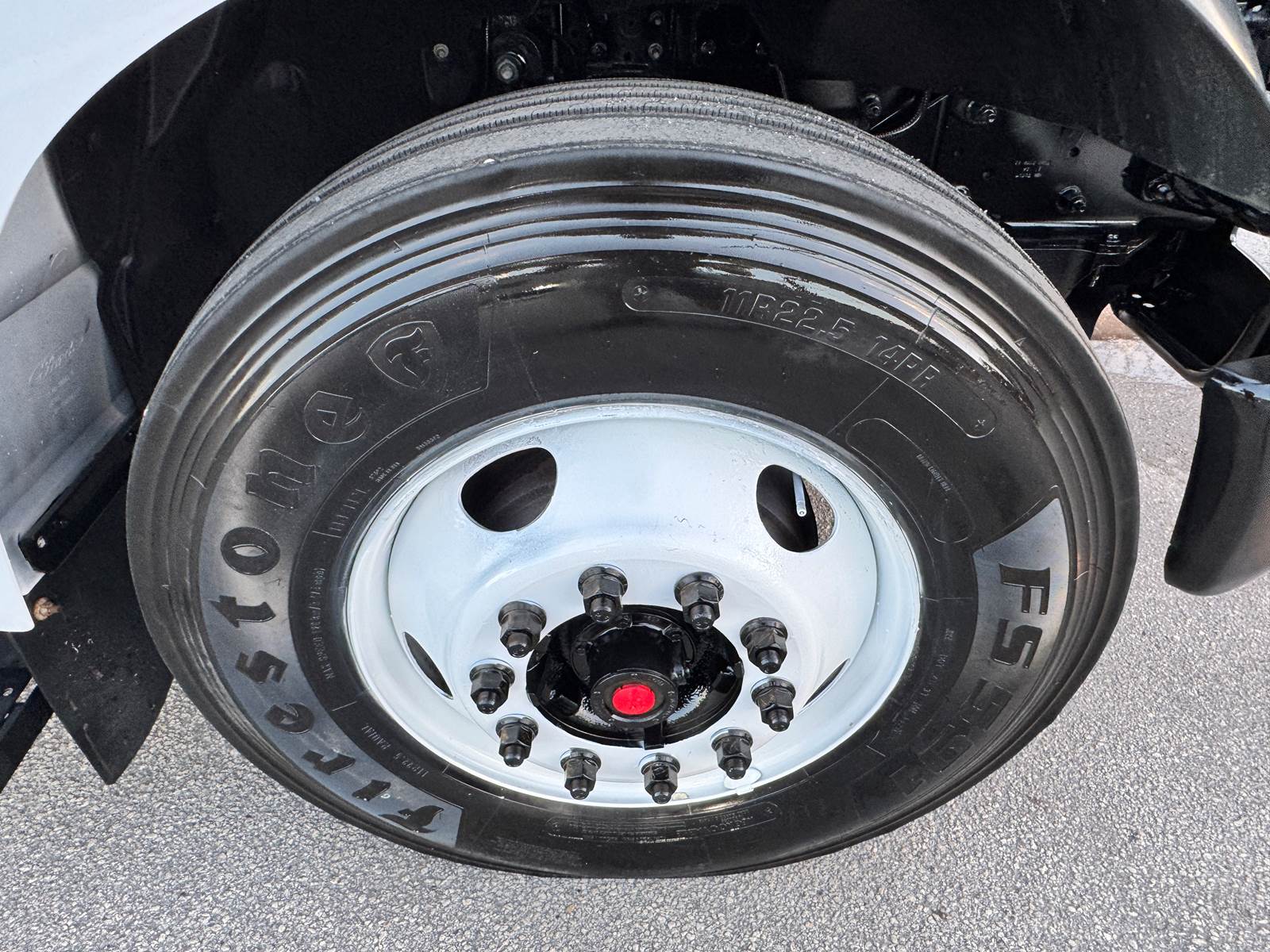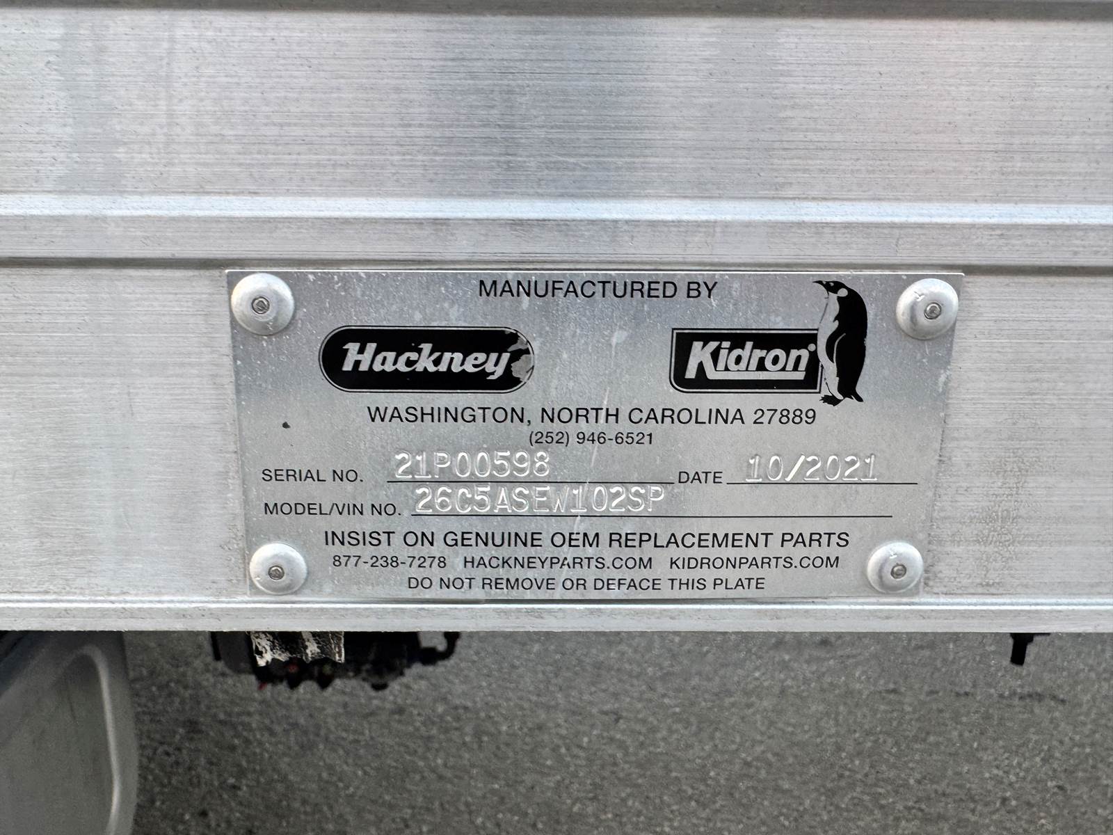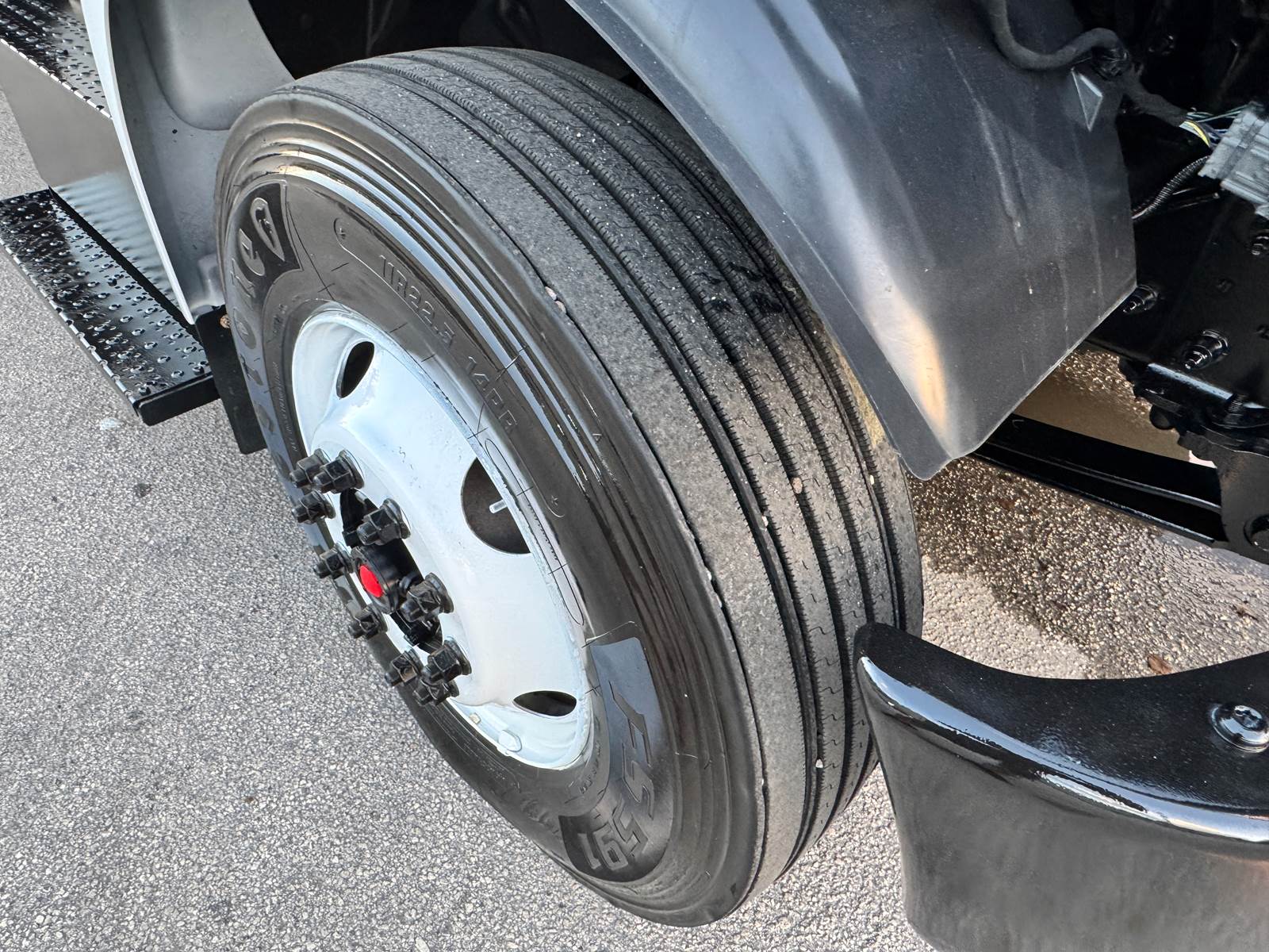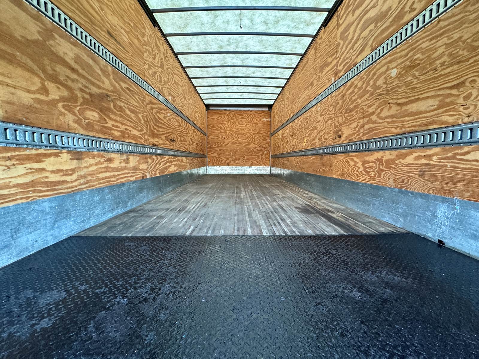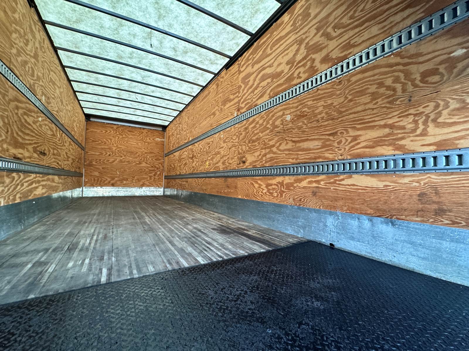The truck is equipped with a 26-foot Hackney aluminum van body that includes plywood paneled walls, a translucent roof for natural light, and two rows of E-tracks for cargo security. A roll-up rear door and curbside access provide easy entry, while a 4,000 lb aluminum tuckaway liftgate ensures safe loading and unloading of heavy cargo. Additional features include steel wheels, air brakes, and a 50-gallon fuel tank.