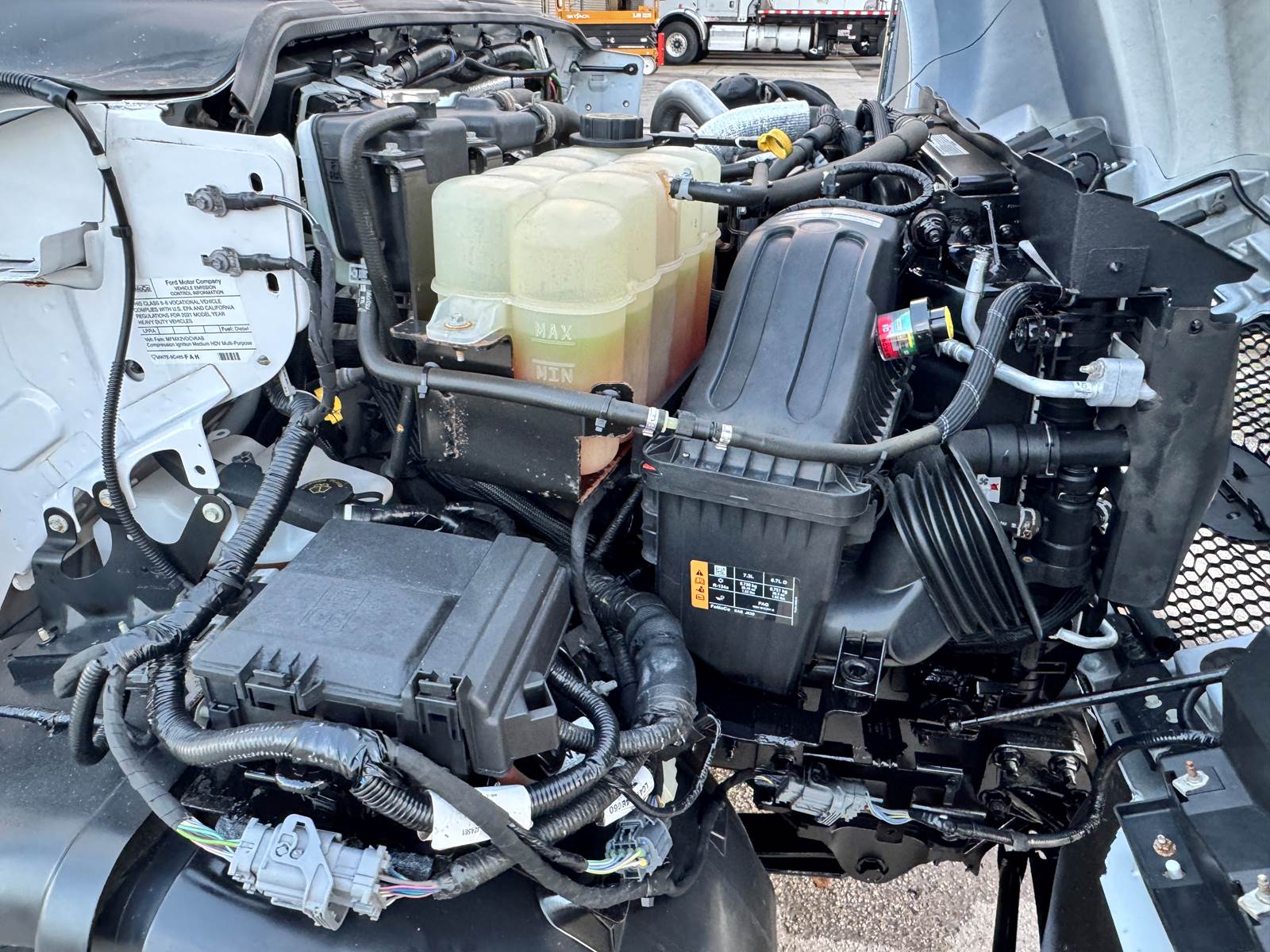 The 2022 Ford F-750 is a medium-duty box truck built for regional and local freight hauling. It is powered by a 6.7L Powerstroke V8 turbo diesel rated at 270 horsepower, paired with a Ford 6-speed automatic transmission for smooth and dependable performance. Configured with a 25,999 lb GVWR and a 281-inch wheelbase, it features a 10,000 lb front axle and a 21,000 lb rear axle, supported by spring suspension to handle demanding loads with balance and control.