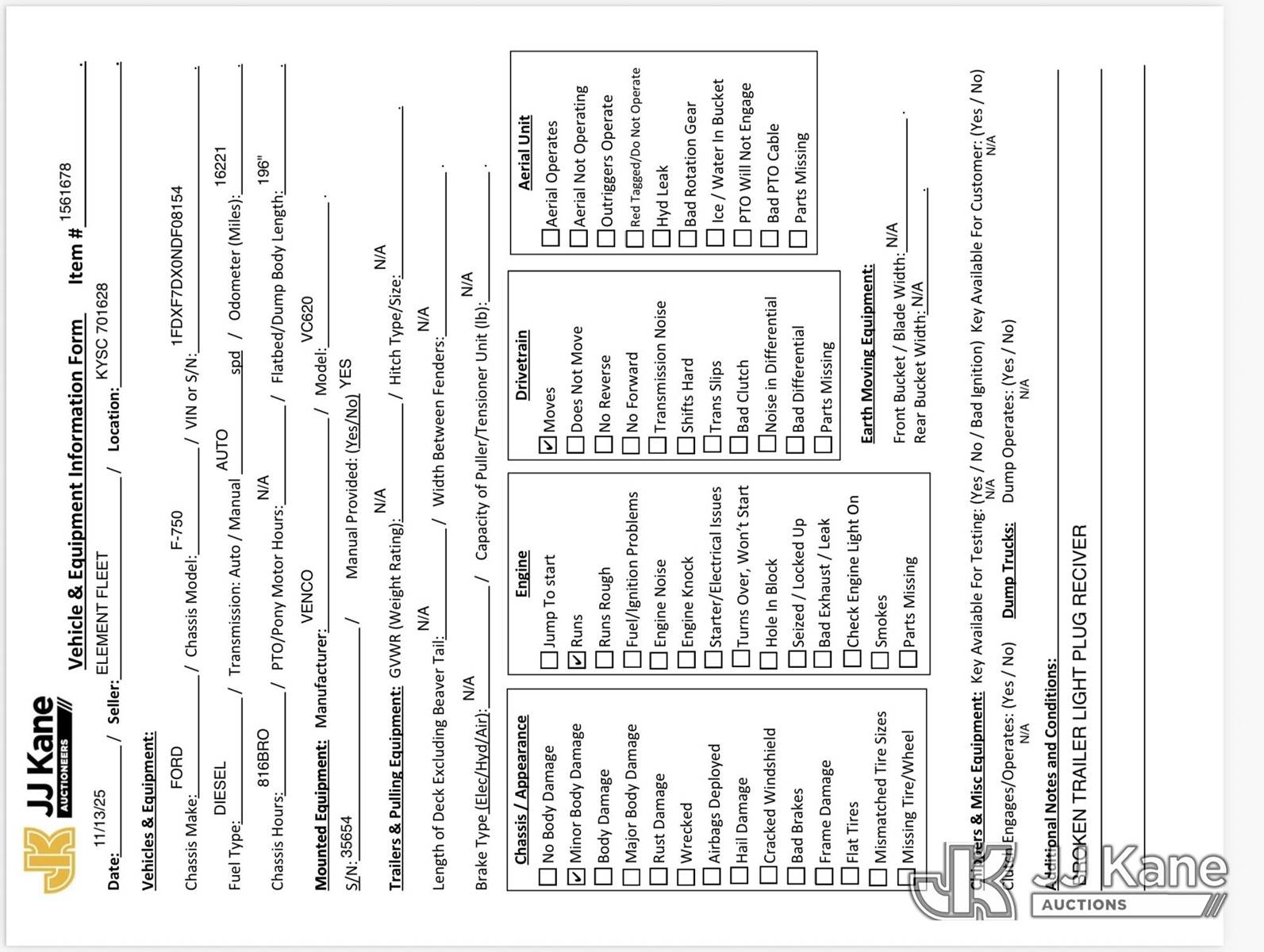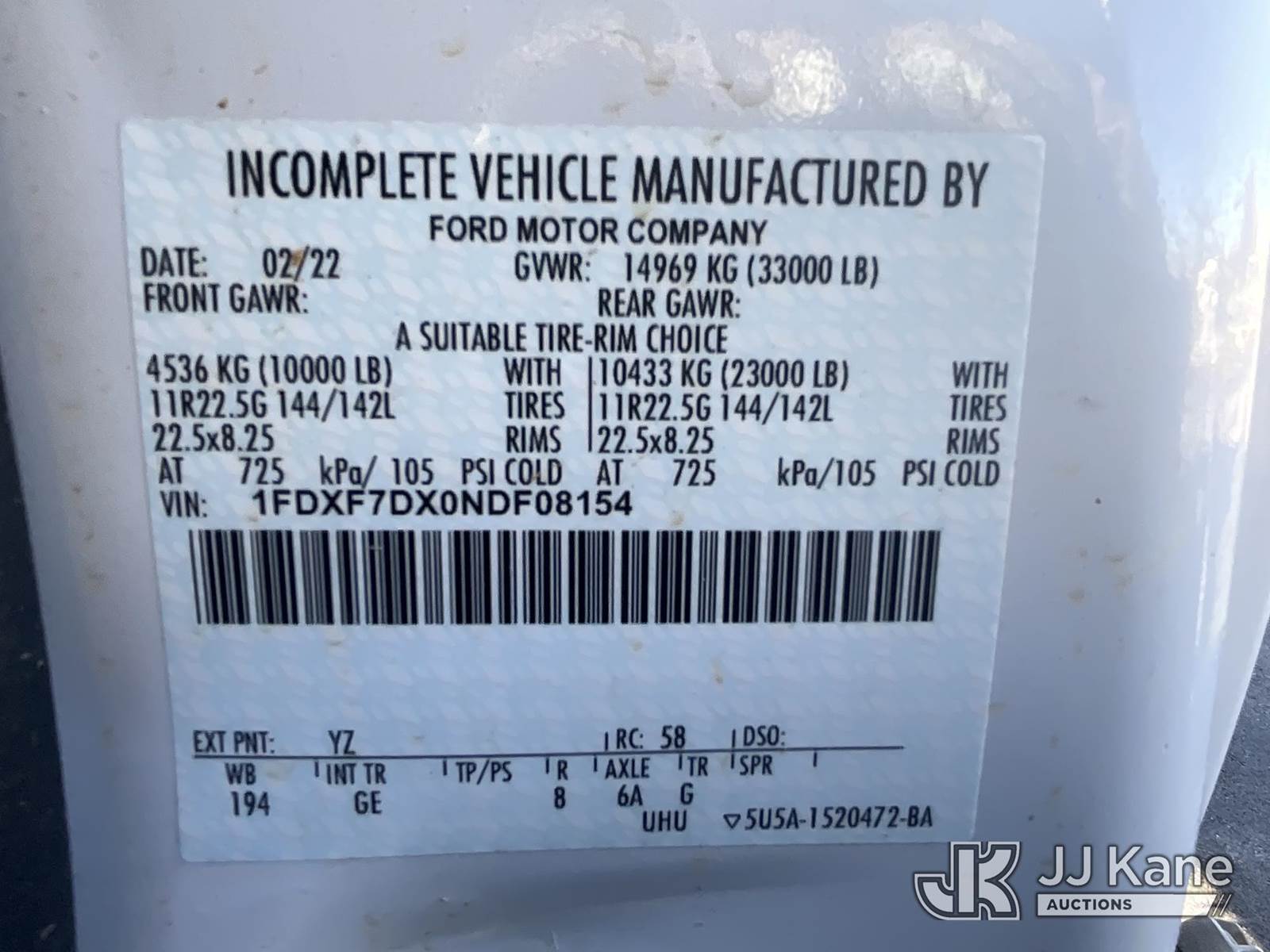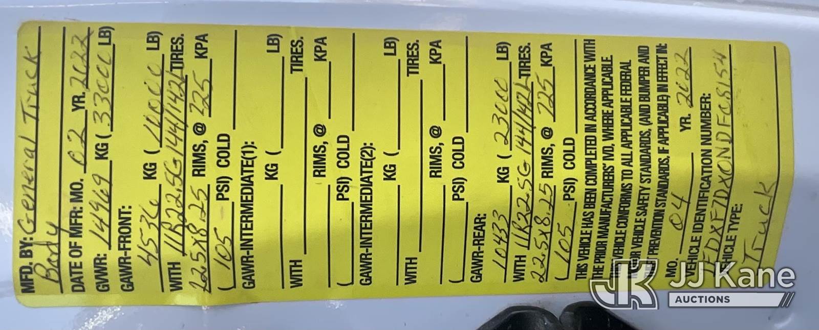 2022 Ford F750 Flatbed/Dump Truck, 6.7L diesel, Auto, A/C, with Venco VC620 dump body, (16,221 miles) (Runs & Moves, Dump Operates) (Body Damage) This is a Titled Item NOTE: This unit is being sold AS IS/WHERE IS via Timed Auction and is located in Elizabethtown, KY. For more information & removal arrangements please contact Jeremy Walters @ jeremy.walters@jjkane.com. Load out by appointment only, Buyer/Hauler must present copy of paid invoice upon arrival. Purchaser acknowledges ALL lots must be removed within 5 business days of Auction, or a storage fee may be incurred. For load out and pick up information, please reference the release form sent out after purchase. Kentucky Auctioneer Michael Whitebread - License # 256617 (Buyer is responsible for removal. Assistance by consignor or JJ Kane Auctioneers is not assured.)