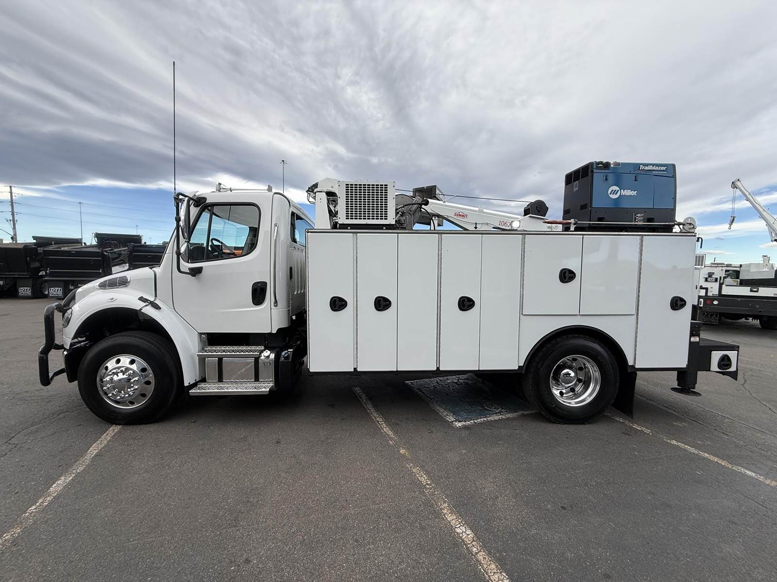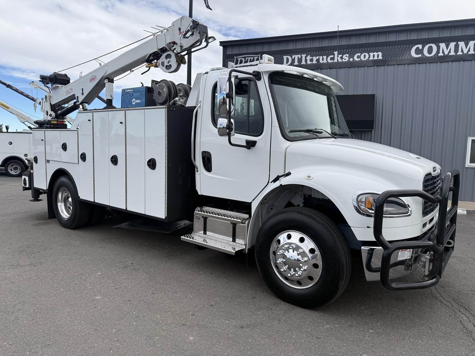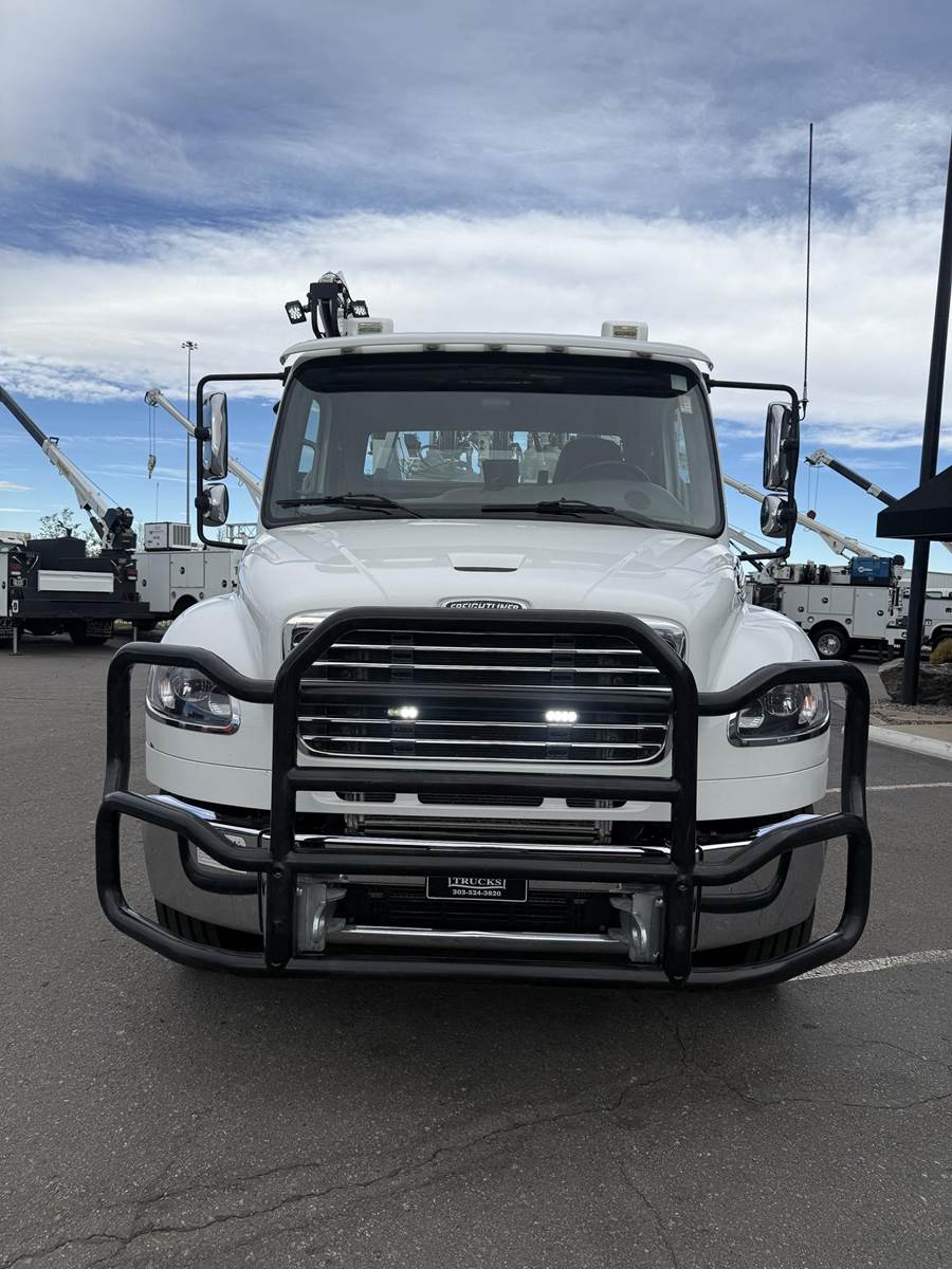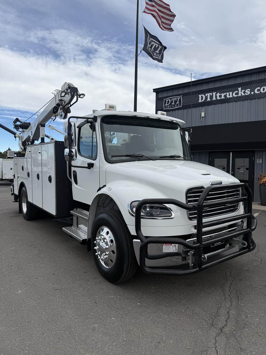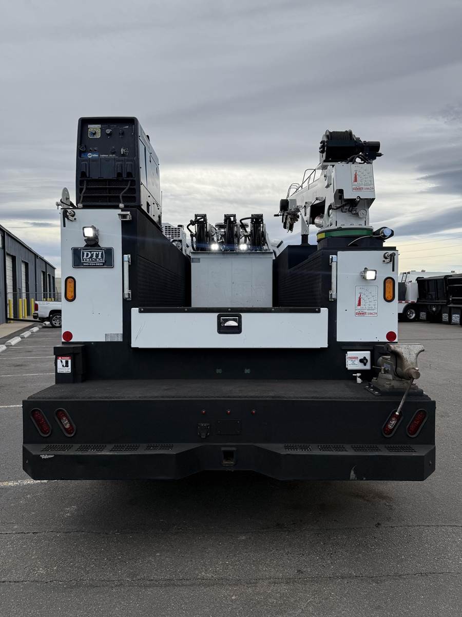2022 Freightliner M2-106 Mechanics Truck, 8.9L Cummins L9 Diesel Engine, 350 HP, Engine Brake, Allison 3000 RDS 6 Speed Automatic Transmission, 137,641 ECM Verified Miles & 5,444 ECM Verified Engine Hours, 33K GVWR (12K Steer Axle, 21K Drive Axle), Air Ride Suspension With Dump Valve, 5.22 Axle Ratio, Diff Lock,194” Wheel Base, 127” CTA, 11R22.5 Tires All Mounted On Aluminum Wheels, Dual 50 Gallon Aluminum Diesel Fuel Tanks, Block Heater, CARB Compliant, Air Ride Cab, Air Ride Driver Seat, Bench Passenger Seat, A/C, Tilt & Telescoping Steering Wheel, Cruise Control, Bluetooth Radio, Power Windows & Locks, Power & Heated Mirrors, 14’ Summit Mechanics Body, (4) Drawer Packs, (1) Bolt Bin, Vented Oxy-Acetylene Cabinet With Hose Reel, Gang Locks, Summit 10629 Hydraulic Crane, 10,000 LB Max Capacity, 29’ Max Reach, (2) Boom Lights, Wireless Remote, Hydraulic Outriggers, VMAC H40 Hydraulic Air Compressor (40 CFM @ 100 PSI), Miller Trailblazer 325 Welder / Generator With Only 32 Hours, Pre-Wired For In Cab Inverter, Summit Lube Skid With All Products On Metered Reels, (1) 100 Gallon Waste Oil Tank With Diverter Valve, (1) 50 Gallon Product Tank, (1) 50 Gallon Antifreeze Tank, (1) Strobe Light, (6) LED Work Lights, 24” Work Bench Bumper With Vise, 2.5” Receiver Hitch, Battery Cutoff Switch. This Heavy Duty Freightliner Mechanics Truck Is Available At DTI Trucks In Denver, CO. Stock #17685D. Call Or Text Brent For More Information (303) > 598 > 1923
