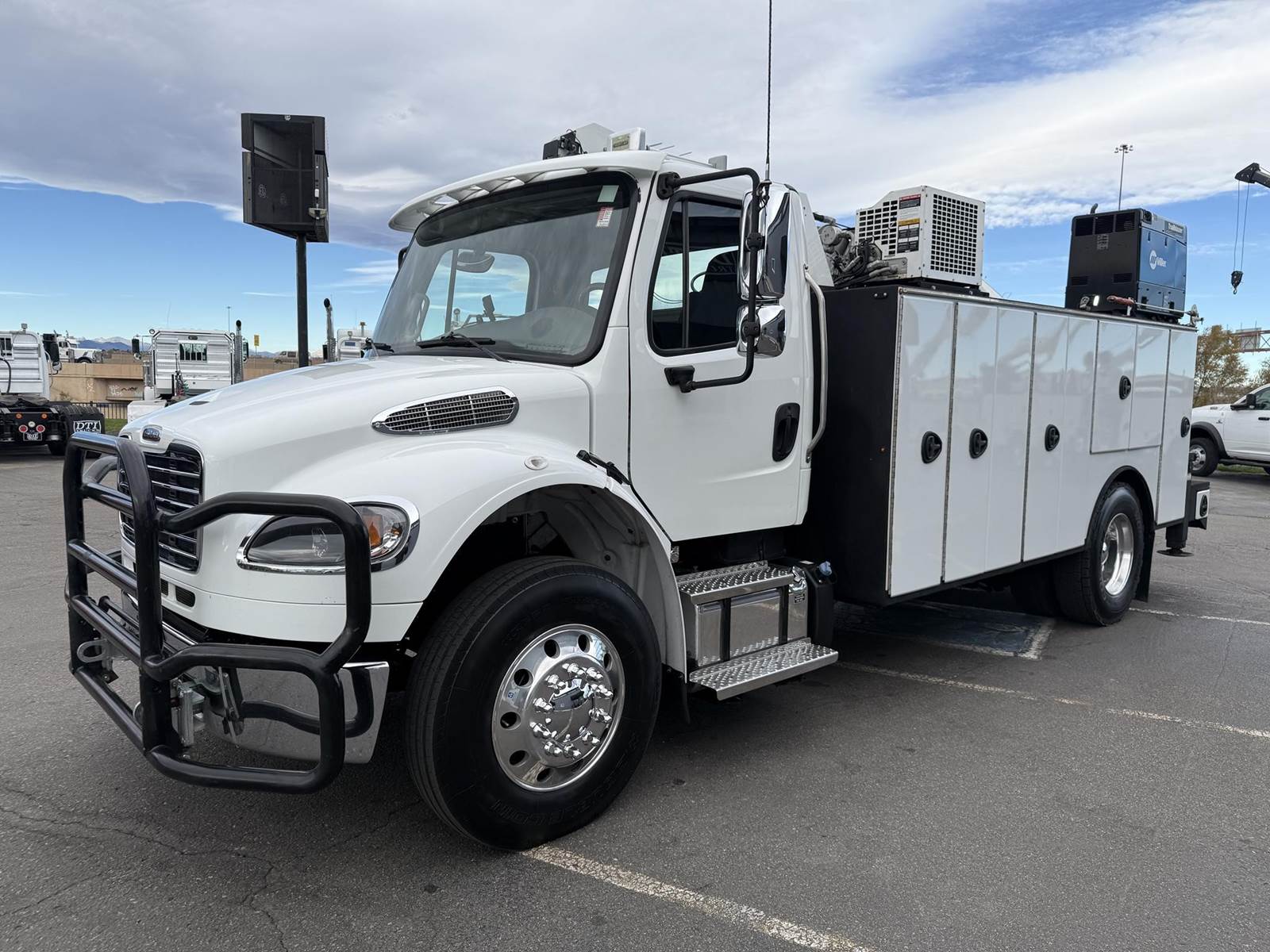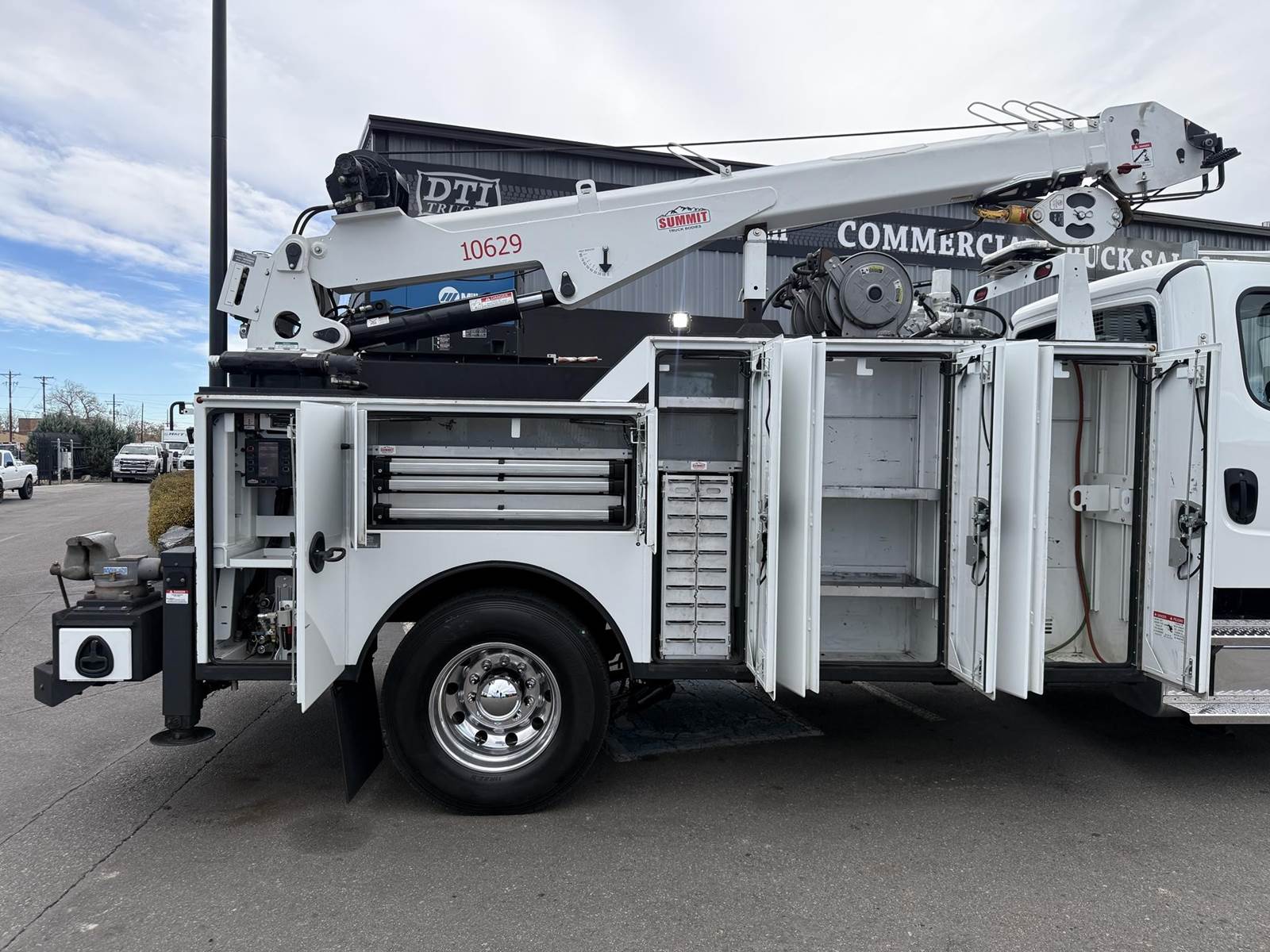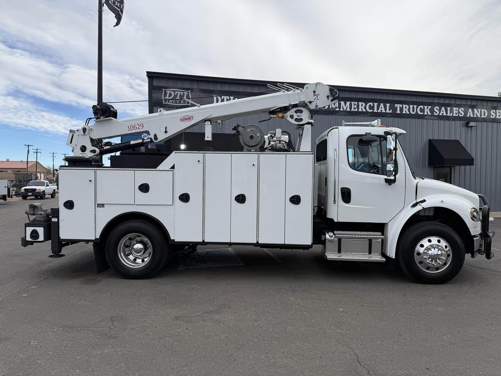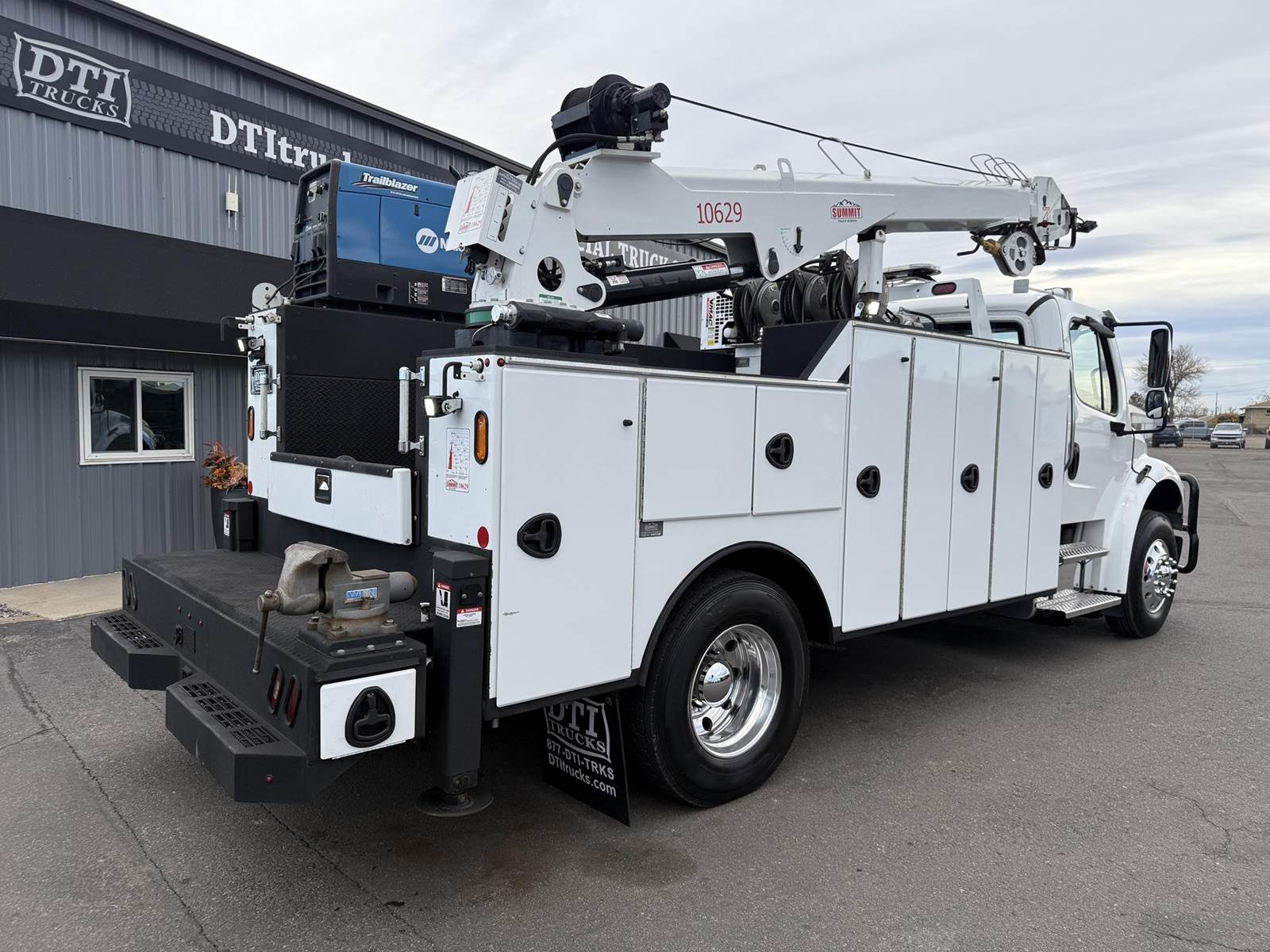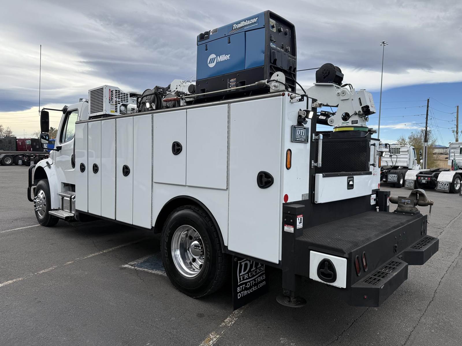 2022 Freightliner M2-106 Mechanics Truck, 8.9L Cummins L9 Diesel Engine, 350 HP, Engine Brake, Allison 3000 RDS 6 Speed Automatic Transmission, 137,641 ECM Verified Miles & 5,444 ECM Verified Engine Hours, 33K GVWR (12K Steer Axle, 21K Drive Axle), Air Ride Suspension With Dump Valve, 5.22 Axle Ratio, Diff Lock,194” Wheel Base, 127” CTA, 11R22.5 Tires All Mounted On Aluminum Wheels, Dual 50 Gallon Aluminum Diesel Fuel Tanks, Block Heater, CARB Compliant, Air Ride Cab, Air Ride Driver Seat, Bench Passenger Seat, A/C, Tilt & Telescoping Steering Wheel, Cruise Control, Bluetooth Radio, Power Windows & Locks, Power & Heated Mirrors, 14’ Summit Mechanics Body, (4) Drawer Packs, (1) Bolt Bin, Vented Oxy-Acetylene Cabinet With Hose Reel, Gang Locks, Summit 10629 Hydraulic Crane, 10,000 LB Max Capacity, 29’ Max Reach, (2) Boom Lights, Wireless Remote, Hydraulic Outriggers, VMAC H40 Hydraulic Air Compressor (40 CFM @ 100 PSI), Miller Trailblazer 325 Welder / Generator With Only 32 Hours, Pre-Wired For In Cab Inverter, Summit Lube Skid With All Products On Metered Reels, (1) 100 Gallon Waste Oil Tank With Diverter Valve, (1) 50 Gallon Product Tank, (1) 50 Gallon Antifreeze Tank, (1) Strobe Light, (6) LED Work Lights, 24” Work Bench Bumper With Vise, 2.5” Receiver Hitch, Battery Cutoff Switch. This Heavy Duty Freightliner Mechanics Truck Is Available At DTI Trucks In Denver, CO. Stock #17685D. Call Or Text Brent For More Information (303) > 598 > 1923