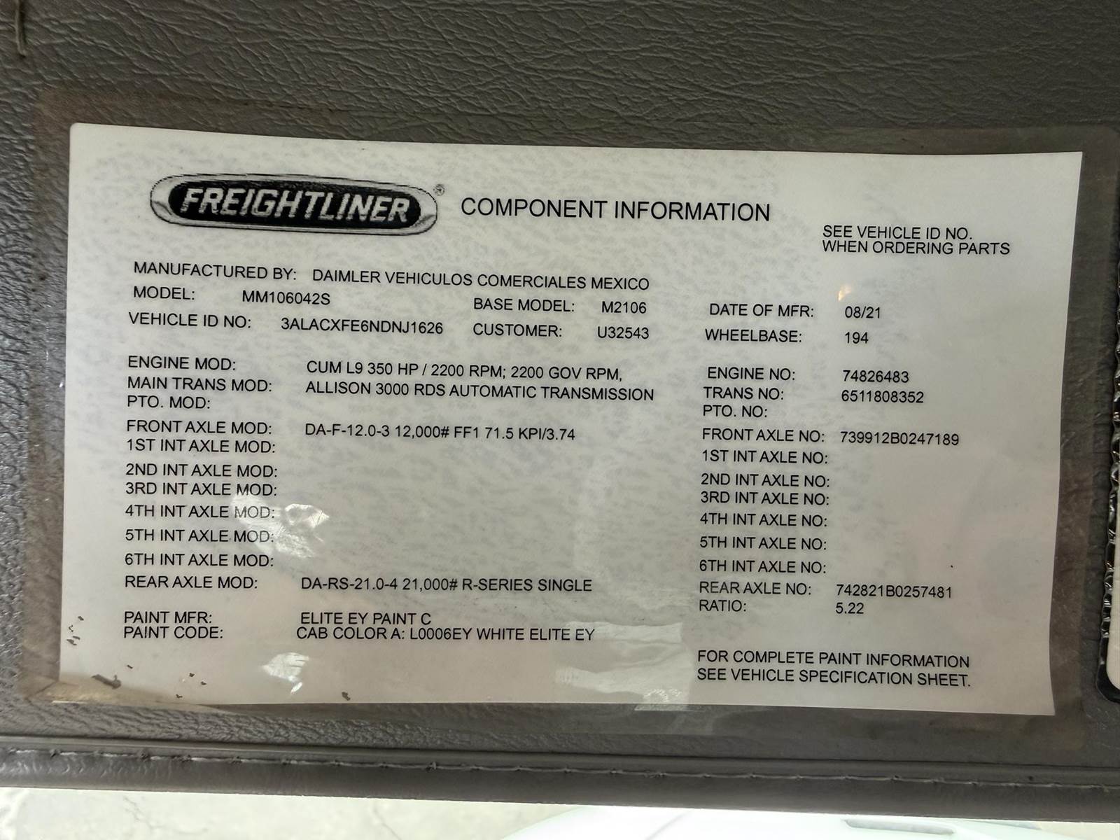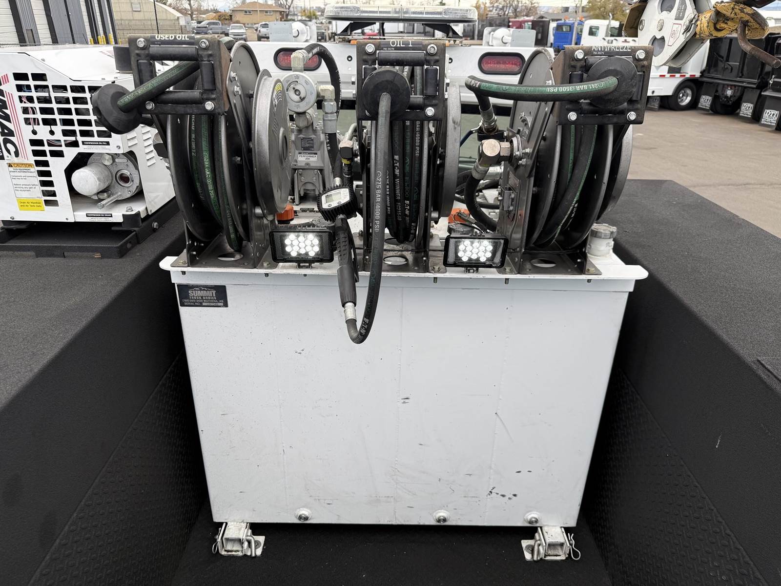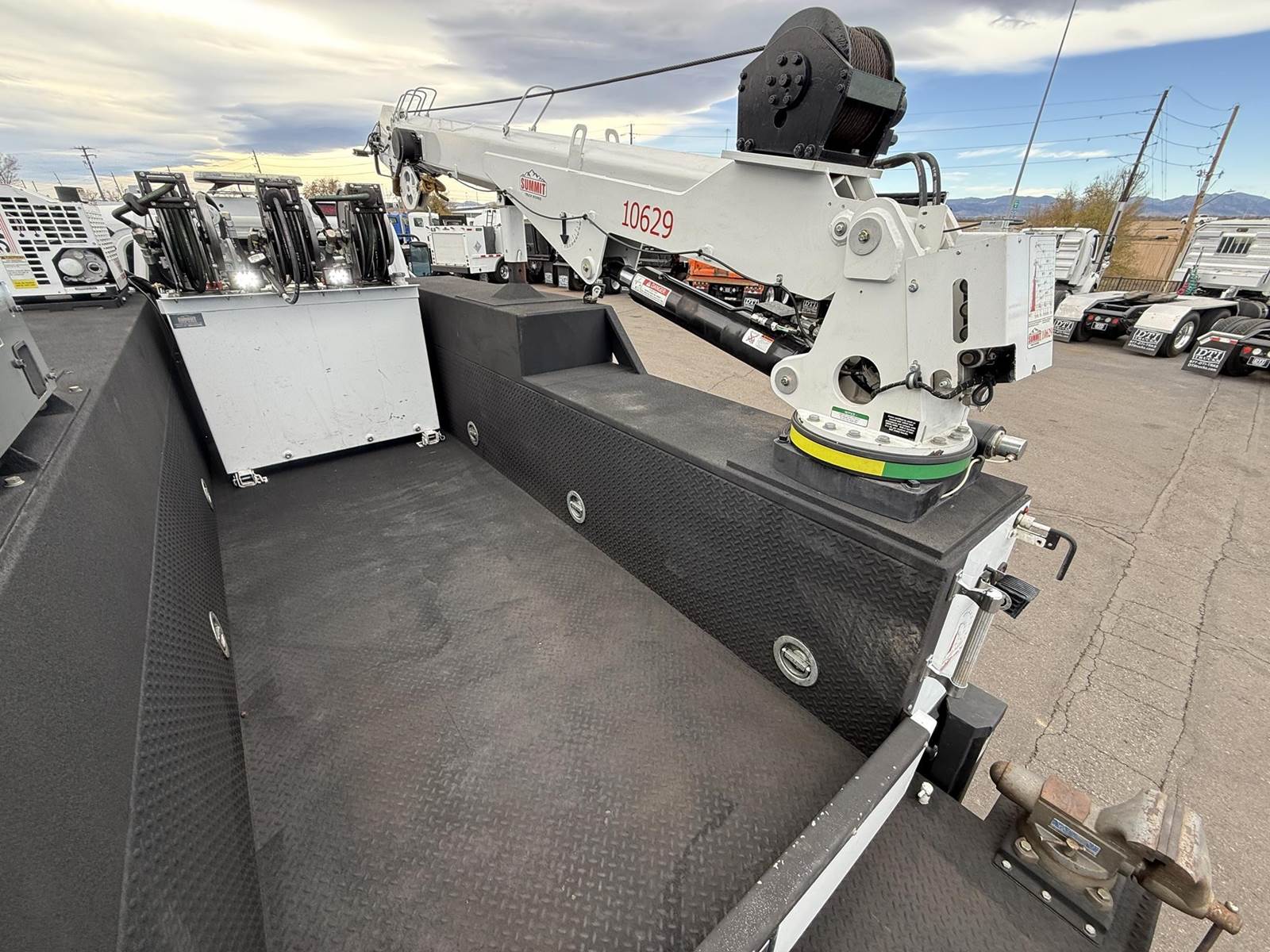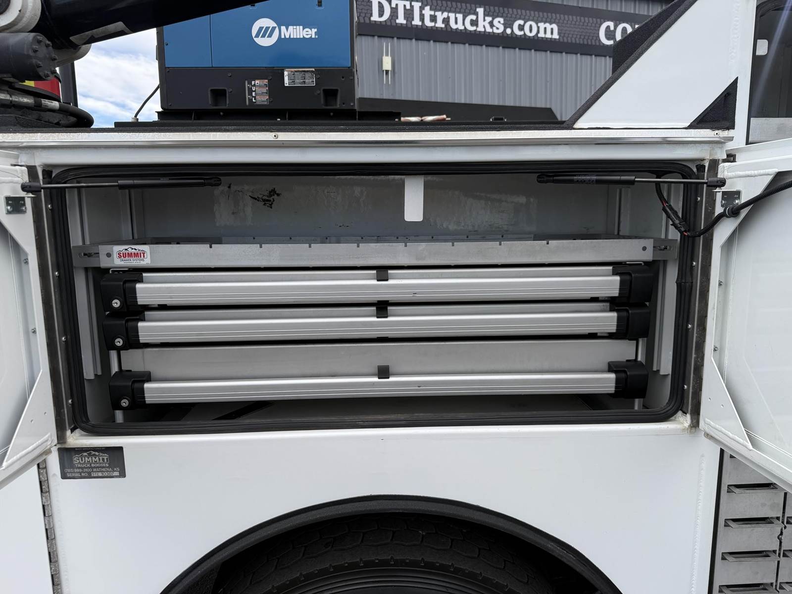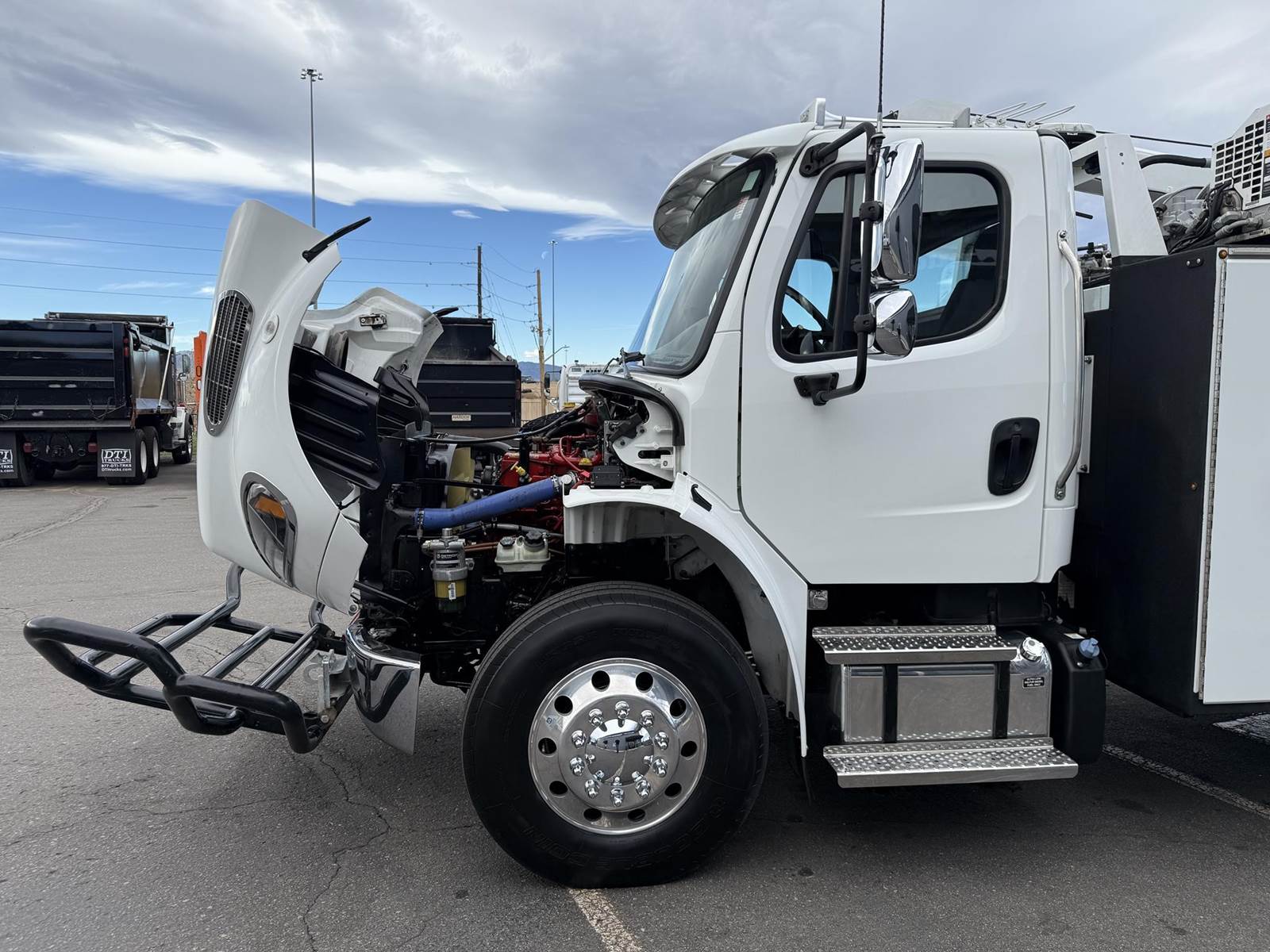 2022 Freightliner M2-106 Mechanics Truck, 8.9L Cummins L9 Diesel Engine, 350 HP, Engine Brake, Allison 3000 RDS 6 Speed Automatic Transmission, 137,641 ECM Verified Miles & 5,444 ECM Verified Engine Hours, 33K GVWR (12K Steer Axle, 21K Drive Axle), Air Ride Suspension With Dump Valve, 5.22 Axle Ratio, Diff Lock,194” Wheel Base, 127” CTA, 11R22.5 Tires All Mounted On Aluminum Wheels, Dual 50 Gallon Aluminum Diesel Fuel Tanks, Block Heater, CARB Compliant, Air Ride Cab, Air Ride Driver Seat, Bench Passenger Seat, A/C, Tilt & Telescoping Steering Wheel, Cruise Control, Bluetooth Radio, Power Windows & Locks, Power & Heated Mirrors, 14’ Summit Mechanics Body, (4) Drawer Packs, (1) Bolt Bin, Vented Oxy-Acetylene Cabinet With Hose Reel, Gang Locks, Summit 10629 Hydraulic Crane, 10,000 LB Max Capacity, 29’ Max Reach, (2) Boom Lights, Wireless Remote, Hydraulic Outriggers, VMAC H40 Hydraulic Air Compressor (40 CFM @ 100 PSI), Miller Trailblazer 325 Welder / Generator With Only 32 Hours, Pre-Wired For In Cab Inverter, Summit Lube Skid With All Products On Metered Reels, (1) 100 Gallon Waste Oil Tank With Diverter Valve, (1) 50 Gallon Product Tank, (1) 50 Gallon Antifreeze Tank, (1) Strobe Light, (6) LED Work Lights, 24” Work Bench Bumper With Vise, 2.5” Receiver Hitch, Battery Cutoff Switch. This Heavy Duty Freightliner Mechanics Truck Is Available At DTI Trucks In Denver, CO. Stock #17685D. Call Or Text Brent For More Information (303) > 598 > 1923