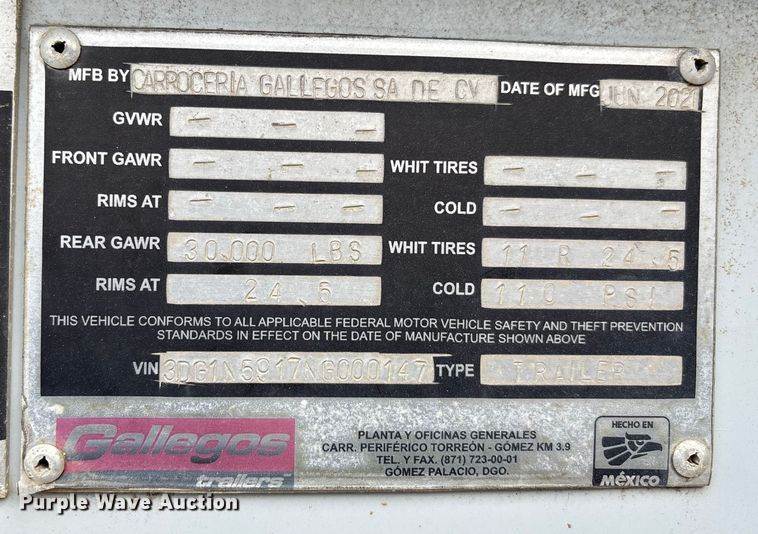 2022 Gallegos pneumatic dry bulk trailer, VIN: 3DG1N5919NG000148, Dimensions, Overall, Length: 60', Width: 134", Features, Tank type:...