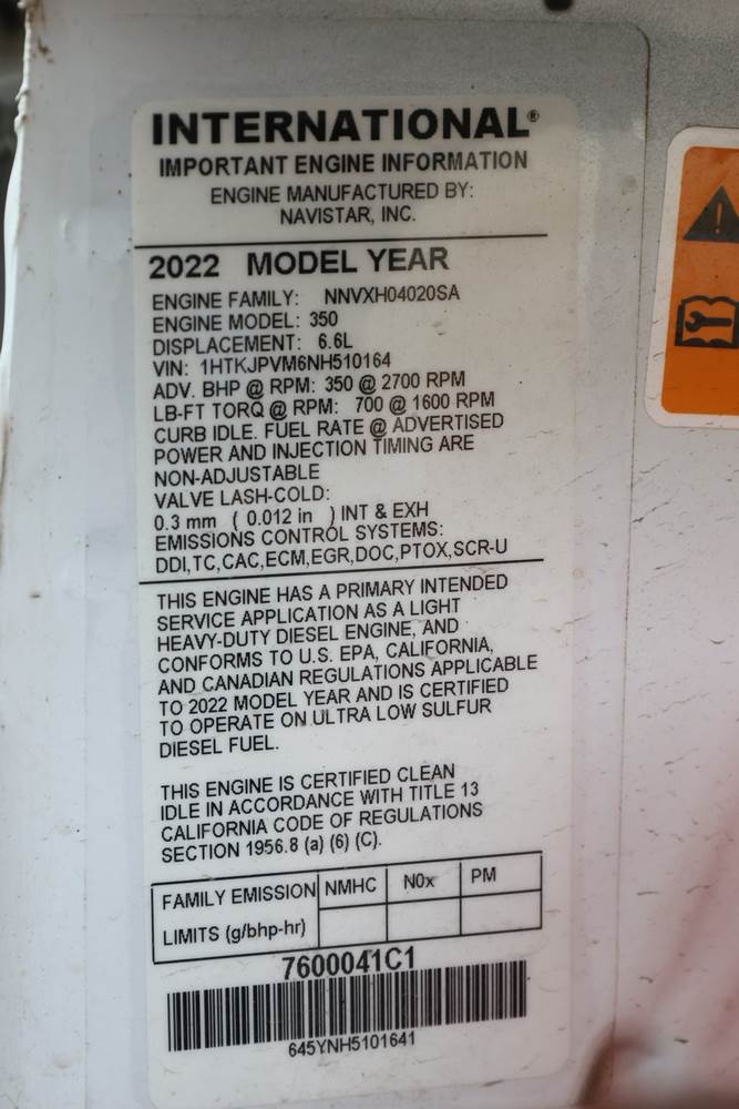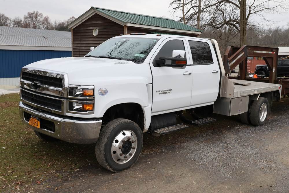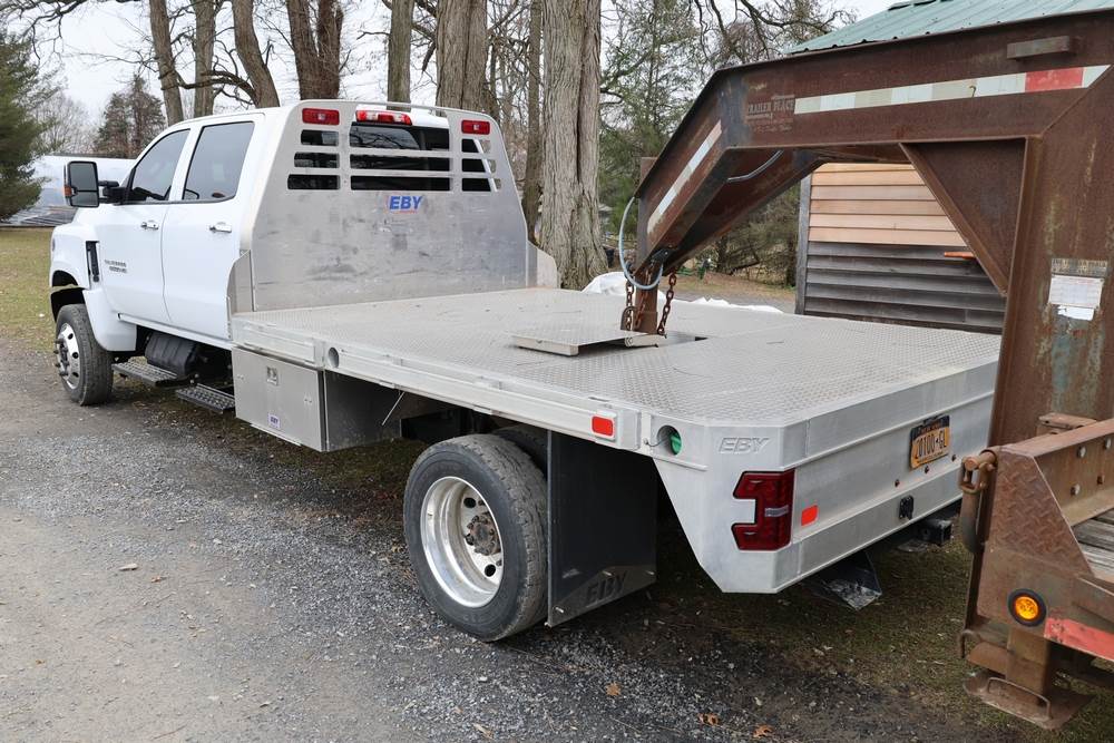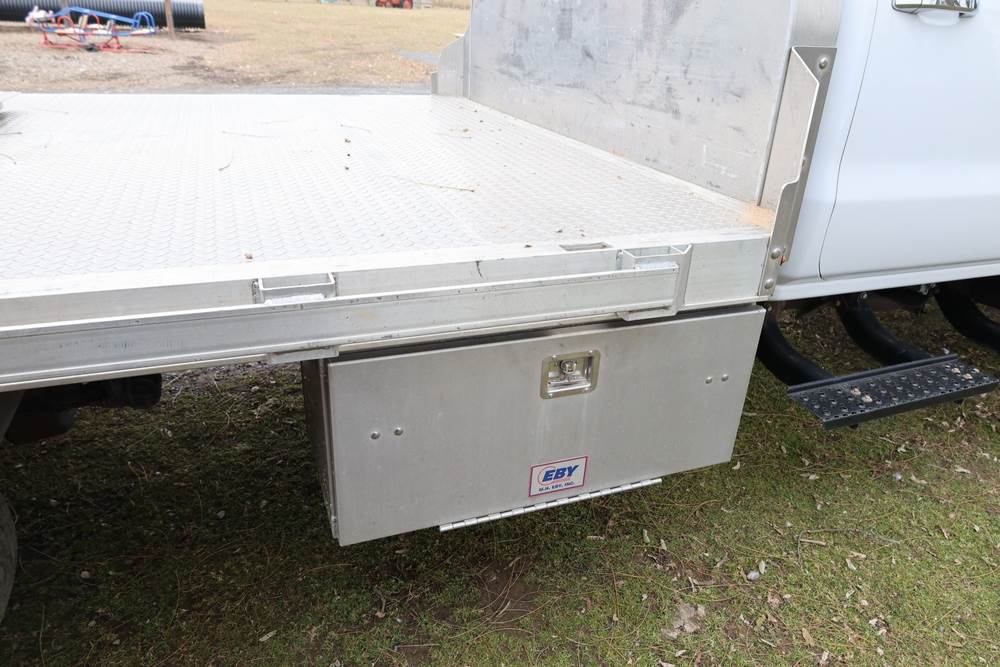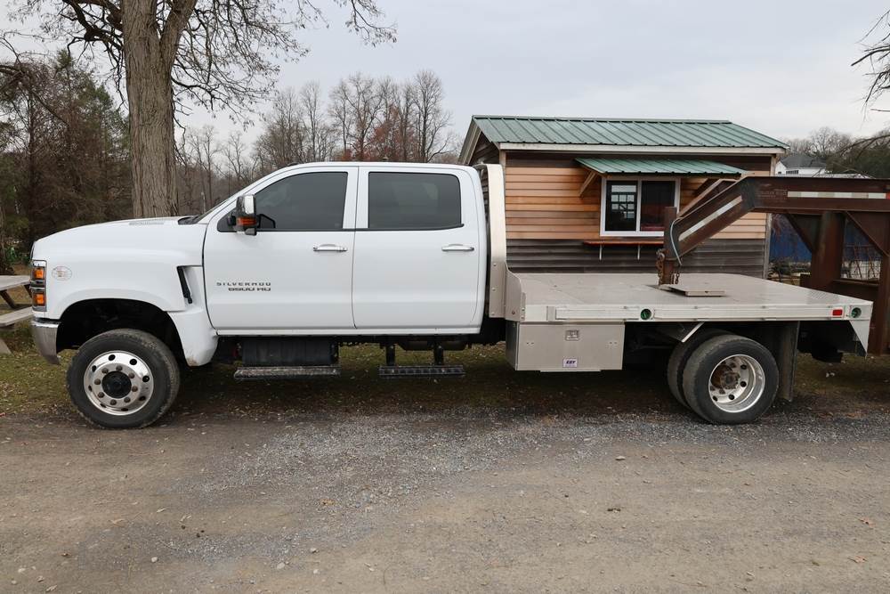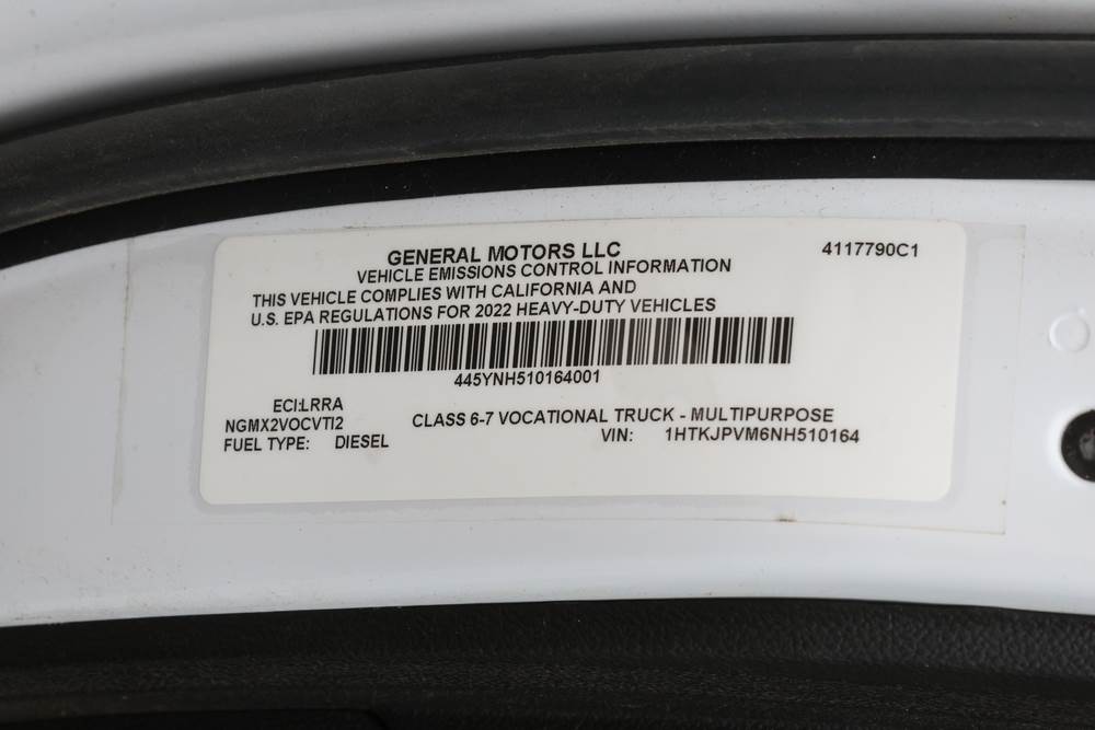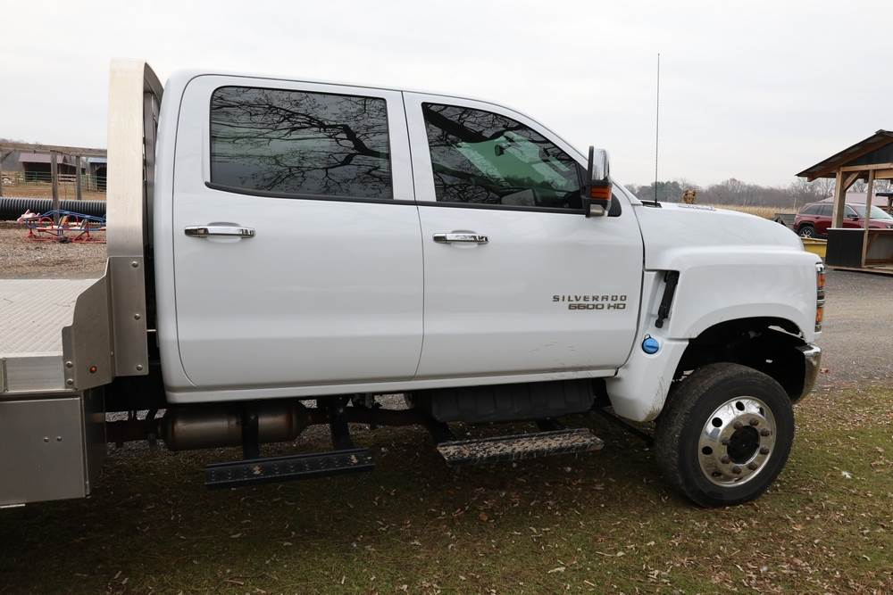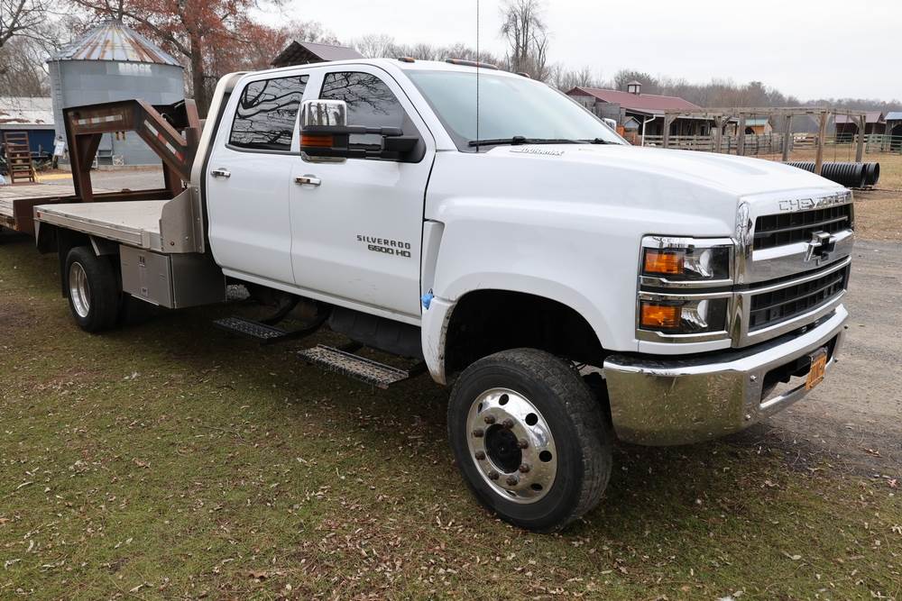 2022 International GM515 crew-cab flatbed truck. VIN: 1HTKJPVM6NH510164. Engine: 6.6L diesel, automatic transmission, 4WD. Odometer reading: 33617 miles. Features include dual rear wheels, aluminum Eby flatbed, running boards, touchscreen audio display. Runs and drives. Title and key available. NOTE: This item has a lien which will be satisfied upon payment for purchase in the auction. The vehicle(s) listed in this event will have the lien and title released upon payment directly to the secured creditor once paid for by the purchaser.