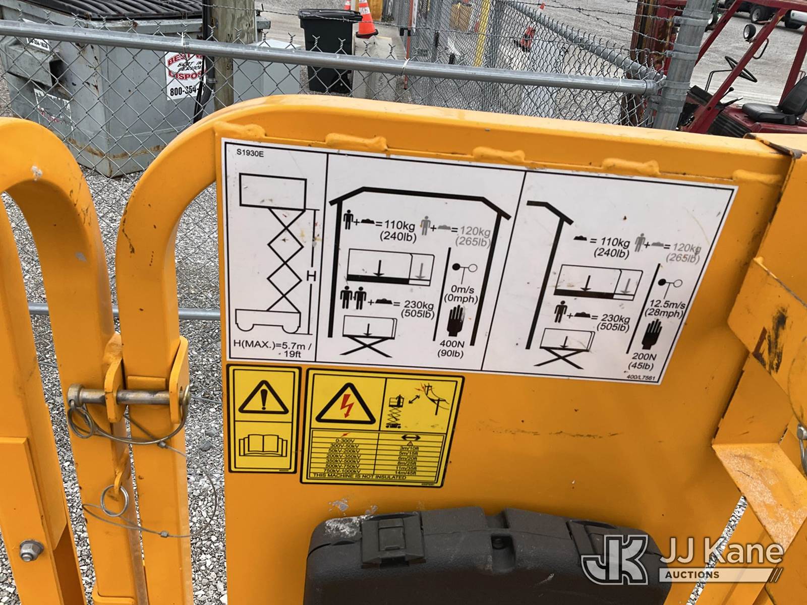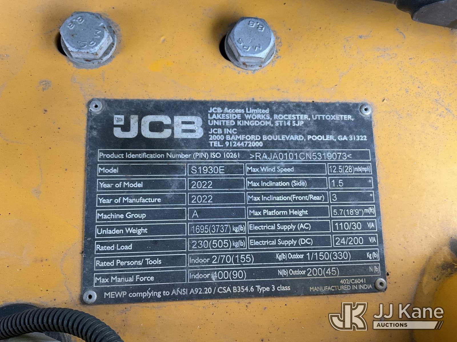 2022 JCB S1930E Self-Propelled Scissor Lift, s/n RAJA0101CN5319073, battery powered, with 19 ft. platform height, (Runs & Operates) (Reads 4 hours) NOTE: This unit is being sold AS IS/WHERE IS via Timed Auction and is located in Verona, KY. Inspection & preview days for this unit are the 2 business days prior to the first day of items closing for this auction, item is located at 2841 Verona-Mudlick Rd Ste B Verona, KY 41092 and hours of operations are 8a-4p. For pre-sale questions, please contact Office Staff @ (502) 612-5080. Auctioneer Michael Whitebread / License # 256617. (Buyer is responsible for removal. Assistance by consignor or JJ Kane Auctions is not assured.)