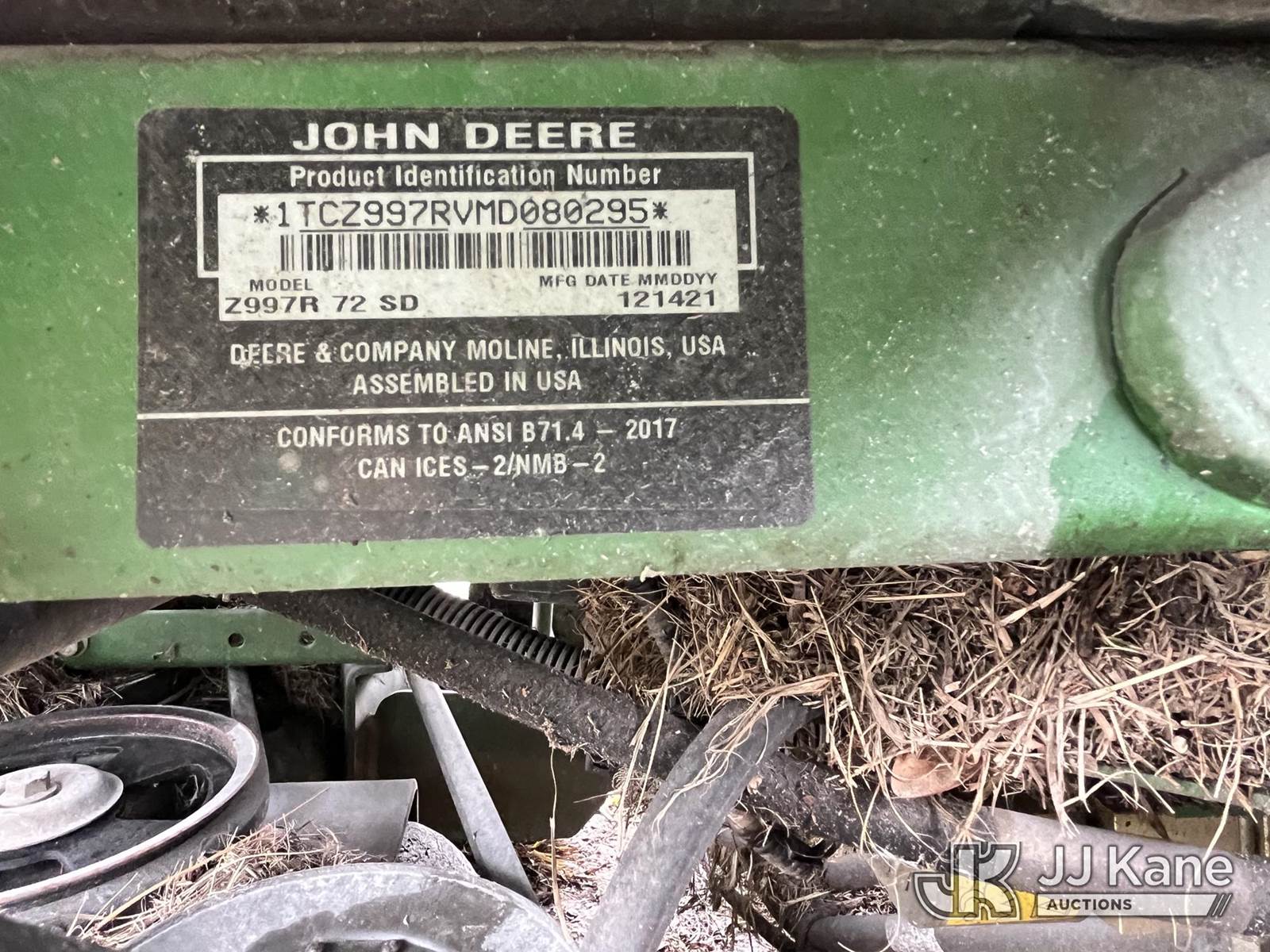 2022 John Deere Z997R Zero Turn Riding Mower, s/n 1TCZ997RVMD080295, diesel, with 72 in. mower deck, Pinellas County BOCC Unit (Runs, Moves) (Parking Break INOP, Runs Rough, Body Damage, Tire Damage) (Reads 1,960 hours) NOTE: This unit is being sold AS IS/WHERE IS via Timed Auction and is located in Thonotosassa, FL. Inspection & preview days for this unit are the 2 business days prior to the first day of items closing for this auction, item is located at 11720 N US 301 Thonotosassa, Fl 33592 and hours of operations are 8a-4p. For pre-sale questions, please contact Office Staff @ (813) 986-2485. (Buyer is responsible for removal. Assistance by consignor or JJ Kane Auctions is not assured.)