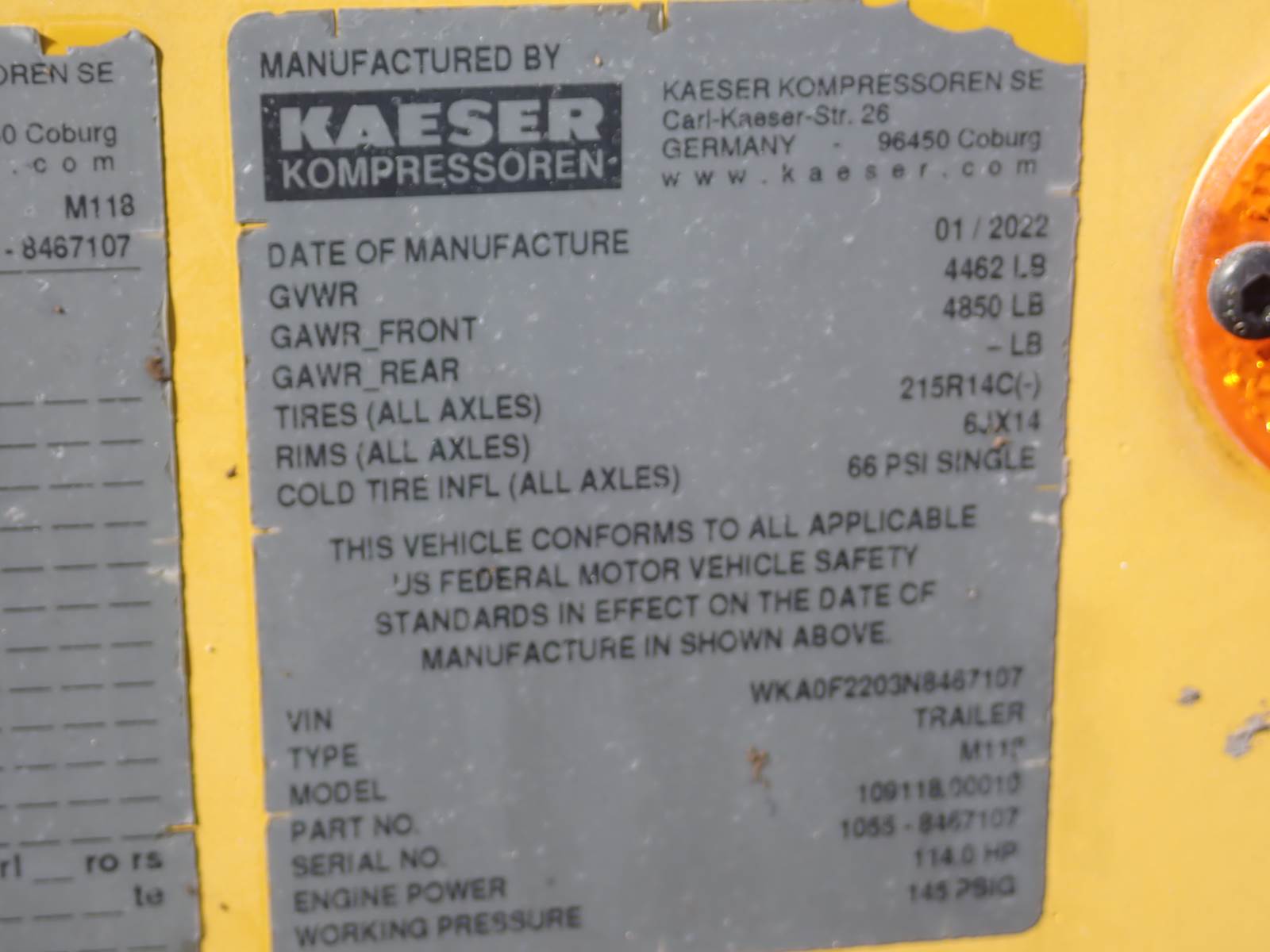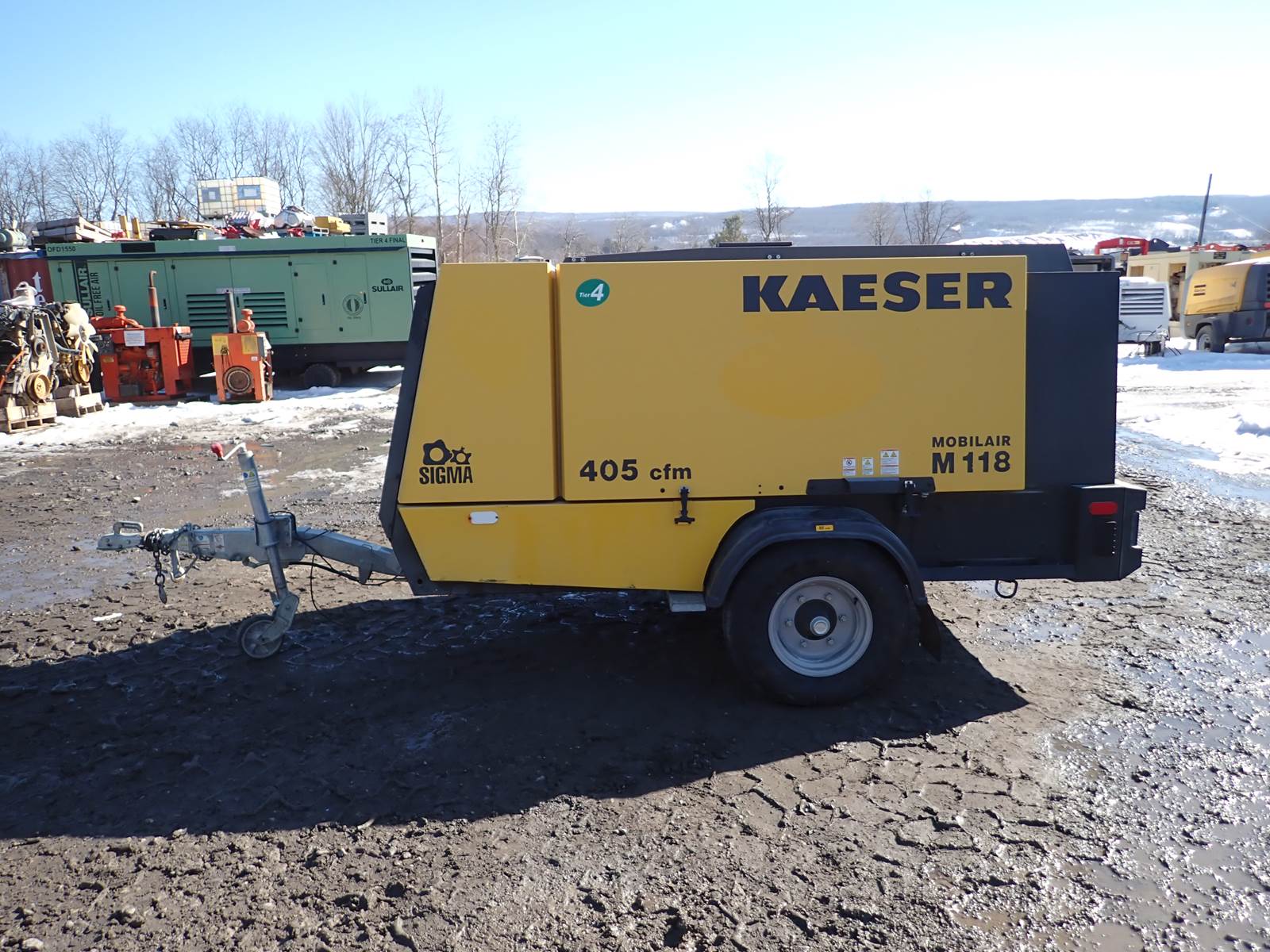 2022 Kaeser M118 Mobilair air compressor, 405 CFM output, 87-145 PSI adjustable pressure rating, rated 405 CFM at 100 PSI or 360 CFM at 145 PSI, Deutz diesel engine, tier 4 final emissions, 114 HP rating, trailer mounted, towable, 1432 hours. EXCELLENT RUNNING COMPRESSOR, SEE VIDEO. EXTREMELY LATE MODEL, BEST PRICE YOU'LL SEE ANYWHERE ON A UNIT WITH THESE HOURS !