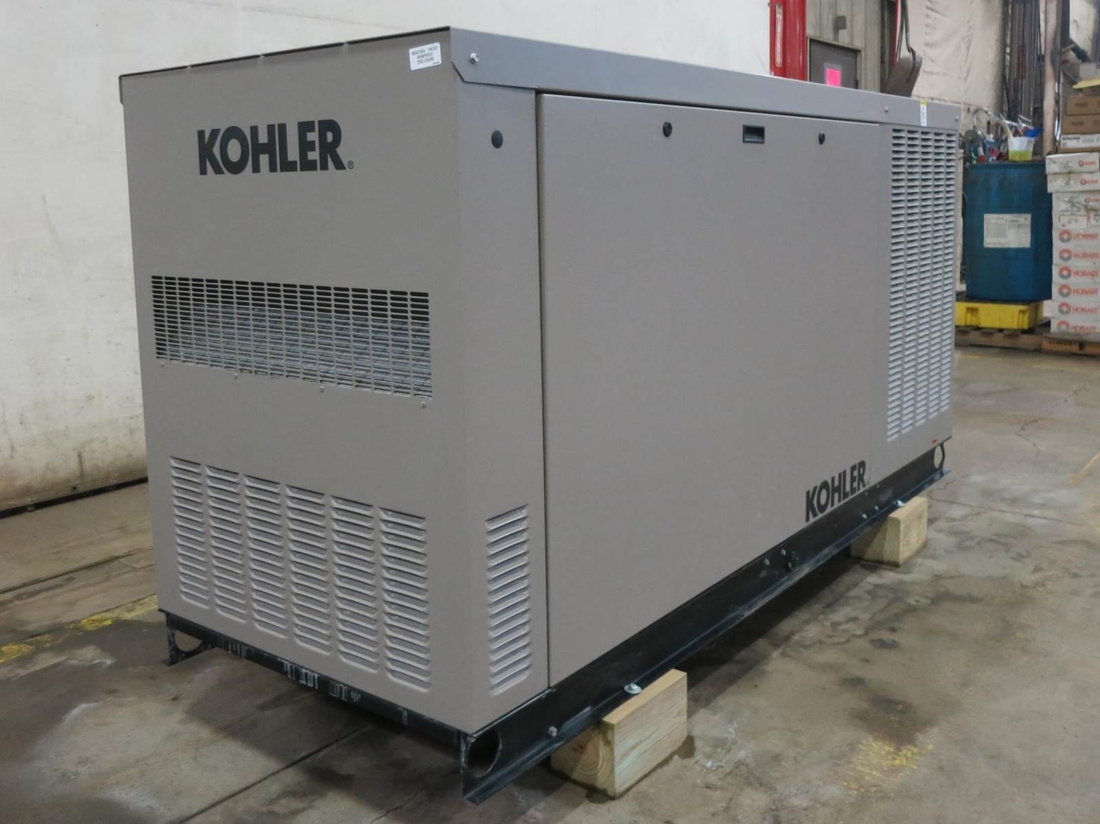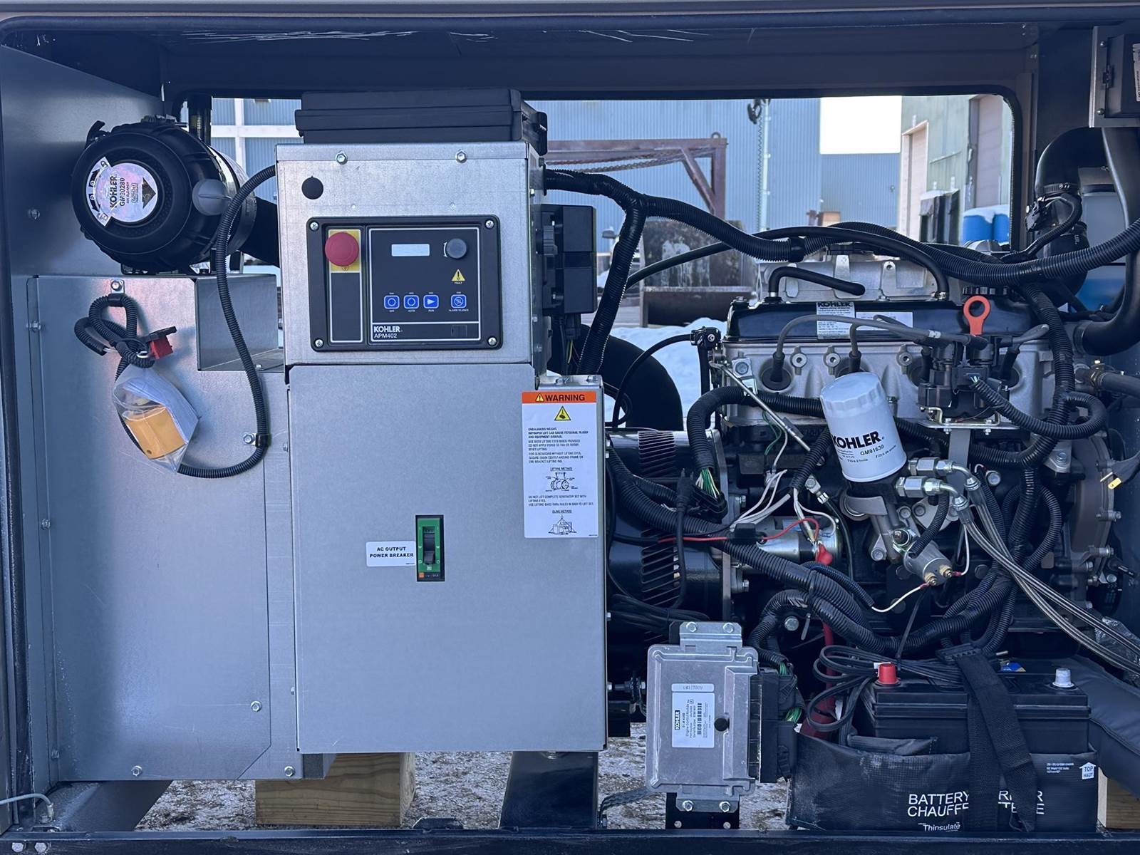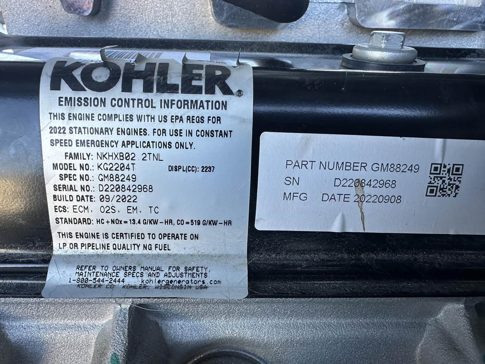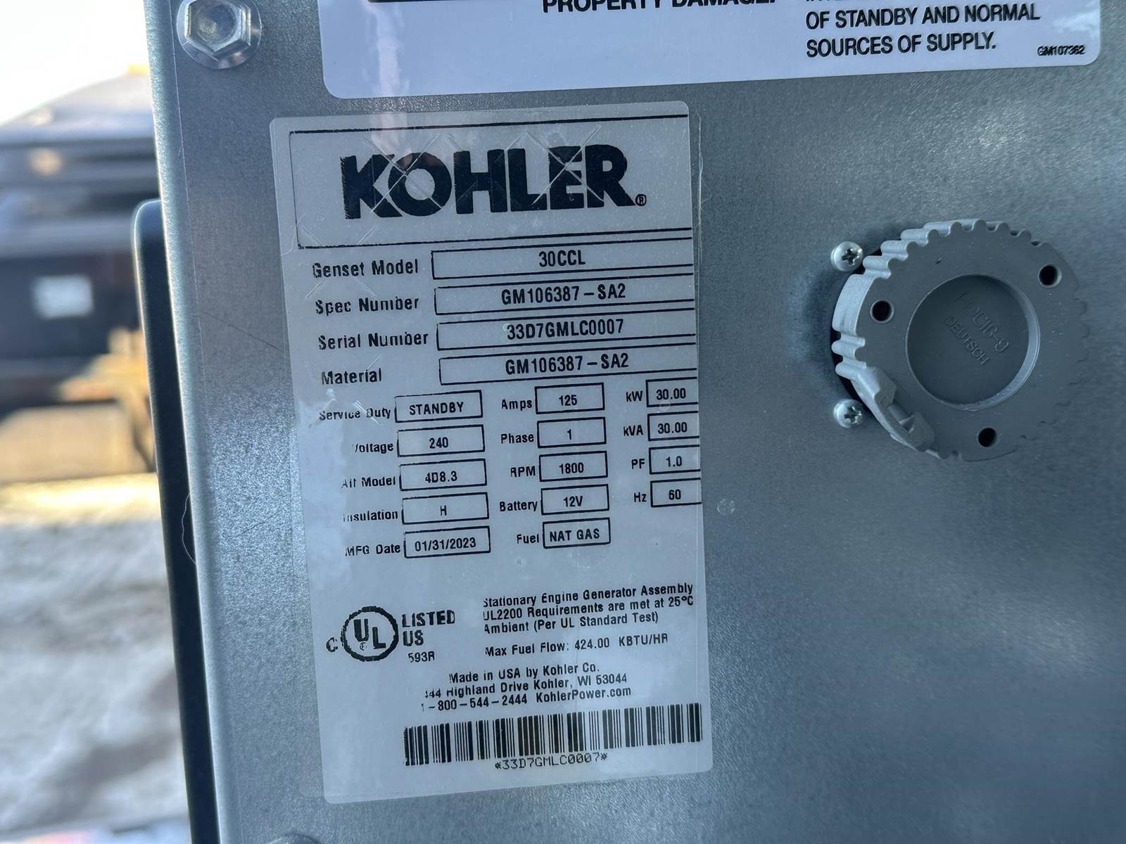 New surplus Kohler 30 kW standby natural gas / propane generator model 30CCL, SN-33D7GMKP0007. Kohler KG2204T 2.2L engine rated 47 HP at 1800 RPM, SN-D220842968, EPA certified. 1/60/120/240V, single phase non-reconnectable to other voltages. 125 Amp main-line circuit breaker. PMG permanent magnet generator. UL2200 listed. APM402 controller. Battery charger. Coolant heater. Aluminum sound attenuated enclosure. 0 Hrs. Year 2022. Overall dimensions 30W x 90L x 51H on 6H blocks, 1500 lbs. FOB Waukesha, WI