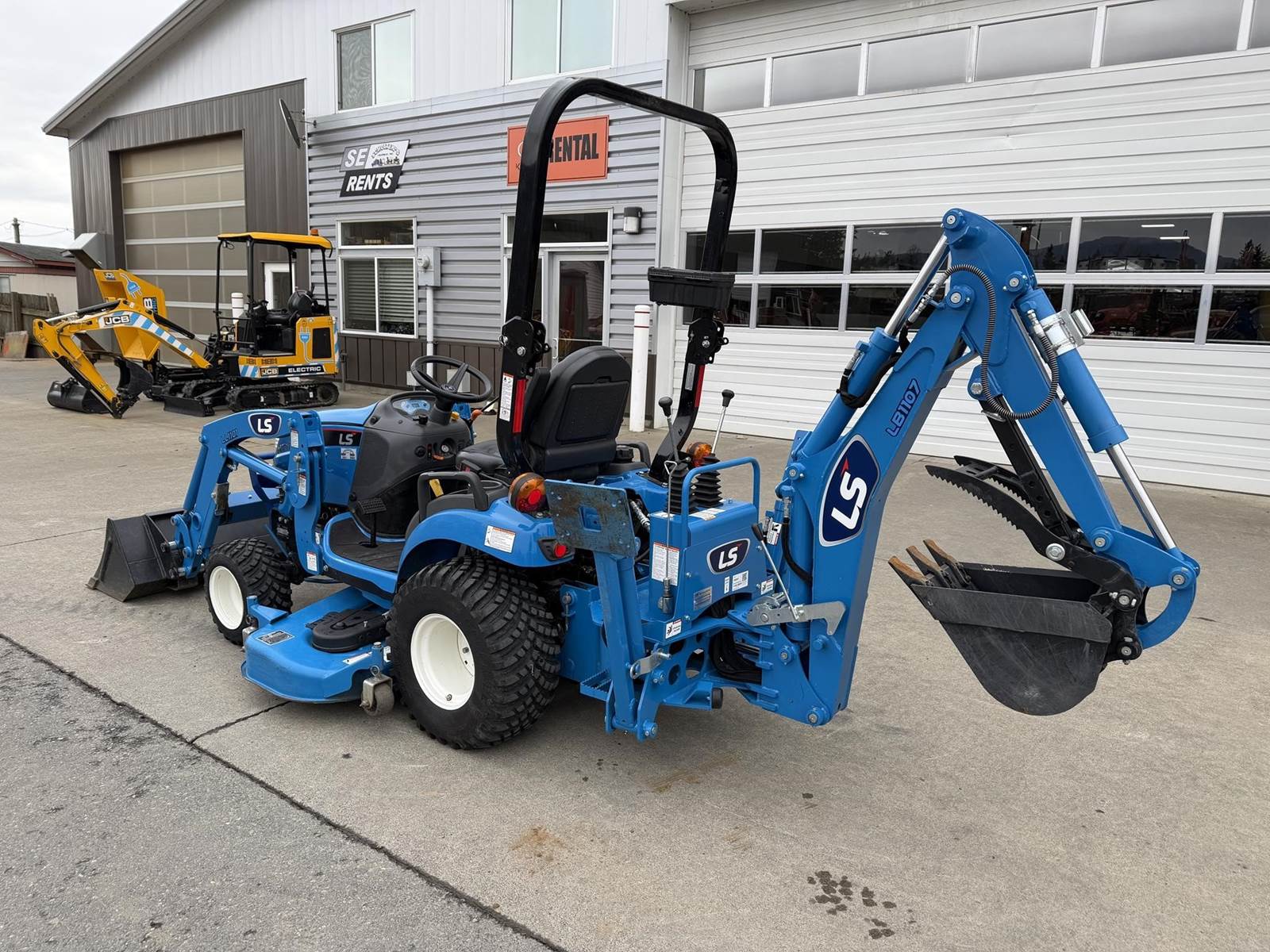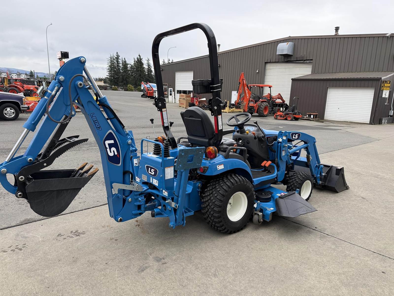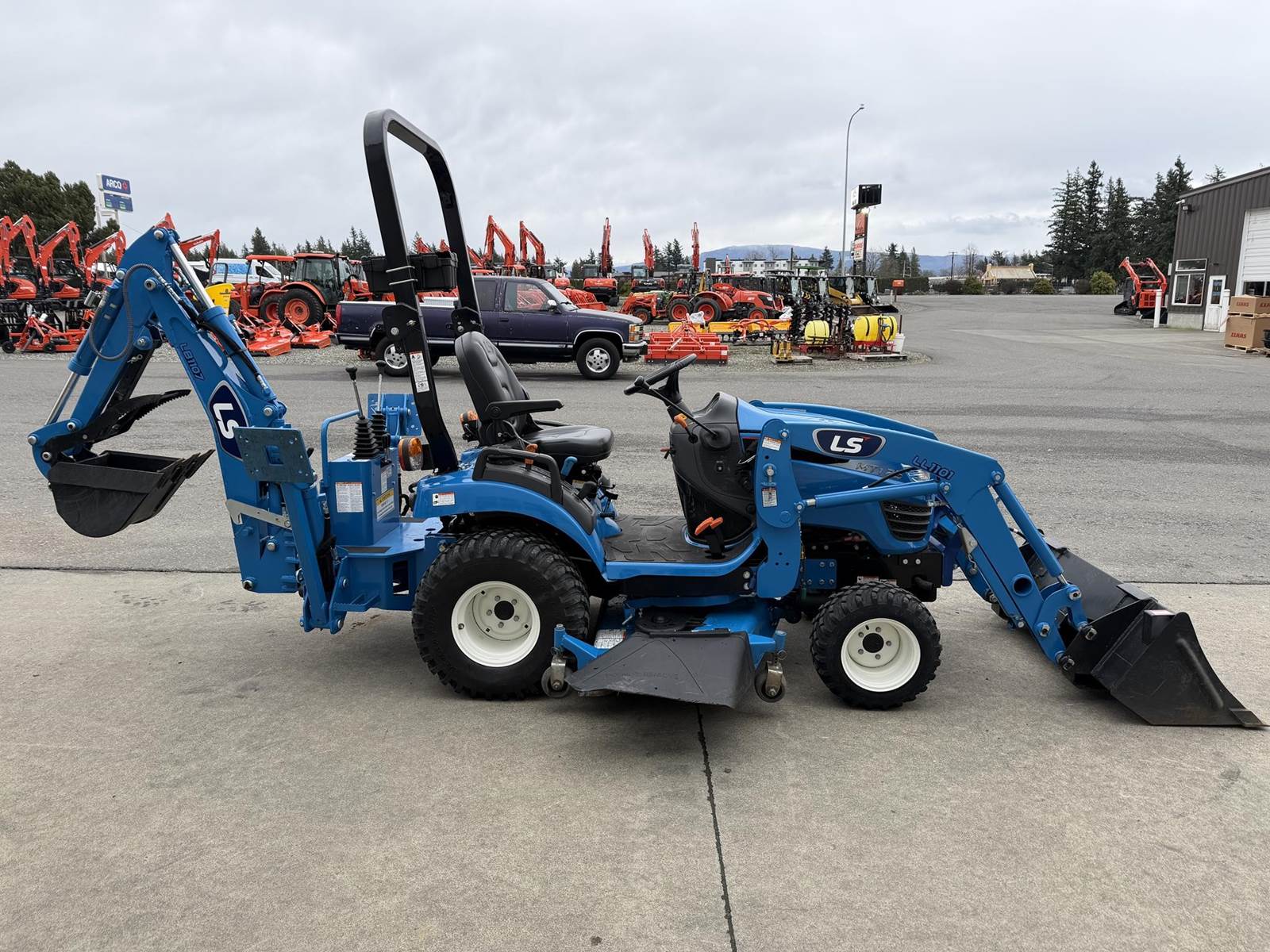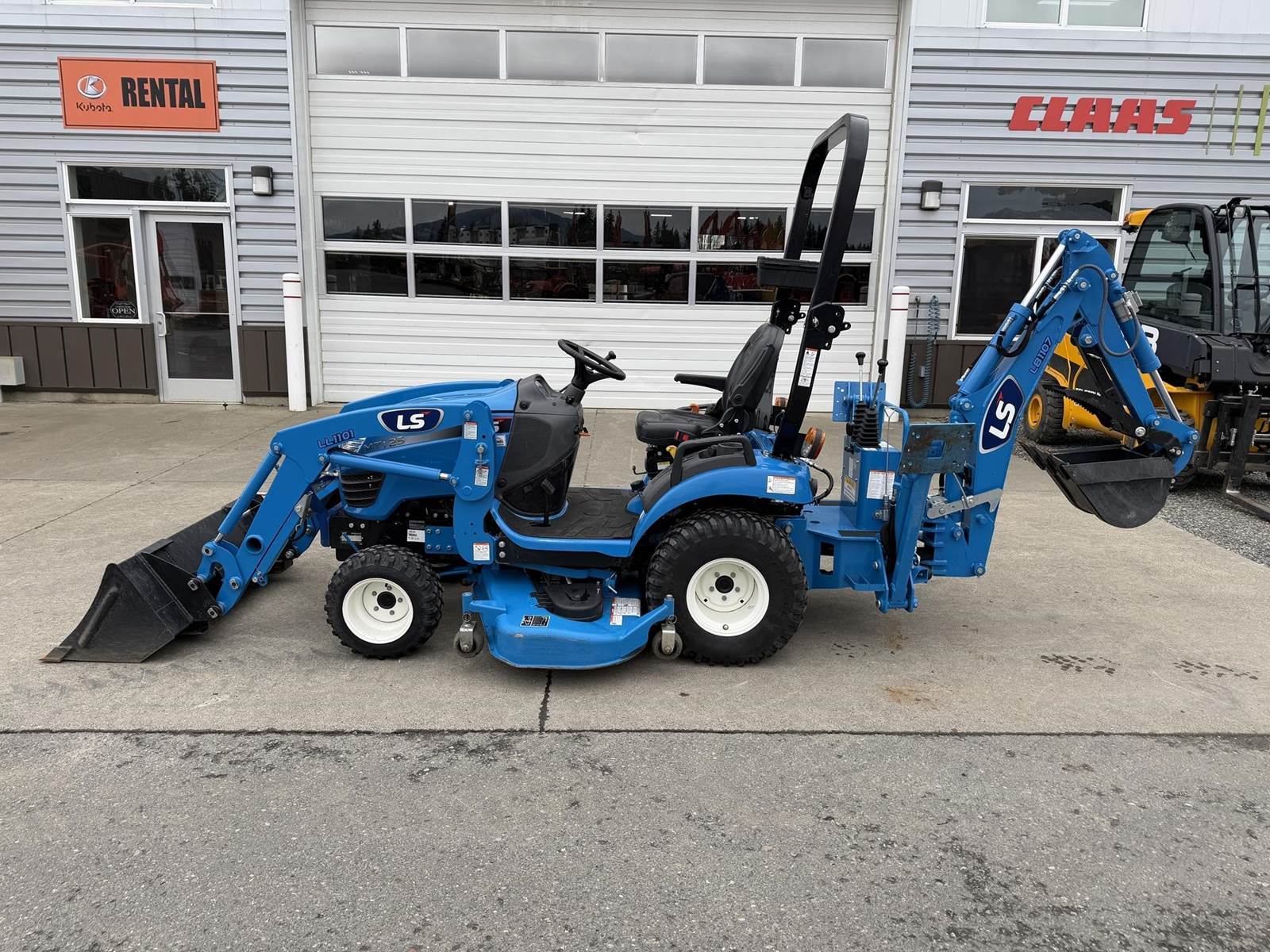 2022 LS MT125 Sub-Compact Tractor - Yanmar diesel engine, two-speed hydrostatic transmission, LL1101 loader with pin-on bucket, LM1160 mid-mount mower, LB1107 backhoe with trenching bucket and mechanical thumb, 4WD, rear 3Pt. linkage, mid and rear PTO and two-post foldable ROPS. Just 172 hours!