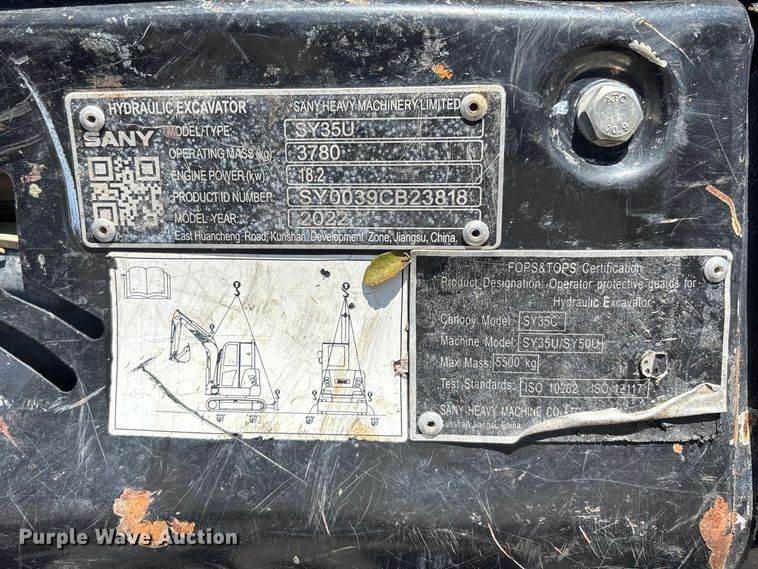 Sany SY35U mini excavator, Hours: 1,617 on meter, Engine, Cylinders: 3, Fuel type: Diesel, Transmission, Hydrostatic, Operators station,...