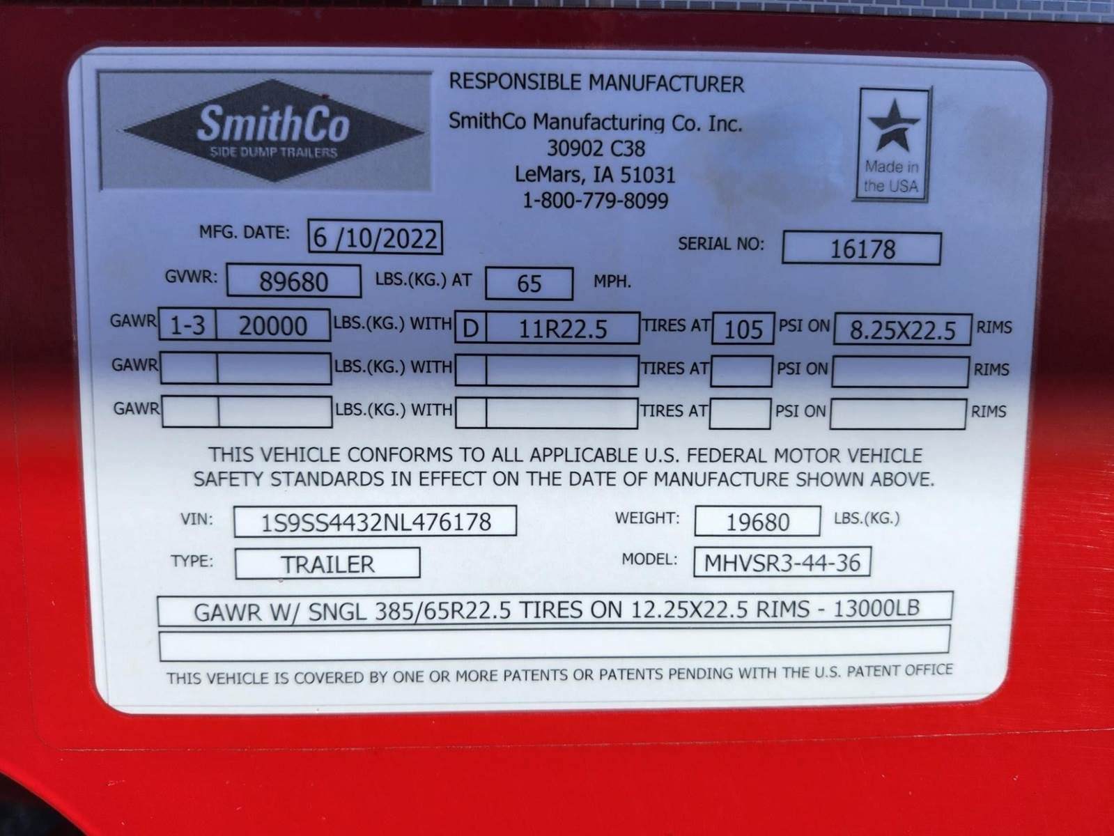 2022 SmithCo MHVSR3-44-36 Side Dump Trailer