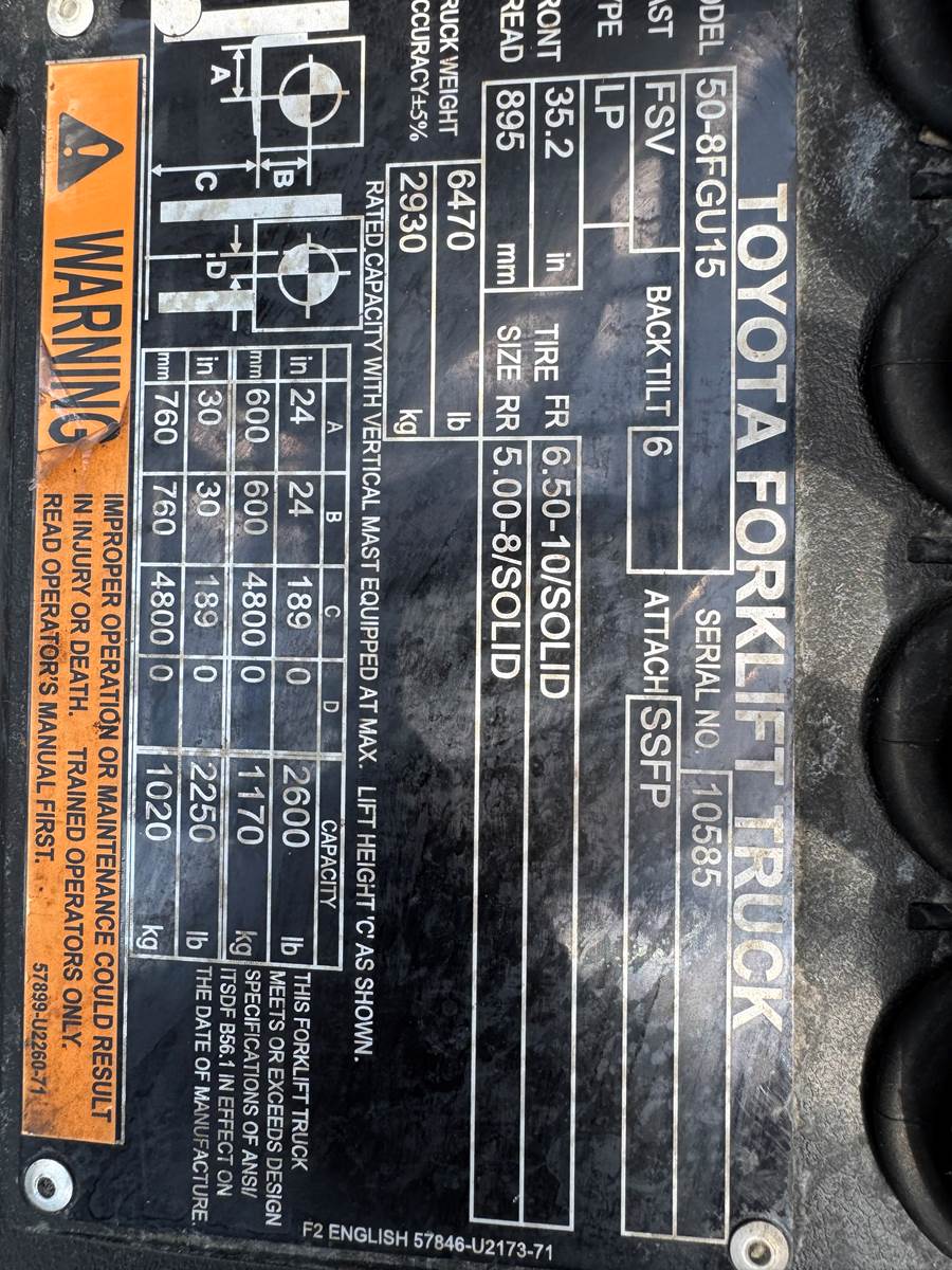 2022 Toyota 50-8FGU15, S/N 10585, 82"/189" Three Stage Mast, 3000lb Cap, Pneumatic tires, SSFP, 42" forks, LPG, 2356Hours, running and operating.