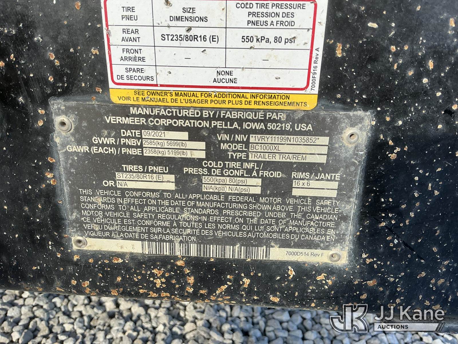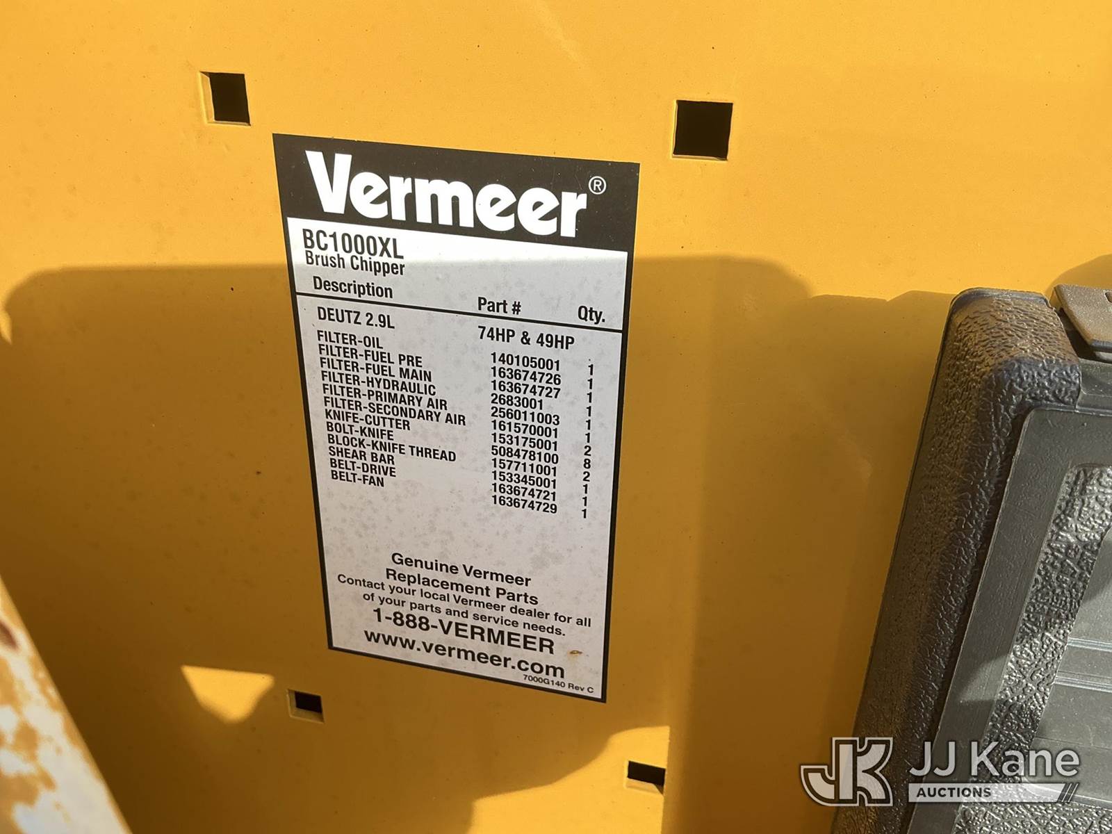 2022 Vermeer BC1000XL Chipper (12in Disc), s/n 1VRY11199N1035852, Deutz diesel, trailer mtd. (Runs) (Oil Pressure Warning & Shuts Off Soon After Starting, No Key, Body Damage) (Not Titled) (Reads 234 hours) NOTE: This unit is being sold AS IS/WHERE IS via Timed Auction and is located in Fort Wayne, IN. For more information & removal arrangements please contact Office Staff @ (260) 450-9822. Load out by appointment only, Buyer/Hauler must present copy of paid invoice upon arrival. Purchaser acknowledges ALL lots must be removed within (10) business days of Auction, or a storage fee may be incurred. For load out and pick up information, please reference the hauler sheet sent out after purchase. (Buyer is responsible for removal. Assistance by consignor or JJ Kane Auctioneers is not assured.)