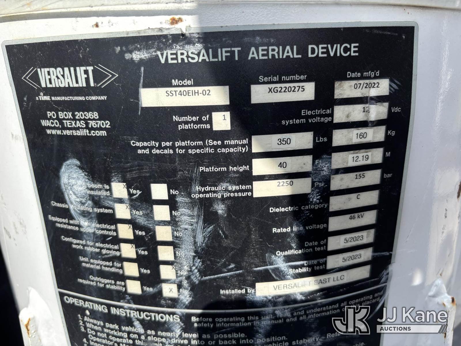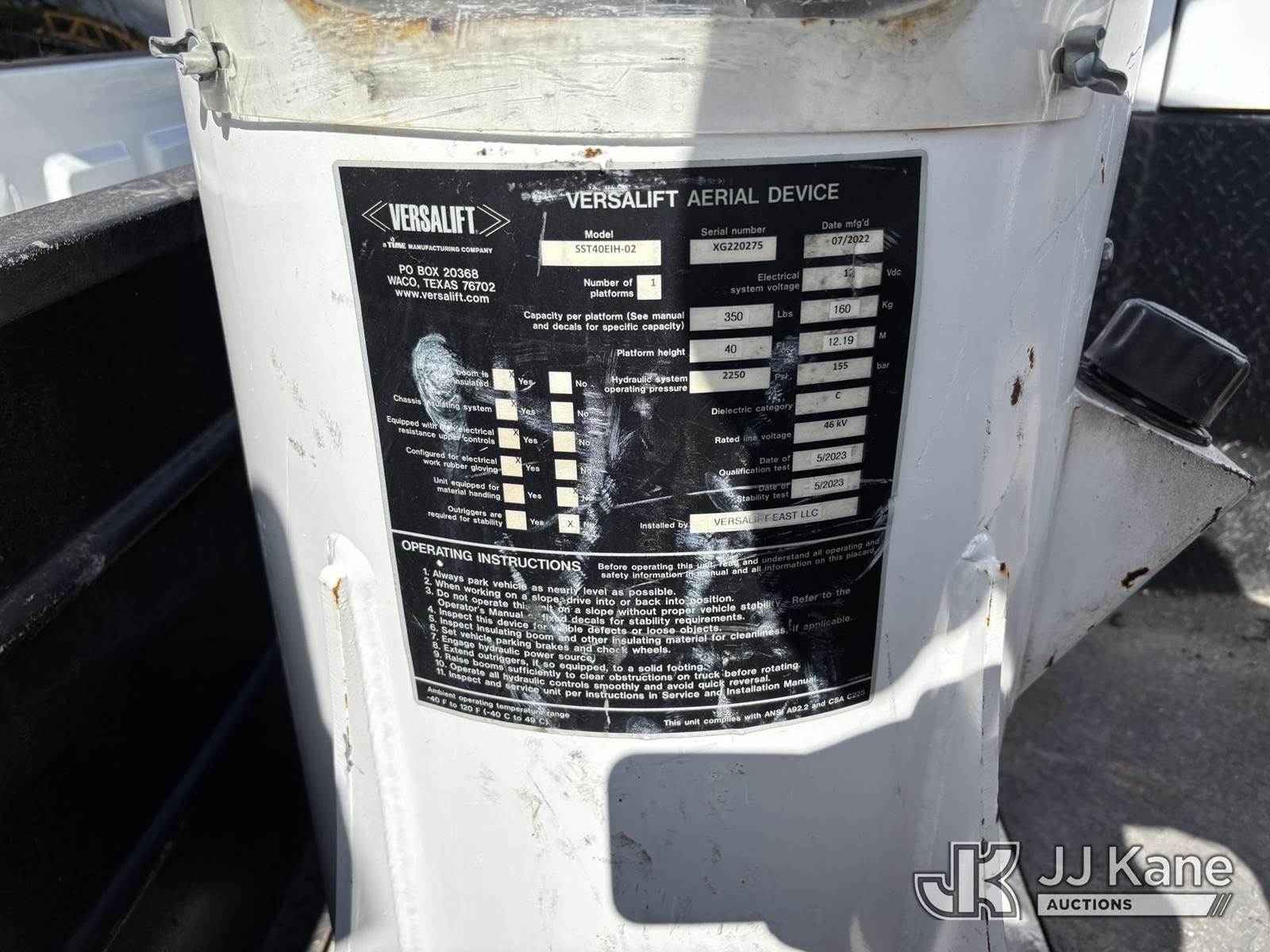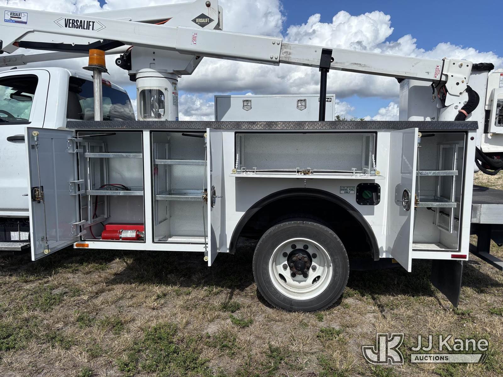 Versalift SST40EIH-02, 45 ft, Articulating & Telescopic Bucket Truck s/n XG220275, with single-man bucket, mounted behind cab on 2022 Chevrolet Silverado GM515 Service Truck, 6.6L diesel, Auto, A/C, (27,398 miles) (Runs, Moves, & Operates) (Body & Paint Damage) (FL Residents Purchasing Titled Items – tax, title & registration fees will be collected at the maximum rate of $400.00 under 25,999 and $800.00 for Over 26,000 and $250.00 trailers – Proof of insurance is mandatory; Out of State Residents Purchasing Title Items – tax will be collected based upon your state rate.) This is a Titled Item NOTE: This unit is being sold AS IS/WHERE IS via Timed Auction and is located in Westlake, FL. Inspection & preview days for this unit are the 2 business days prior to the first day of items closing for this auction, item is located at 4003 Seminole Pratt Whitney Rd Westlake, FL 33470 and hours of operations are 8a-4p. For pre-sale questions, please contact: Matt Johnson @ (205) 847-9106. (Missing manuals, See Auction Company for Manufacturers Information to obtain manuals) (Buyer is responsible for removal. Assistance by consignor or JJ Kane Auctions is not assured.)