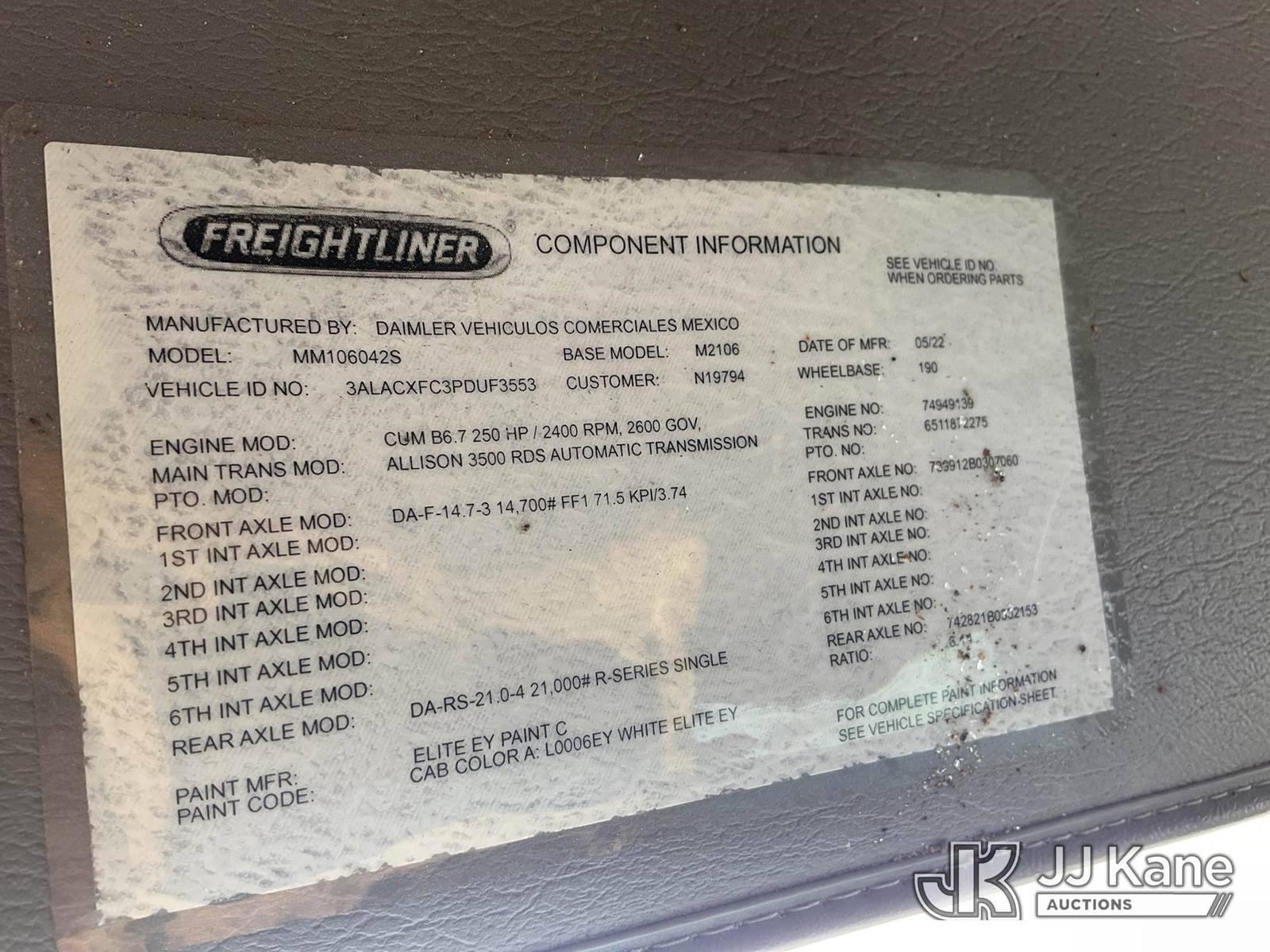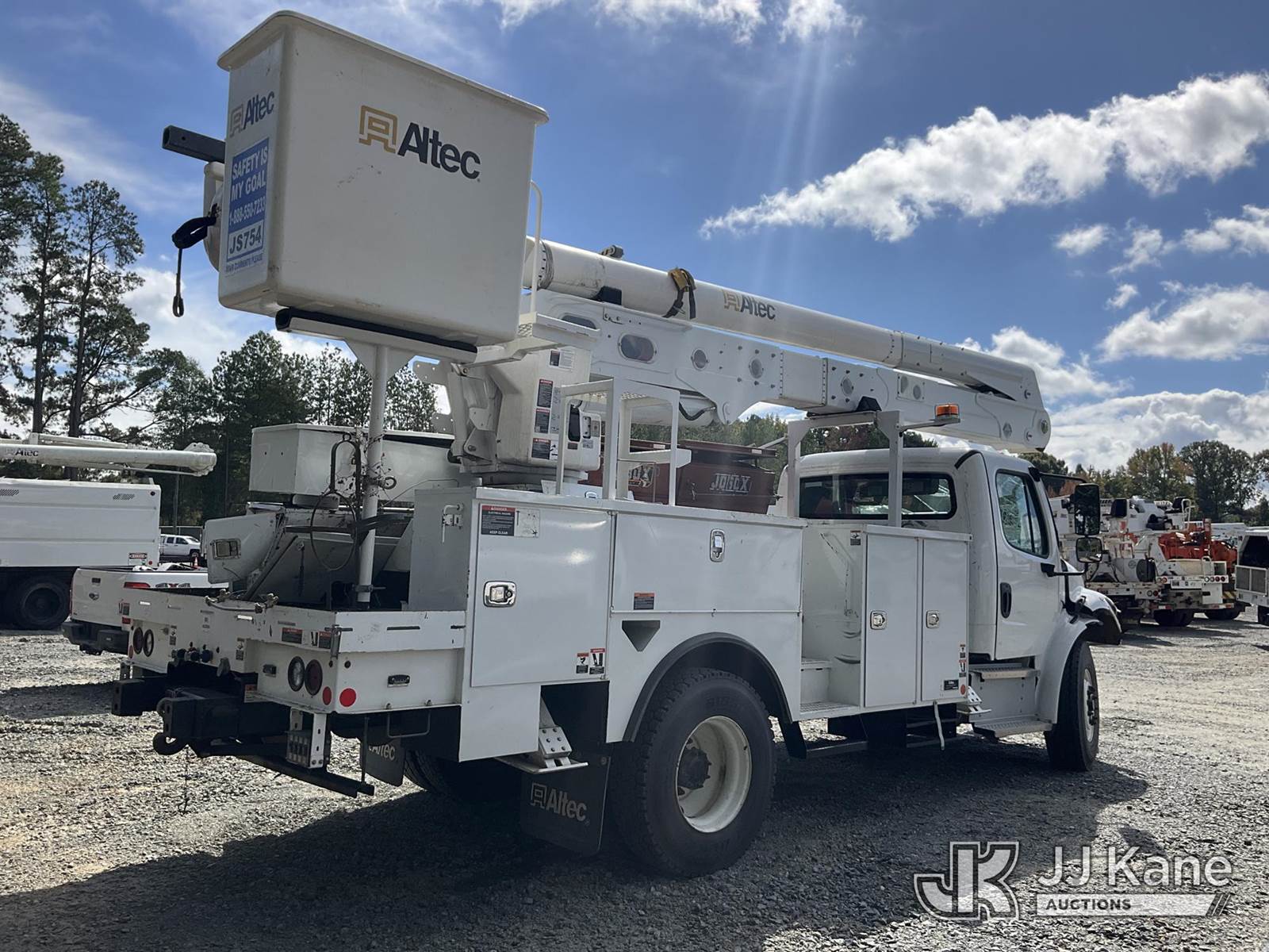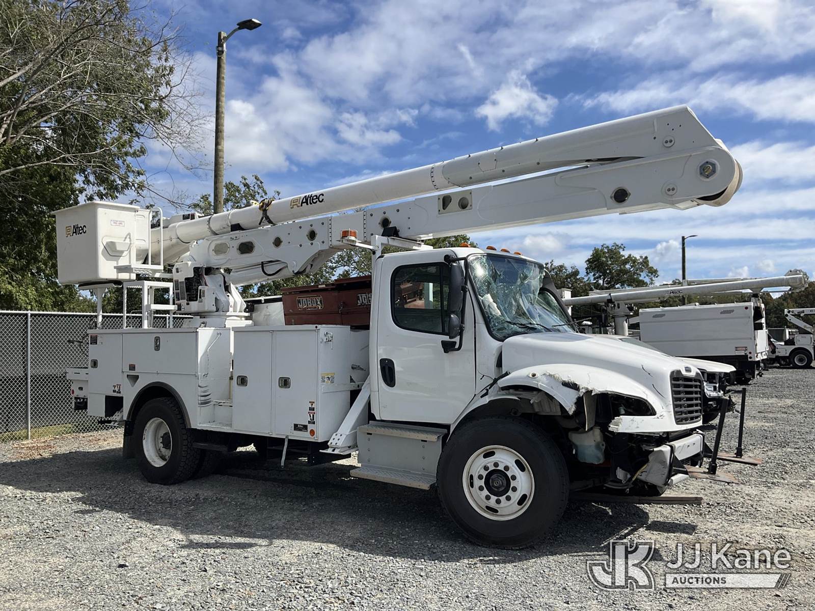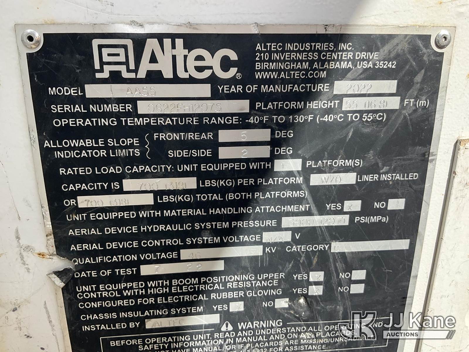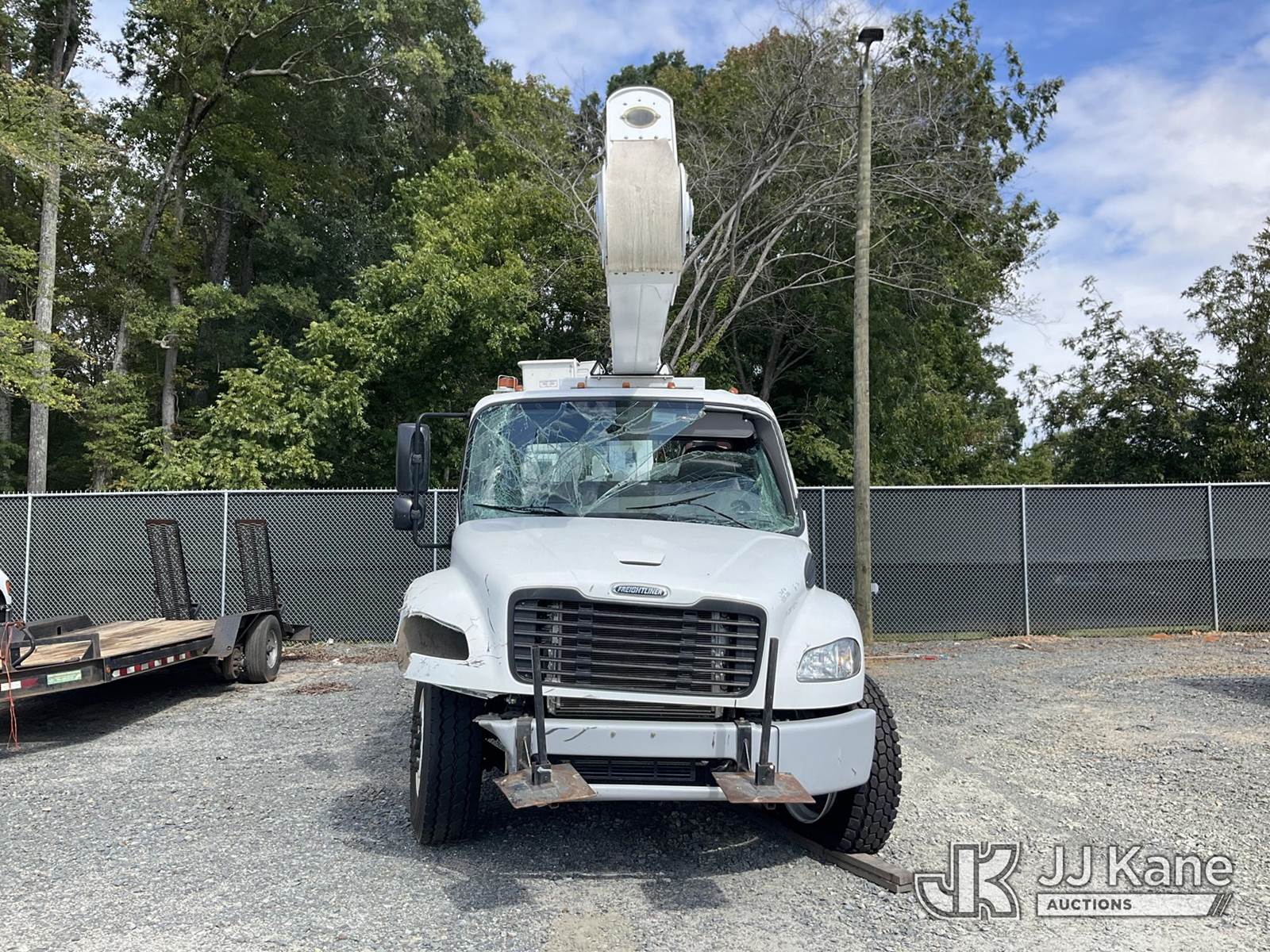 Altec AA55-MH, 60 ft, Material Handling Bucket Truck s/n 0622FH12075, with two-man bucket, rear mounted on 2023 Freightliner M2 106 Utility Truck, Cummins ISB-250 6.7L diesel, Auto, A/C, True Mileage Unknown (***WRECKED***) (Not Running, Upper Condition Unknown, Windshield Damage) (Seller States: Totaled) This is a Titled Item NOTE: This unit is being sold AS IS/WHERE IS via Timed Auction and is located in China Grove, NC. Inspection & preview days for this unit are the 2 business days prior to the first day of items closing for this auction, item is located at 820 E NC Hwy 152 China Grove, NC 28023 and hours of operations are 8a-4p. For pre-sale questions, please contact Office Staff @ (704) 674-1113. (Manuals provided in cab) (Buyer is responsible for removal. Assistance by consignor or JJ Kane Auctioneers is not assured.)