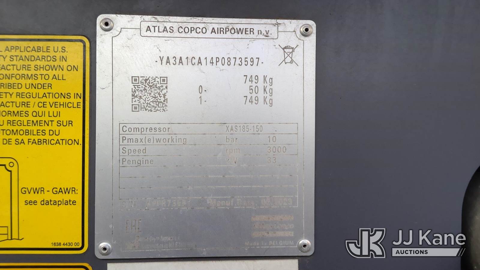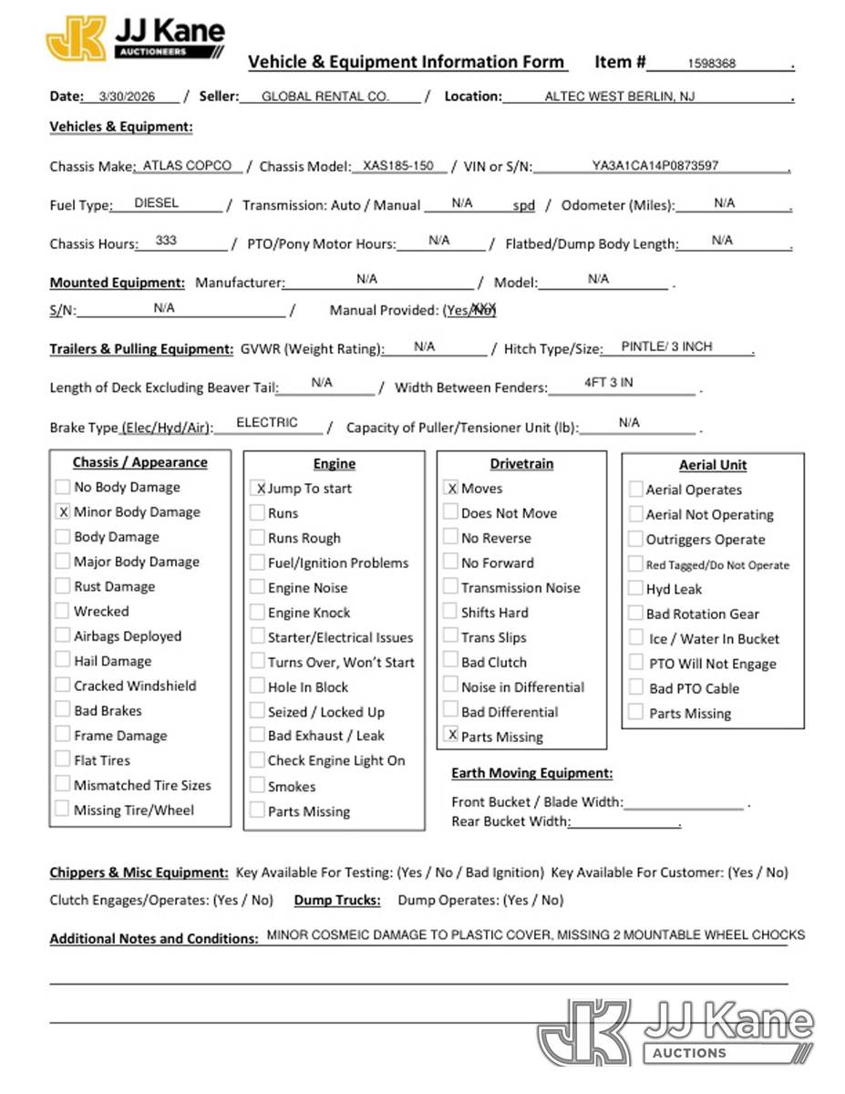 2023 Atlas Copco XAS185-150 Portable Air Compressor, Kubota diesel, (Reads 333 hours) This is a Titled Item NOTE: This unit is being sold AS IS/WHERE IS via Timed Auction and is located in Berlin Township, NJ. Inspection & preview days for this unit are by appointment only; please contact us at contact@jjkane.com or 84-Go-JJKane for more details. (Buyer is responsible for removal. Assistance by consignor or JJ Kane Auctions is not assured.)