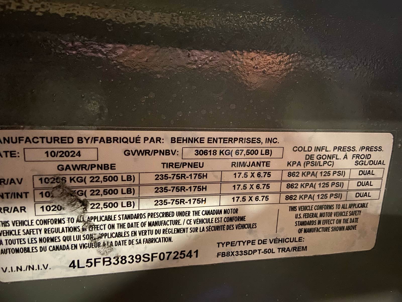 GVW: 67,500 lbs., 27' bed, 6' Wood Filled beavertail, (3) 22,500lb air brake axles, Front axle with air lift suspension, Hutch 9700 Spring Suspension, Bi-fold Hydraulic Ramps, 4 Ga. Battery cables ran to front, Lockable Chain Rack, D-Rings every 2’, Sliding Winch Track -21',(10) weld-on winches and straps, Expanded metal at bottom of tongue, 12x18x48 toolbox, rear strobe/additional clearance lights, tires are 235/75R/17.5 Dual, Aluminum wheels on outers, Hubometer, Mud Flaps, Pintle Hitch, Oad floor, Winch Plate, Color: Charger Gray.
