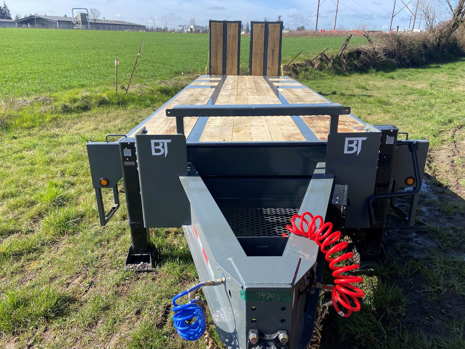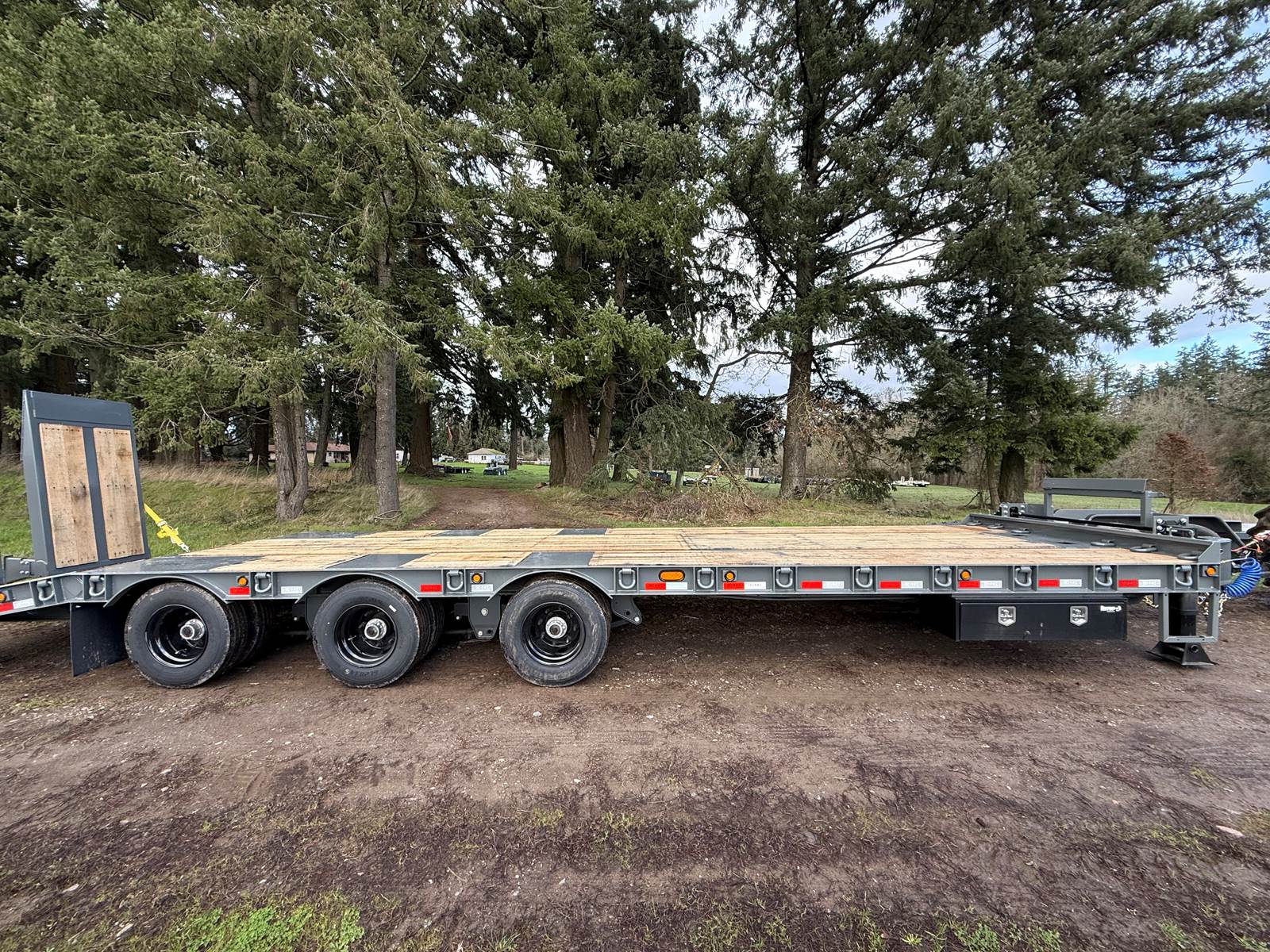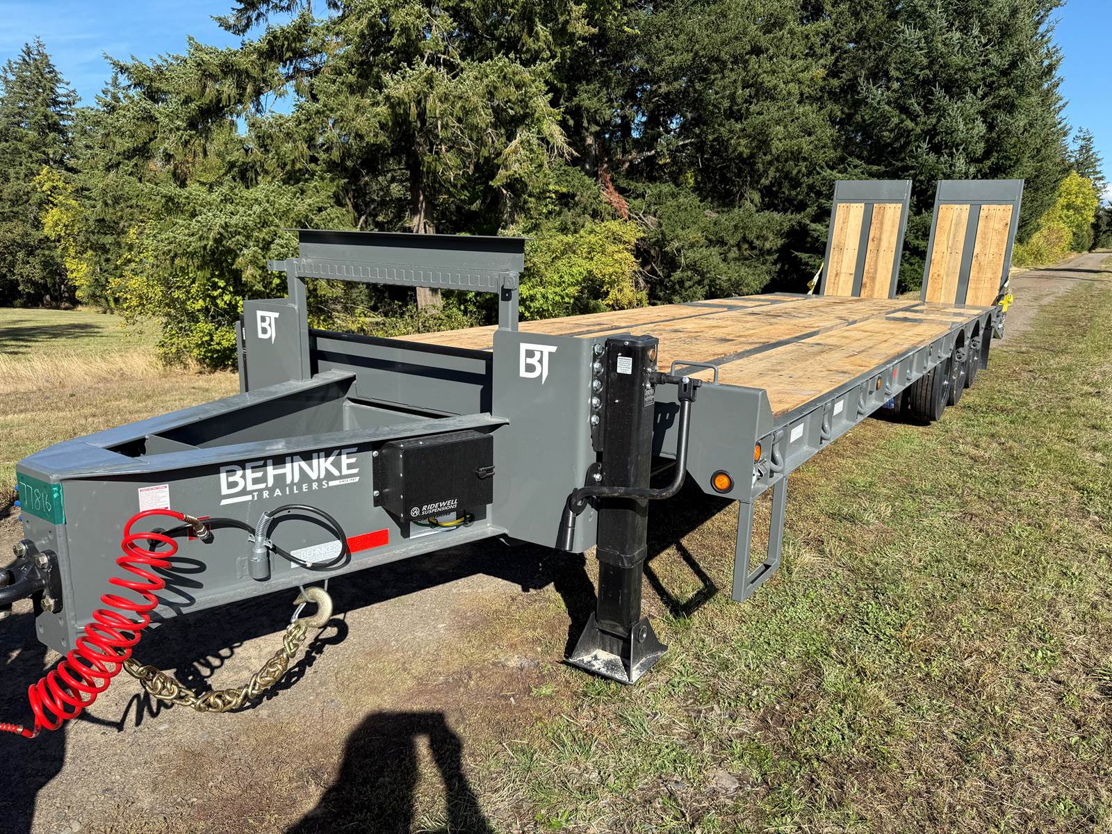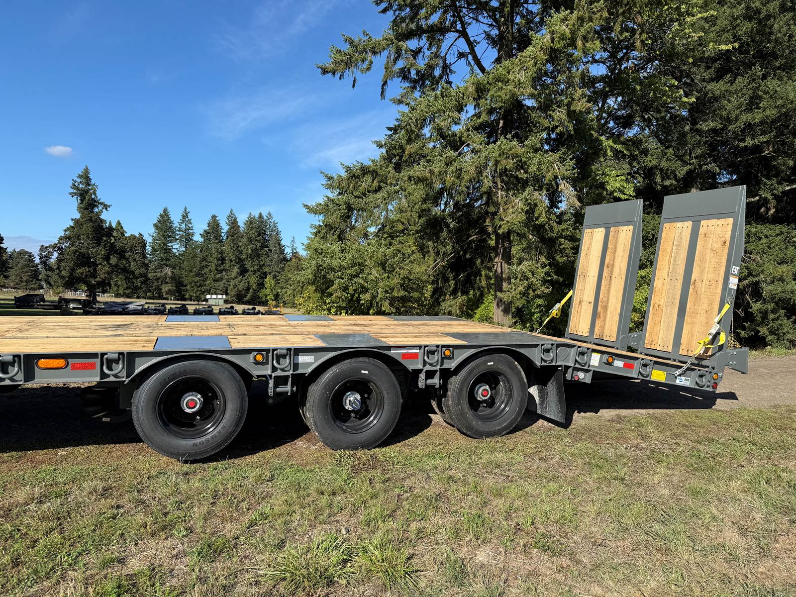 GVW: 67,500 lb, 27' bed, 6' Wood-filled beavertail, 9'1" Axle spread,Hutch 9700 spring suspension, 42" wide x 6' long wood-filled air assisted ramps, (3) 22,500 air brake axles, 235/75R/17.5 Tire w/Dual Wheel, Extra D-Rings, Expanded metal to bottom of tongue, 12 x 18 x 48" underbody toolbox, Winch Plate, Winch track rail with stops drilled/bolted, 2 welded - 8 sliding winches and straps, Flag holders, Strobe, clearance lights, Lockable Chain rack, 100K Pintle, Oak Floor, Color: Charger Gray, Black wheel