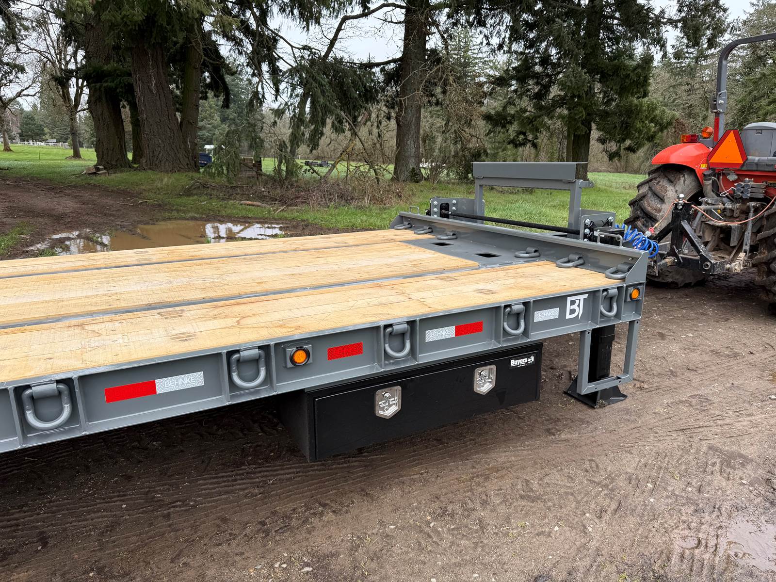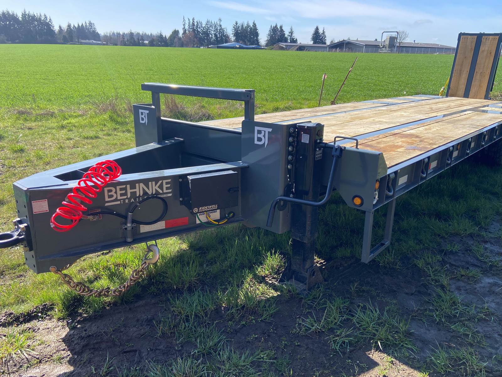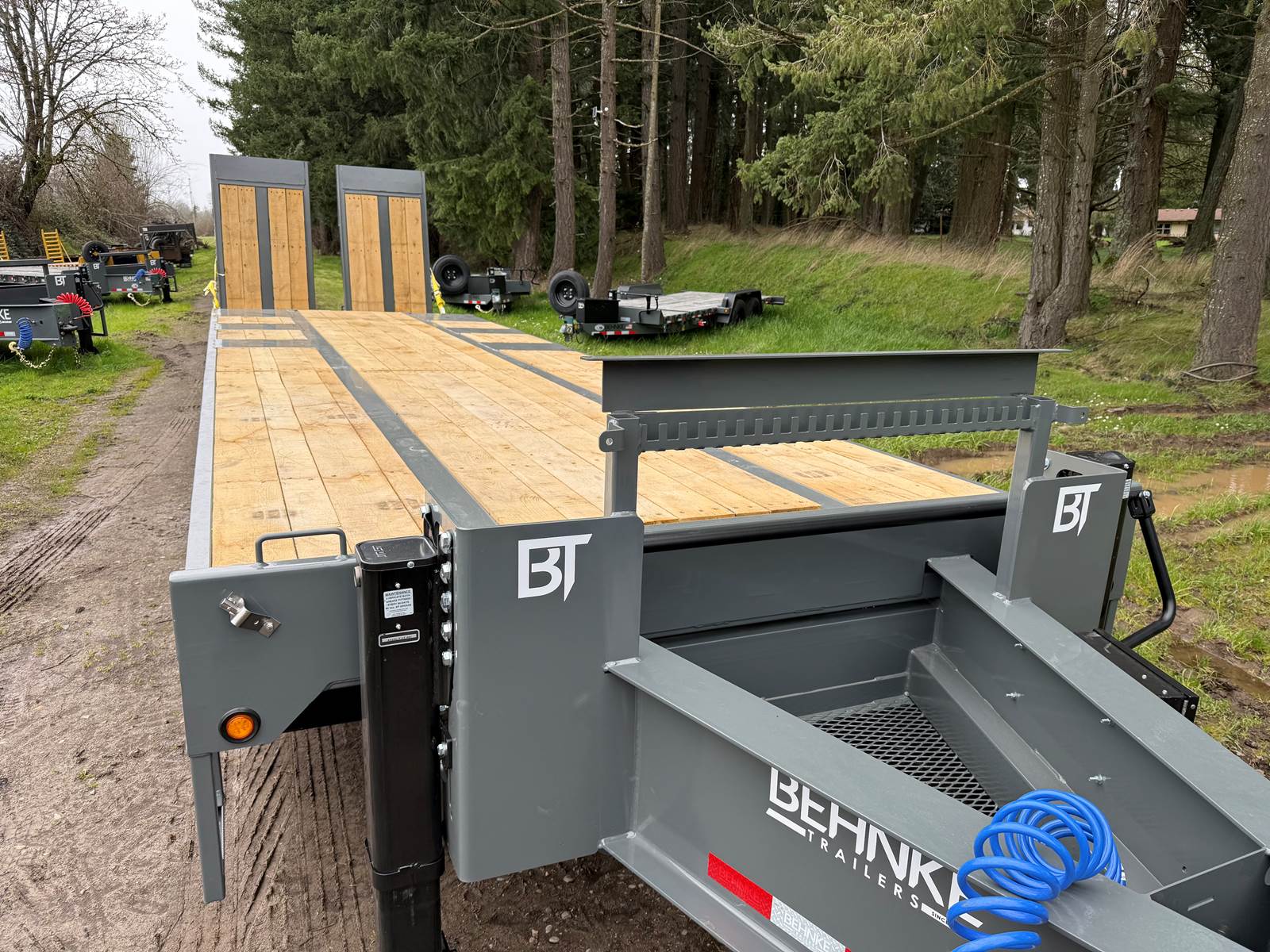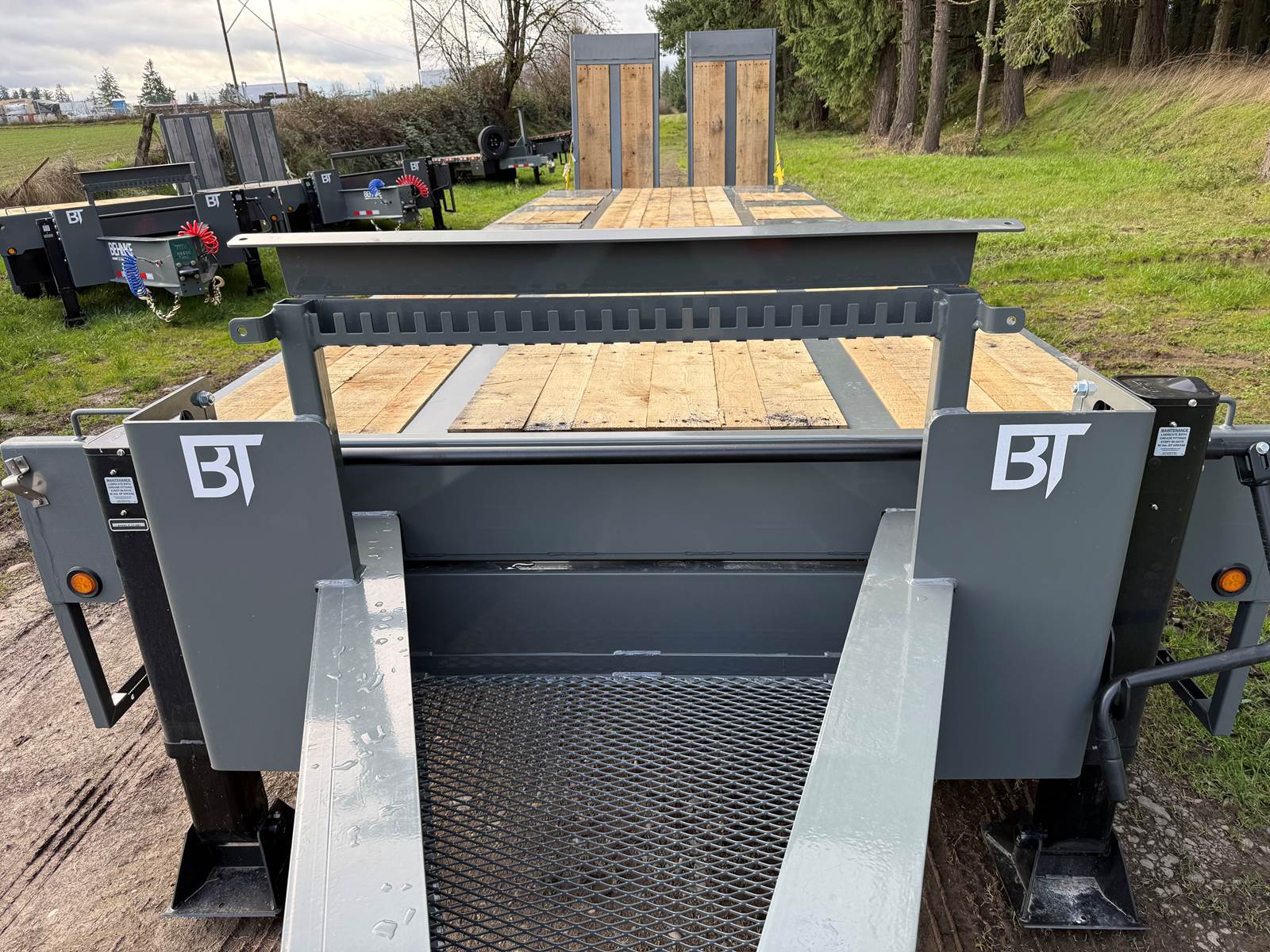 GVW: 67,500 lb, 27' bed, 6' Wood-filled beavertail, 9'1" Axle spread,Hutch 9700 spring suspension, 42" wide x 6' long wood-filled air assisted ramps, (3) 22,500 air brake axles, 235/75R/17.5 Tire w/Dual Wheel, Extra D-Rings, Expanded metal to bottom of tongue, 12 x 18 x 48" underbody toolbox, Winch Plate, Winch track rail with stops drilled/bolted, 2 welded - 8 sliding winches and straps, Flag holders, Strobe, clearance lights, Lockable Chain rack, 100K Pintle, Oak Floor, Color: Charger Gray, Black wheel