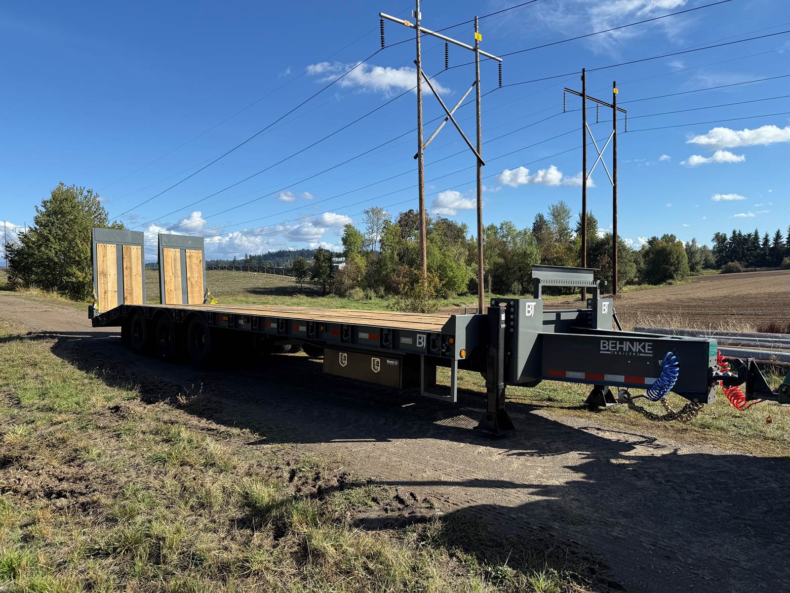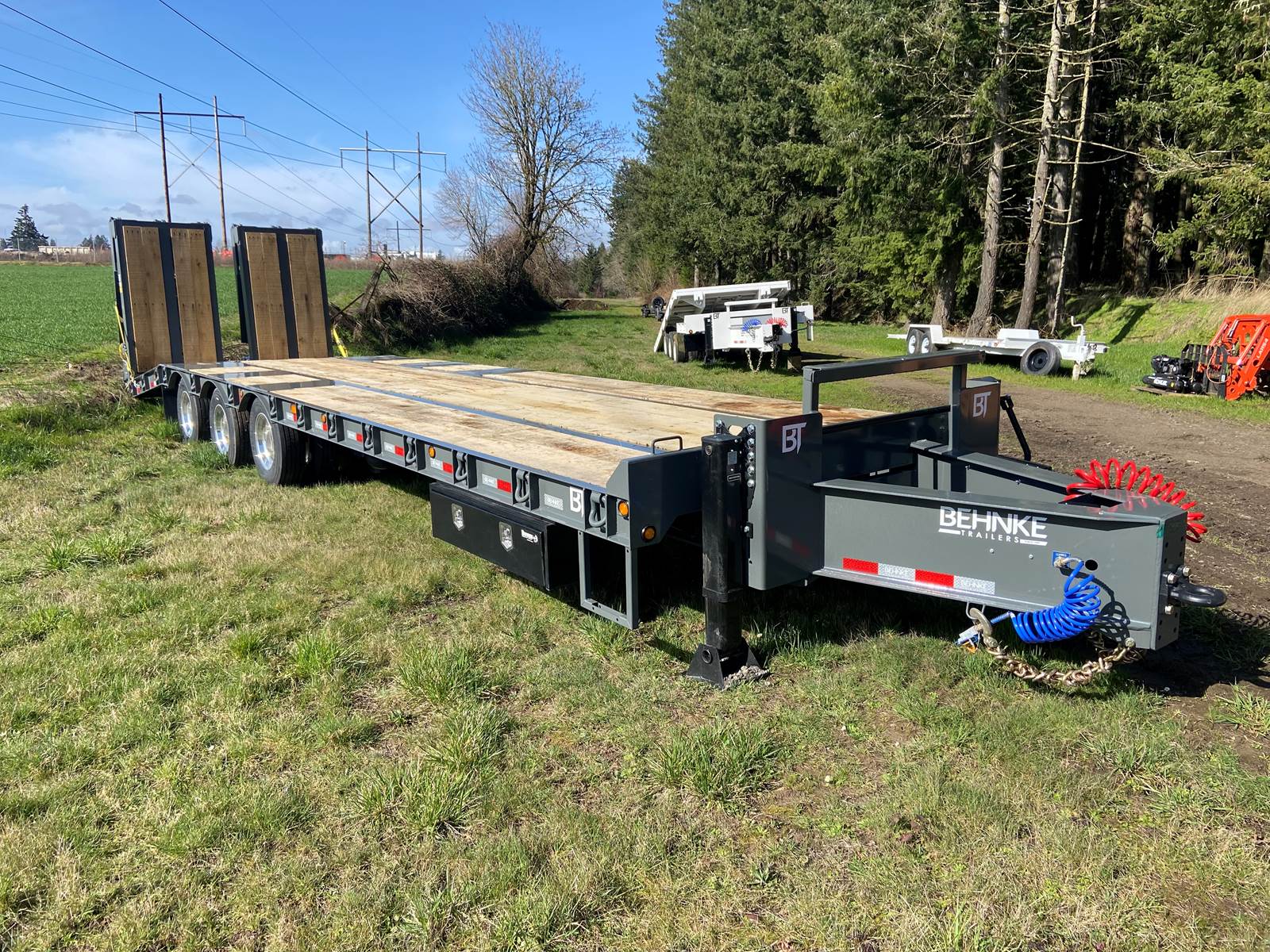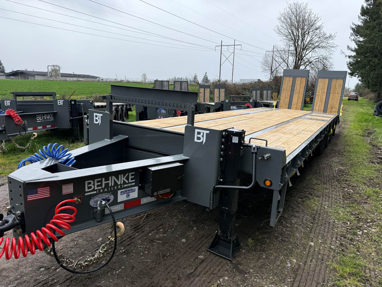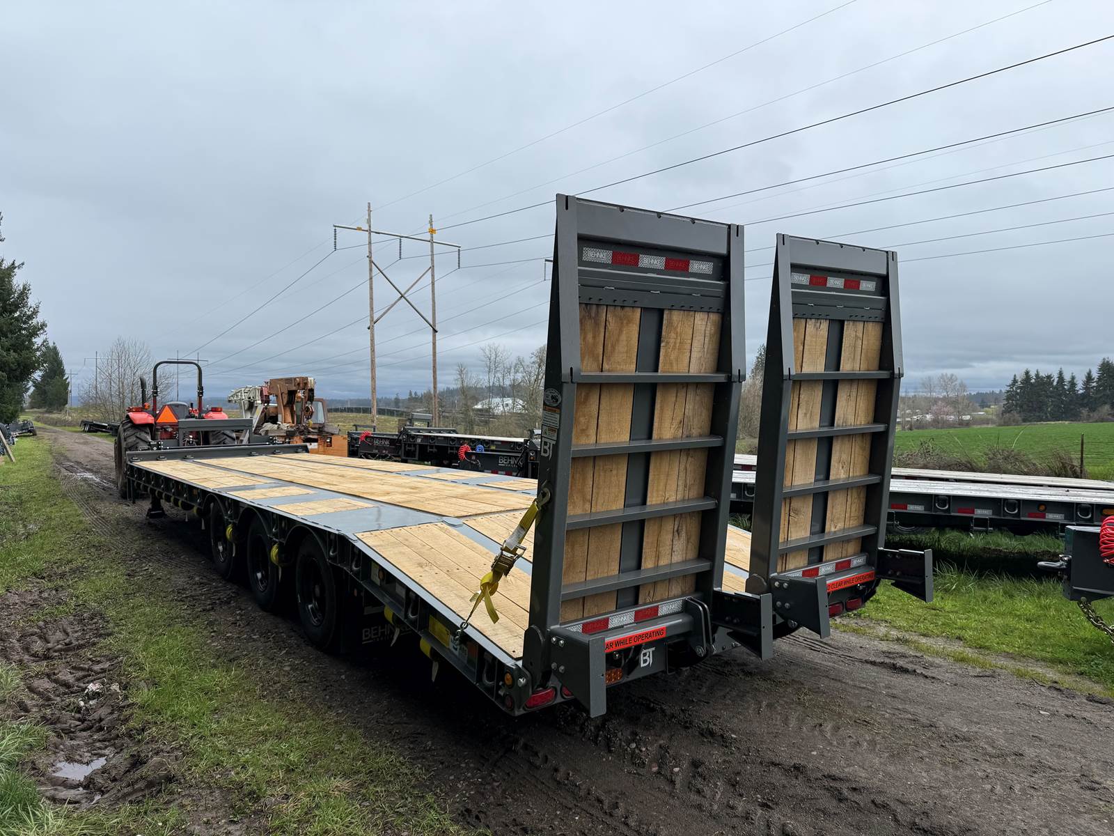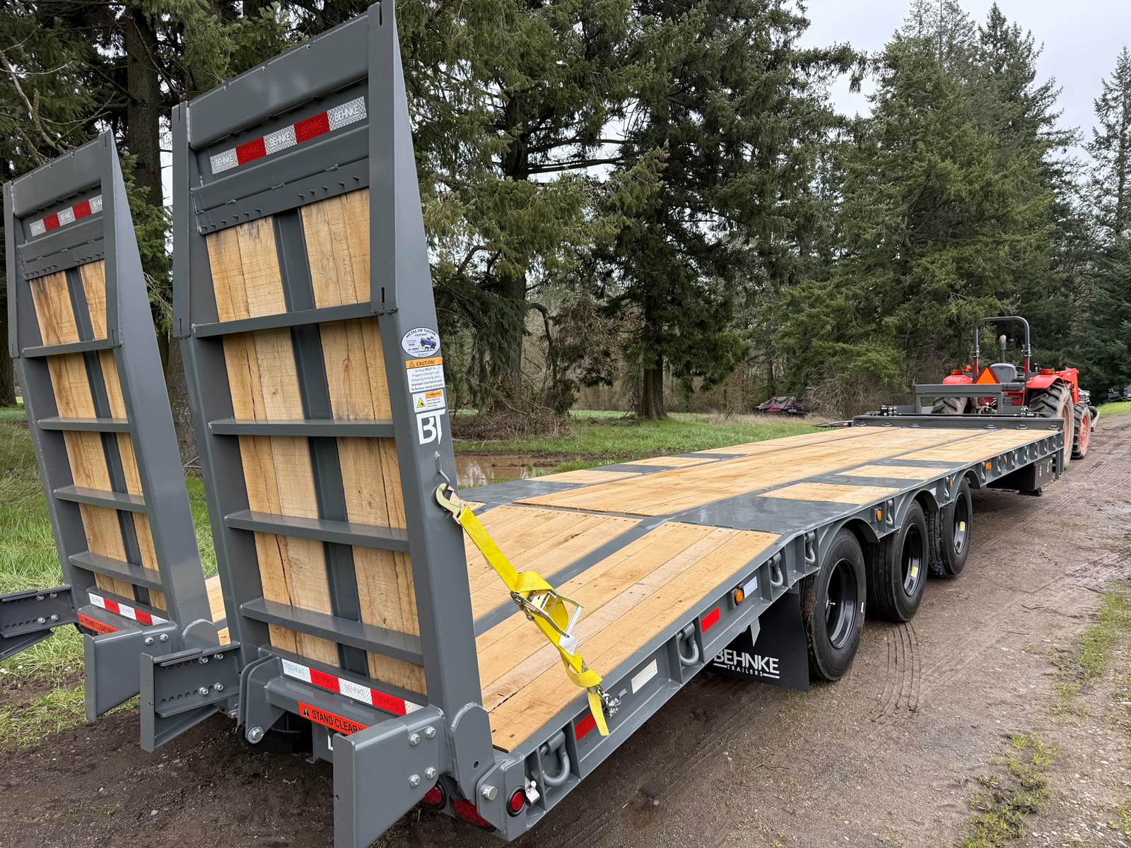 GVW: 67,500 lb, 27' bed, 6' Wood-filled beavertail, 9'1" Axle spread,Hutch 9700 spring suspension, 42" wide x 6' long wood-filled air assisted ramps, (3) 22,500 air brake axles, 235/75R/17.5 Tire w/Dual Wheel, Extra D-Rings, Expanded metal to bottom of tongue, 12 x 18 x 48" underbody toolbox, Winch Plate, Winch track rail with stops drilled/bolted, 2 welded - 8 sliding winches and straps, Flag holders, Strobe, clearance lights, Lockable Chain rack, 100K Pintle, Oak Floor, Color: Charger Gray, Black wheel