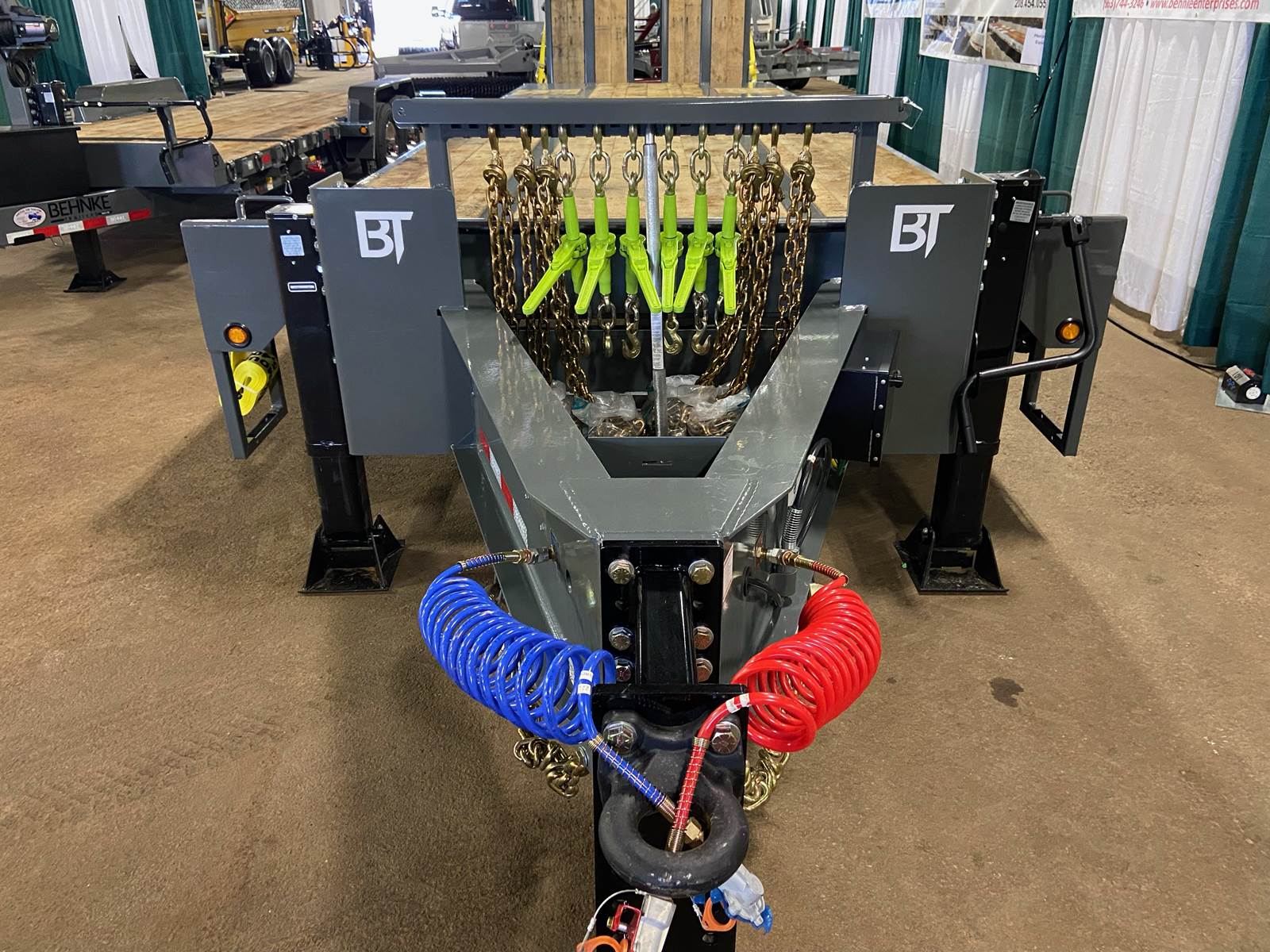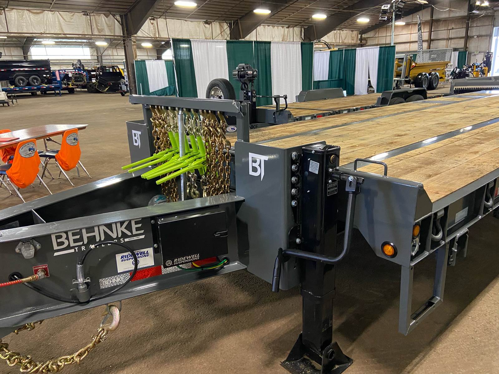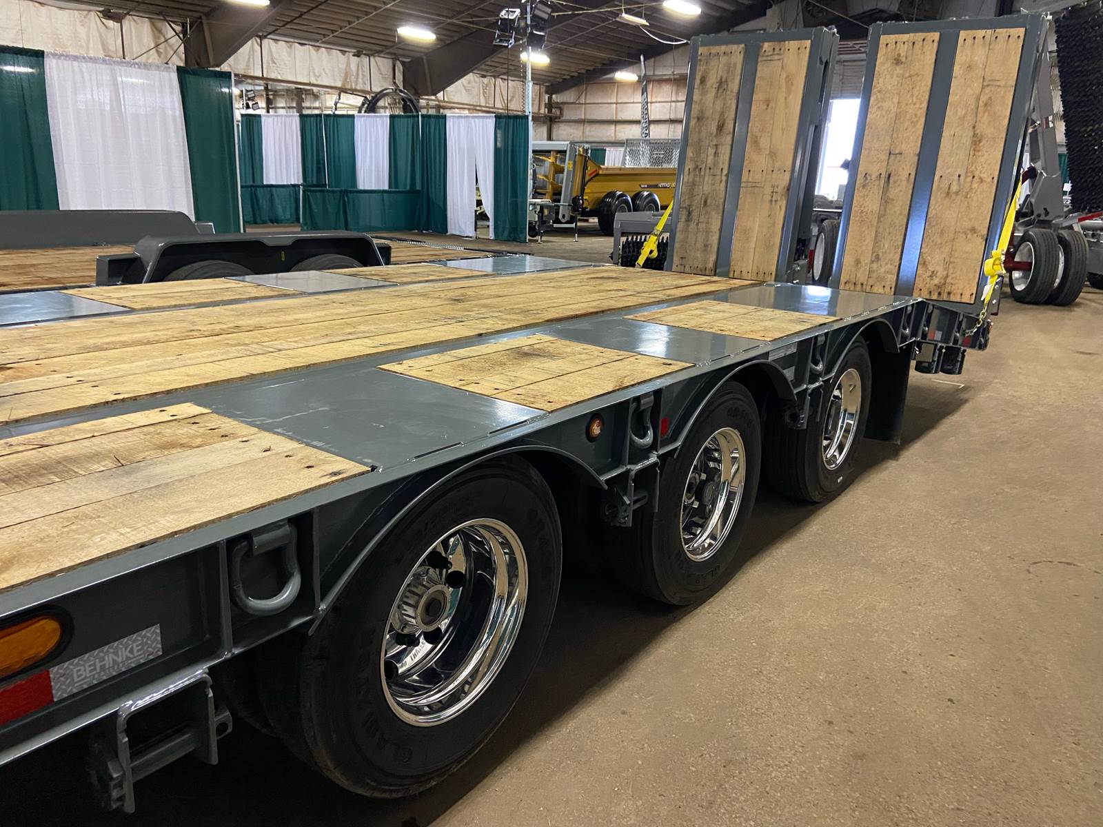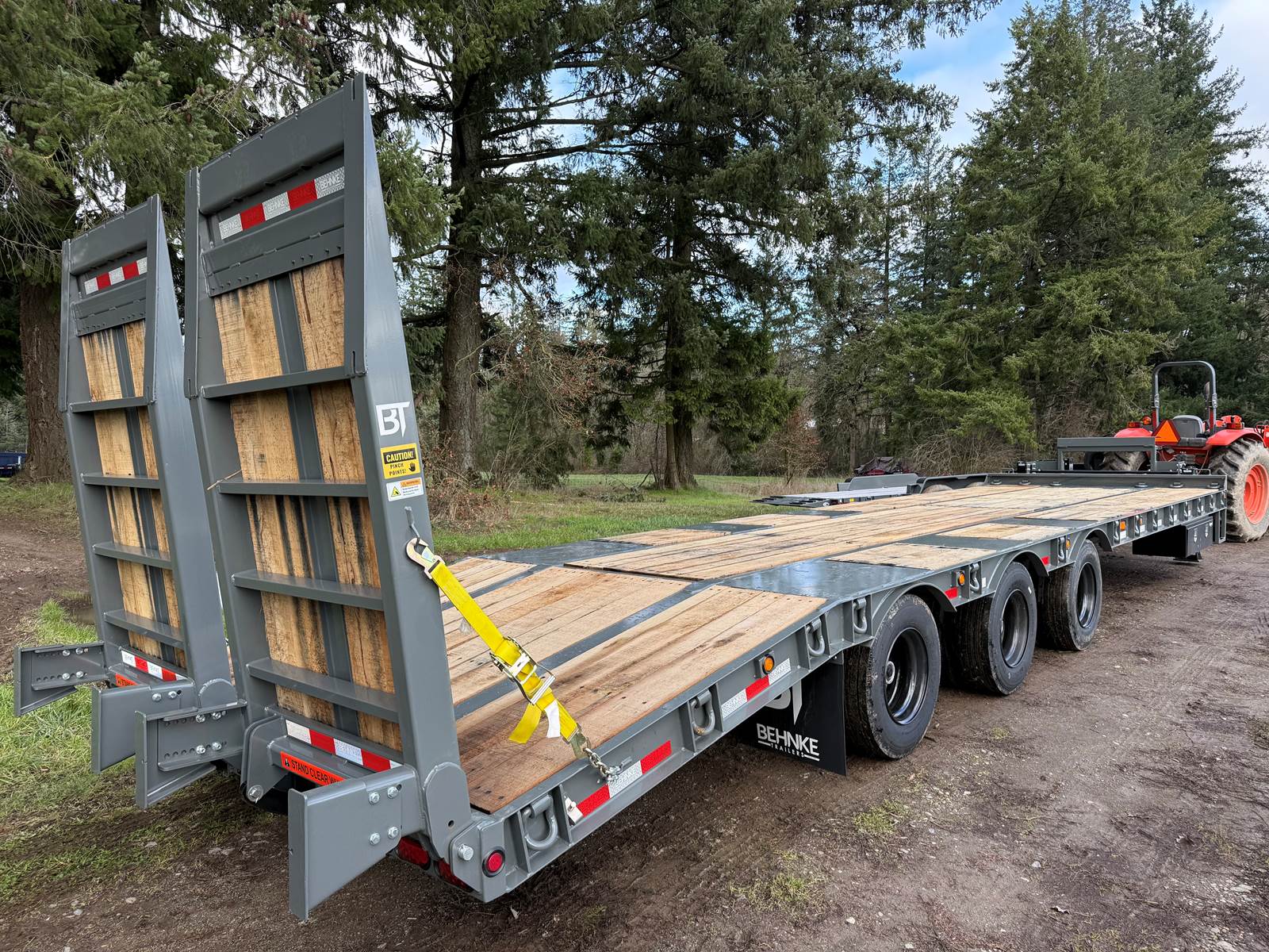 GVW: 67,500 lb, 27' bed, 6' Wood-filled beavertail, 9'1" Axle spread,Hutch 9700 spring suspension, 42" wide x 6' long wood-filled air assisted ramps, (3) 22,500 air brake axles, 235/75R/17.5 Tire w/Dual Wheel, Extra D-Rings, Expanded metal to bottom of tongue, 12 x 18 x 48" underbody toolbox, Winch Plate, Winch track rail with stops drilled/bolted, 2 welded - 8 sliding winches and straps, Flag holders, Strobe, clearance lights, Lockable Chain rack, 100K Pintle, Oak Floor, Color: Charger Gray, Black wheel