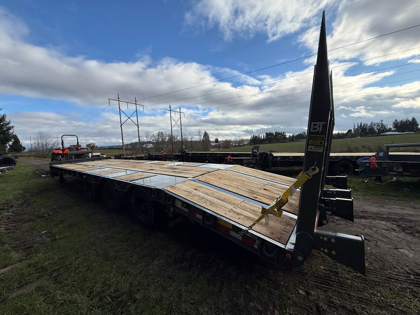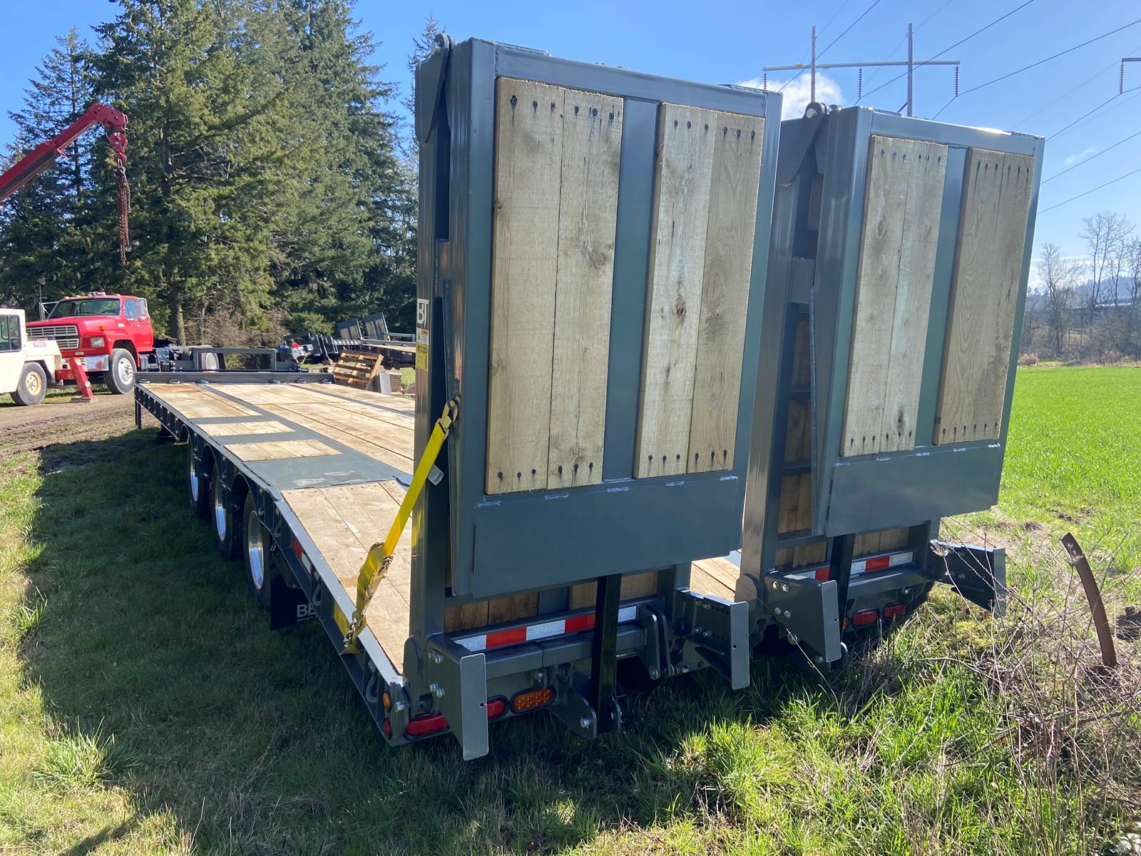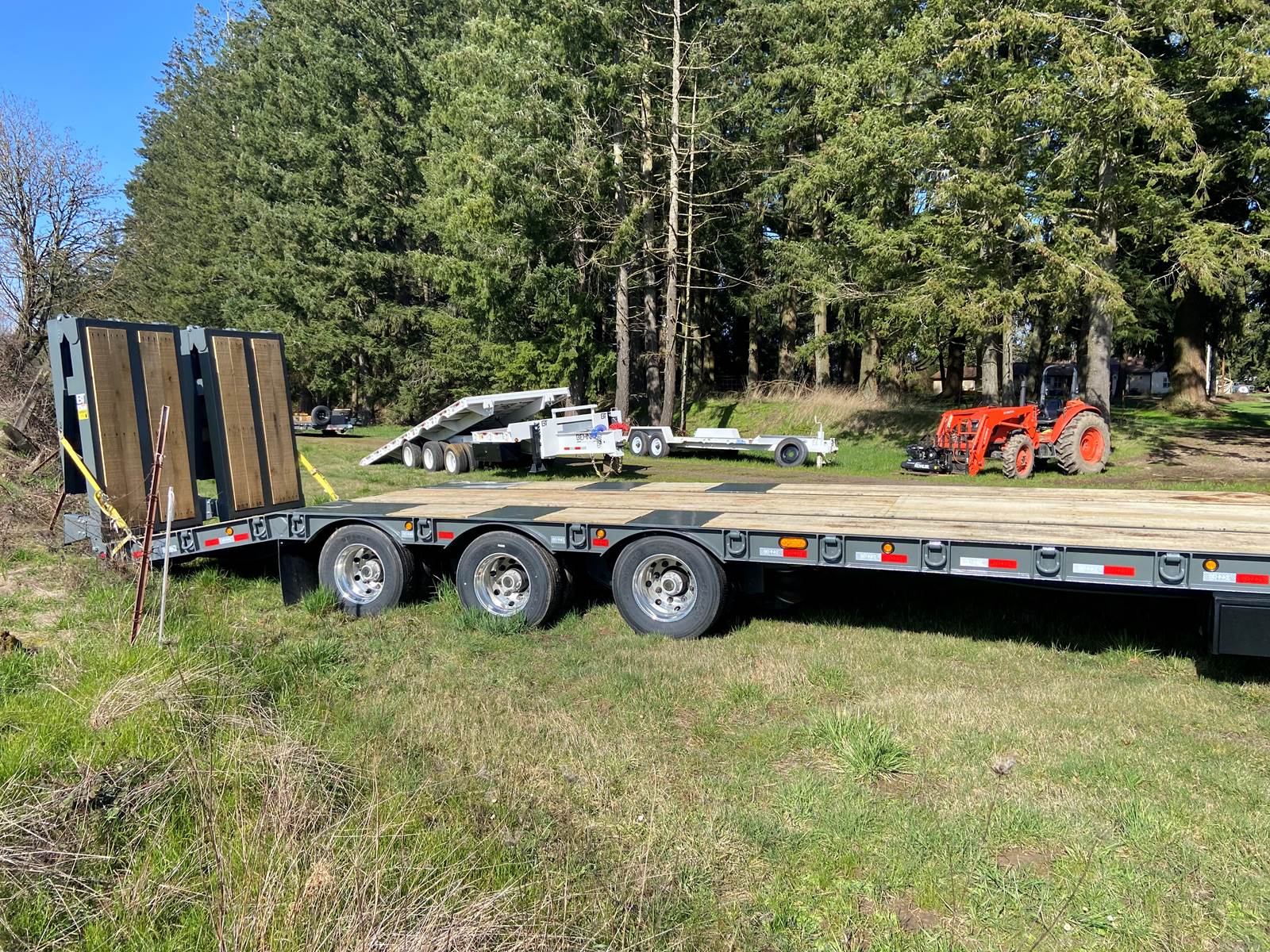 GVW: 67,500 lbs., 27' bed, 6' Wood Filled beavertail, (3) 22,500lb air brake axles, Front axle with air lift suspension, Hutch 9700 Spring Suspension, Lockable Chain Rack, Air Ramps, D-Rings every 2’, Sliding Winch Track -22',weld-on winches/hooks and straps, Expanded metal at bottom of tongue, 12x18x48 toolbox, rear strobe/additional clearance lights, tires are 235/75R/17.5 Dual, Aluminum wheels on outers, Hubometer, Mud Flaps, Pintle Hitch, Oad floor, Winch Plate, Color: Charger Gra