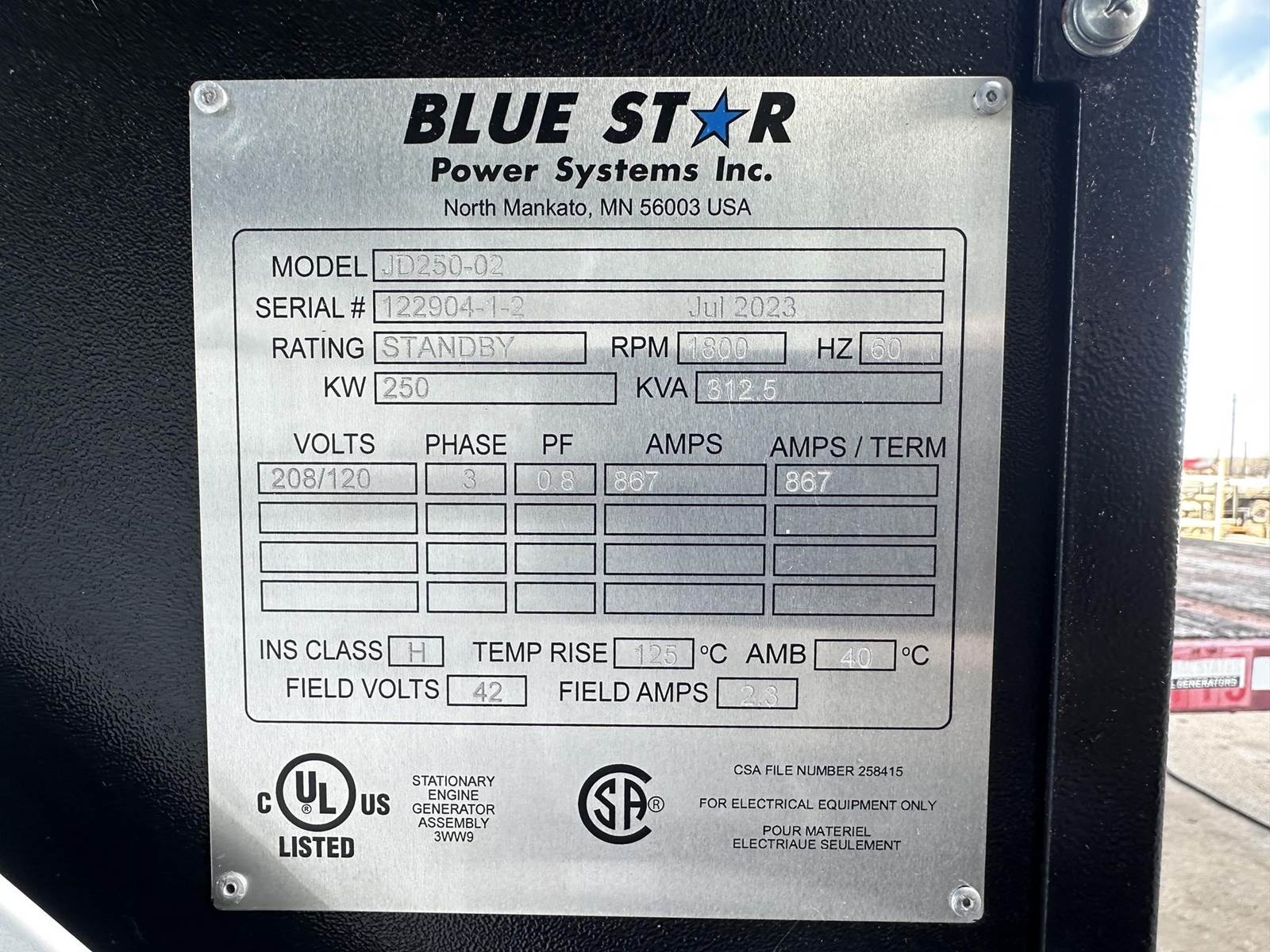 New Blue Star Power Systems / John Deere 250 kW standby (225 kW prime) diesel generator set model JD250-02, SN-122904-1-2. John Deere 6090HF484 engine rated 422 HP at 1800 RPM, EPA Tier 3 emissions, SN-RG6090L151892. 3/60/120/208V, 12 lead reconnectable to 480V and other voltages. 1000 Amp circuit breaker. PMG - permanent magnet generator. Oversized generator end rated 275 kW. Engine cooling radiator rated 50C/122F ambient. UL listed stationary engine generator assembly. Deep Sea 7310 digital control panel. Battery charger. Coolant heater. Aluminum level 2 sound attenuated enclosure, 200 MPH wind rating. 950 gallon (48 Hr) UL listed sub-base fuel tank with secondary containment, FDEP and 5 gal spill fill. 0 Hrs. Yr 2023. No batteries, no warranty. Overall dimensions 68W x 222L x 133H on 6H blocks, 9750 lbs. FOB Waukesha, WI