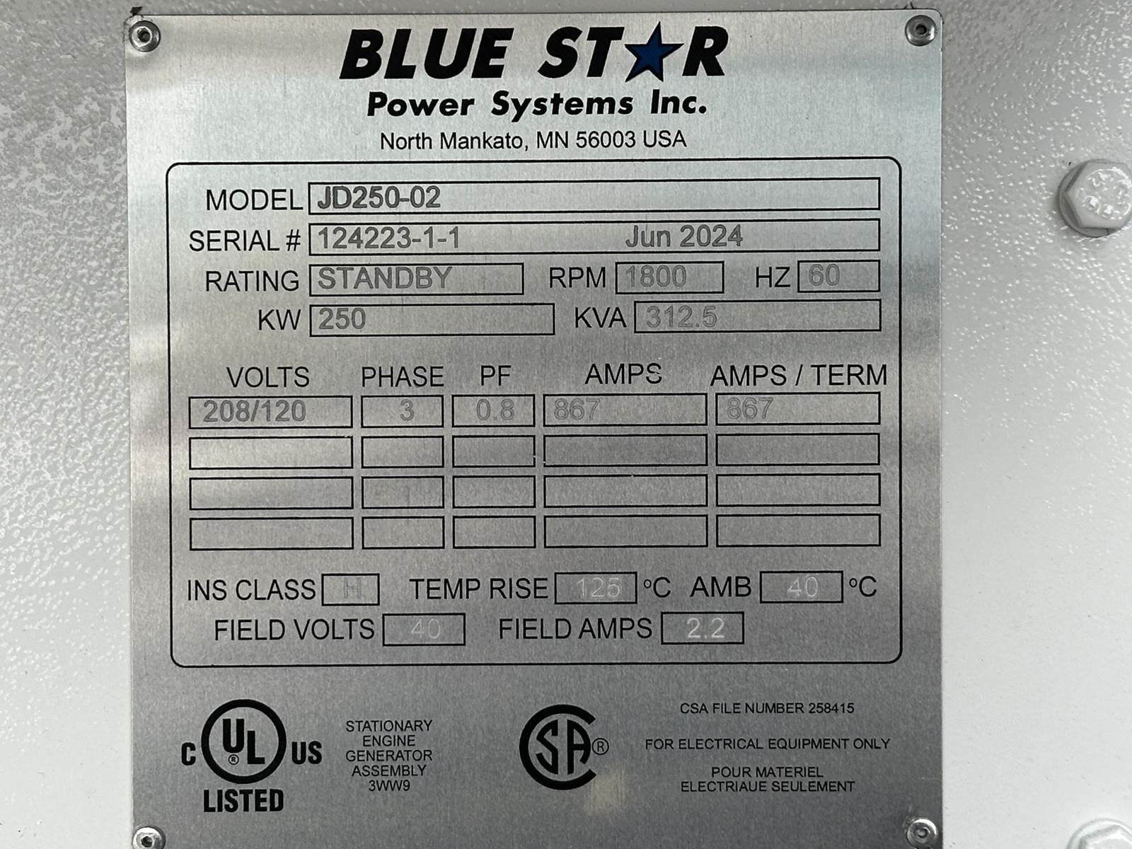 New Blue Star Power Systems / John Deere 250 kW standby (225 kW prime) diesel generator set model JD250-02, SN-124223-1-1. John Deere 6090HF484 engine rated 422 HP at 1800 RPM, EPA Tier 3 emissions, SN-RG6090L155529. 3/60/120/208V, 12 lead reconnectable to 480V and other voltages. 1000 Amp circuit breaker. PMG - permanent magnet generator. Oversized generator end rated 275 kW. Engine cooling radiator rated 50C/122F ambient. UL listed stationary engine generator assembly. Deep Sea 7310 digital control panel. Battery charger. Coolant heater. Aluminum level 2 sound attenuated enclosure, 200 MPH wind rating. 950 gallon (48 Hr) UL listed sub-base fuel tank with secondary containment, FDEP and 5 gal spill fill. 0 Hrs. Yr 2024. No batteries, no warranty. Overall dimensions 68W x 222L x 133H on 6H blocks, 9750 lbs. FOB Waukesha, WI