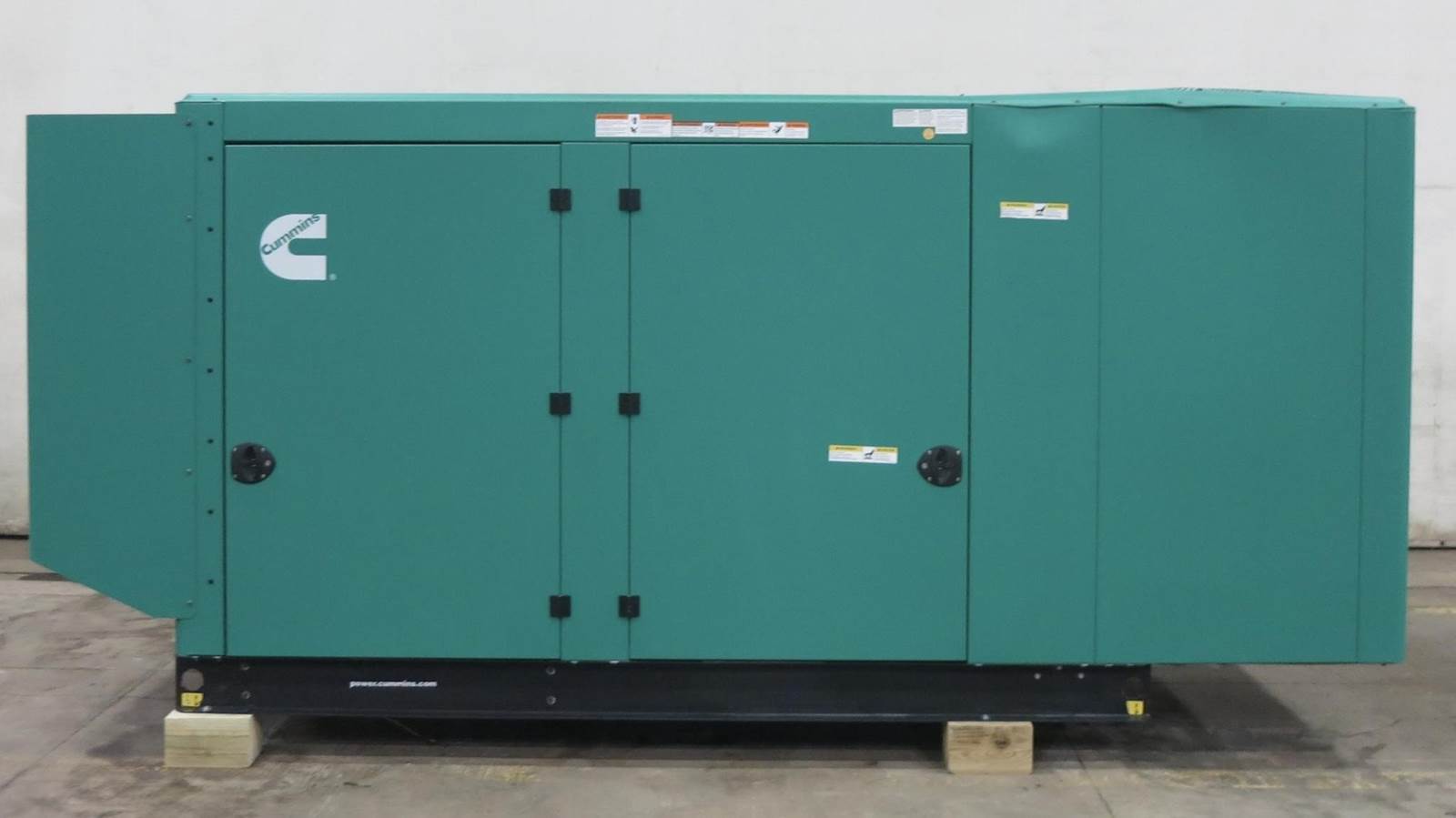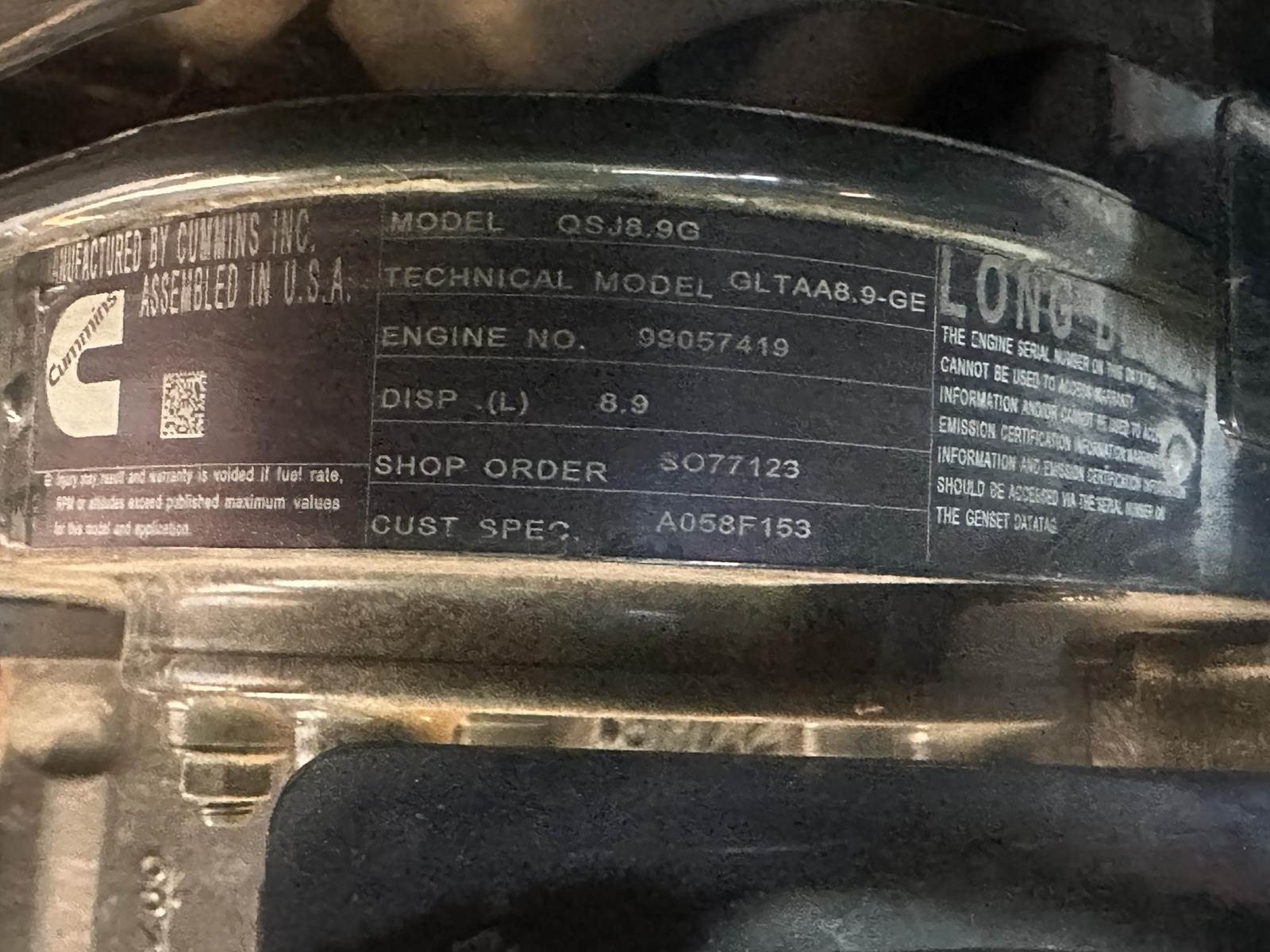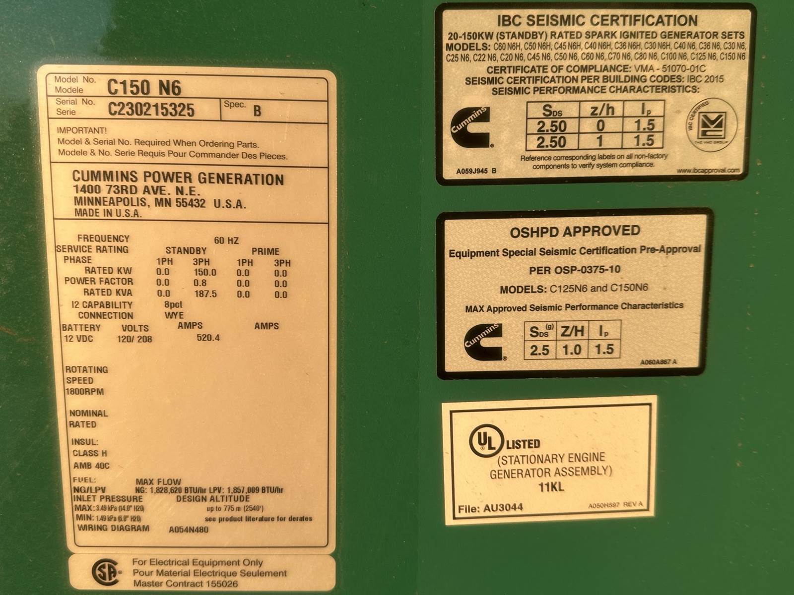 Cummins 150 kW standby natural gas / propane generator set, model C150N6, SN-C230215325. Cummins QSJ8.9G engine rated 240 HP at 1800 RPM, SN-99057419, EPA certified. 3/60/277/480V, 12 lead reconnectable to other voltages. 200-600 Amp adjustable 100% rated main-line circuit breaker. PMG permanent magnet generator. Engine cooling radiator rated 50C/122F ambient. UL 2200 listed stationary engine generator assembly. IBC seismic certified. OSHPD approved. PowerCommand 2.3 digital control panel. Battery charger 6 Amp. Coolant heater 1500W. Aluminum sound attenuated enclosure w/critical grade muffler, 180 MPH wind rating. 2500 Hours. Year 2023. Load test pending. Load test pending. Overall dimensions 40W x 160L x 77H on 6H blocks, 3940 lbs. FOB Waukesha, WI