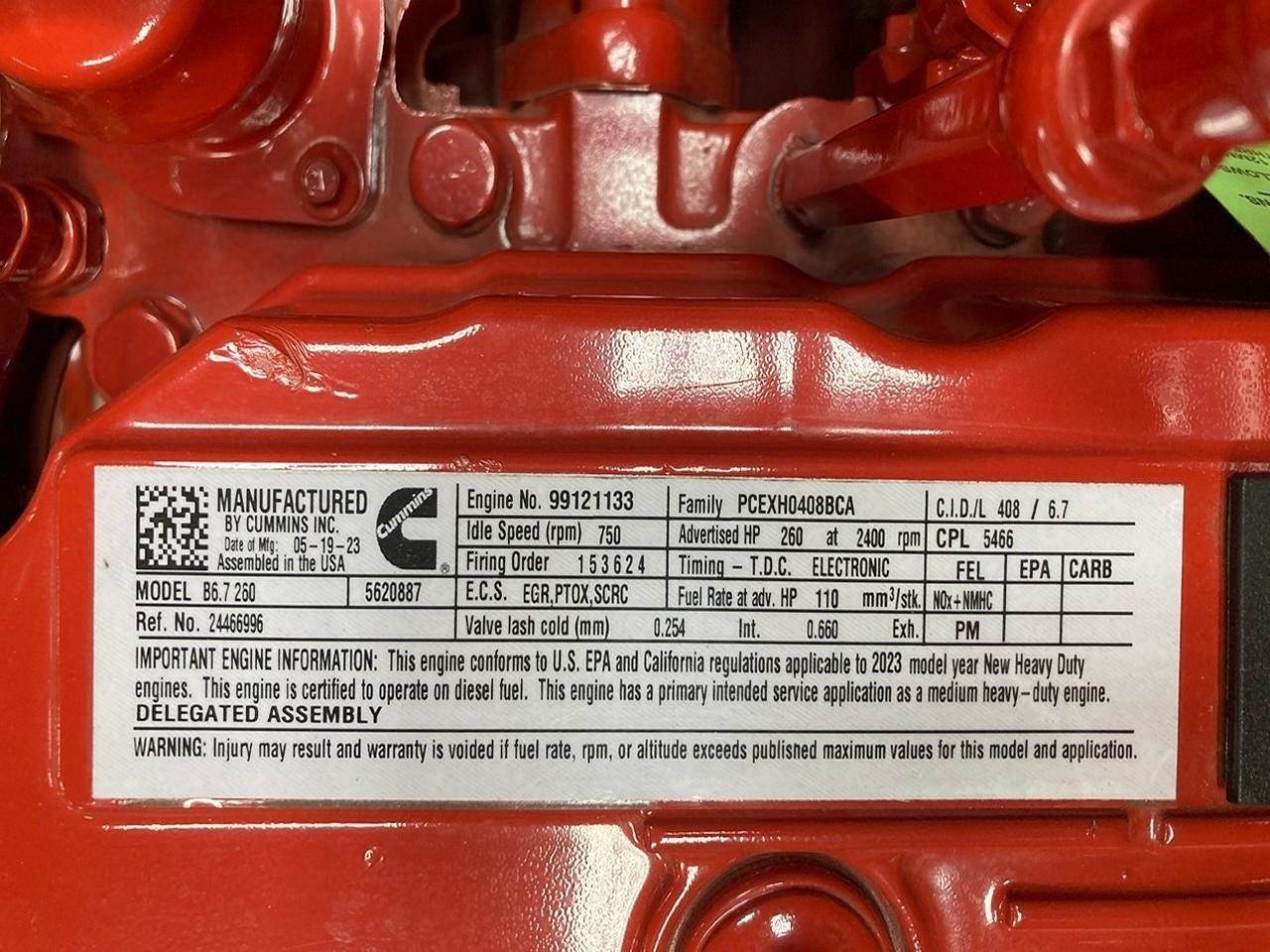 NEW 2023 CUMMINS ISB6.7 260HP DIESEL ENGINE FOR SALE at ADELMAN’S TRUCK PARTS in CANTON, OHIO. COMPLETE (MINUS FLYWHEEL, STARTER & ALTERNATOR), 6 CYLINDER, ELECTRONIC w/ECM, B6.7 260, CM2450 with COMMON RAIL FUEL SYSTEM, CPL 5466, 260 HP @ 2400 RPM, PCEXH0408BCA FAMILY #, with EGR, PTOX, & SCRC EMISSIONS CONTROL SYSTEMS.