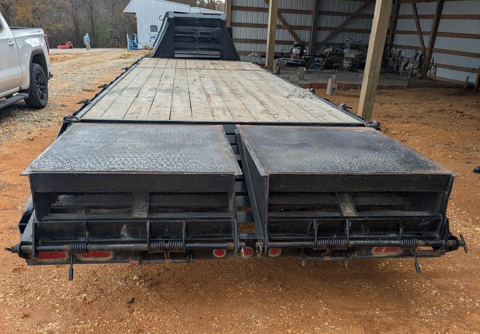 2023 Eagle Flatbed Gooseneck Trailer, 30', 20,0000 GVWR, Tandem Axle, lockable Toolbox, Electric Brakes, Spring Assisted Cleated Swing Up Ramp, Adjustable Gooseneck Coupler, Stake Pockets with Rub Rail, LED Lights, 30' x 8' Equipment Trailer, Lightly Used, Like New Condition