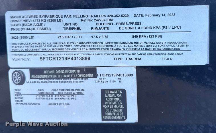 2023 Felling Trailers FT-8R reel trailer, VIN: 5FTCR1219P4013885, Dimensions, Overall, Length: 12', Width: 99", Features, Reel: Single,...