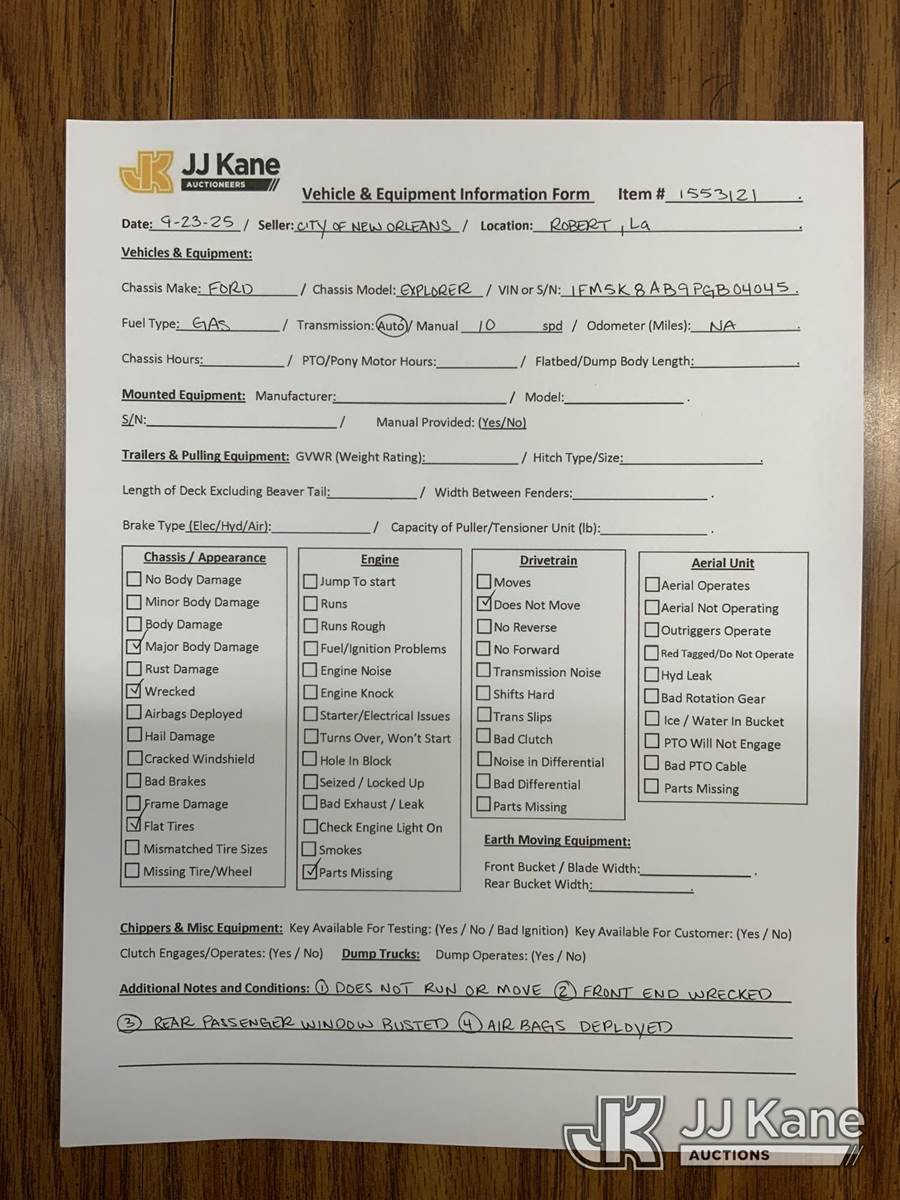 2023 Ford Explorer AWD Police Interceptor 4-Door Sport Utility Vehicle, 6-cyl gas, Auto, True Mileage Unknown (Wrecked) (Not Running, Condition Unknown) (Airbags Deployed, Cracked Windshield, Driver Side Rear Window Broken, Body/Paint Damage) This is a Titled Item NOTE: This unit is being sold AS IS/WHERE IS via Timed Auction and is located in Robert, LA. For more information & removal arrangements please contact Jordan Bane @ jordan.bane@altec.com. License # LA AB-154 (Buyer is responsible for removal. Assistance by consignor or JJ Kane Auctions is not assured.)