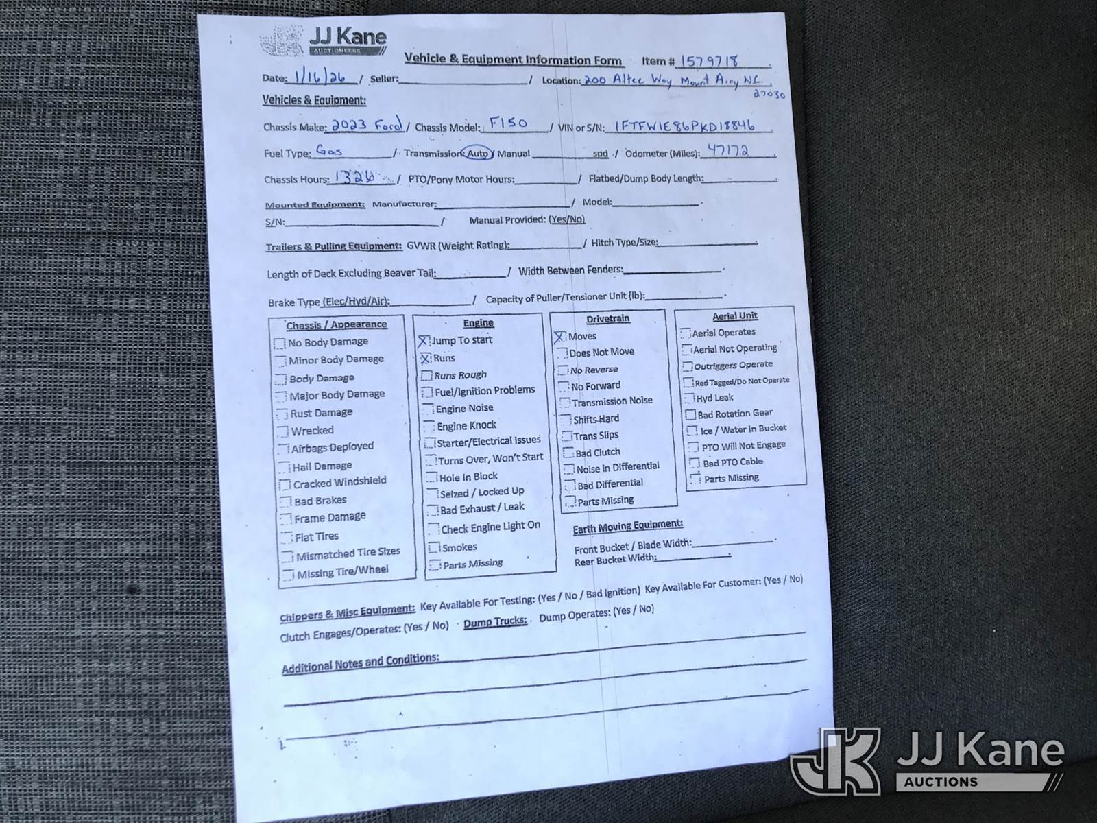 2023 Ford F150 4x4 Crew-Cab Pickup Truck, 3.5L V6 DOHC 24V gas, 6-Speed Automatic, A/C, (47,173 miles) (Runs & Moves) (Jump To Start) This is a Titled Item NOTE: This unit is being sold AS IS/WHERE IS via Timed Auction and is located in Mount Airy, NC. Inspection & preview days for this unit are by appointment only; please contact us at contact@jjkane.com or 84-Go-JJKane for more details. (Buyer is responsible for removal. Assistance by consignor or JJ Kane Auctions is not assured.)