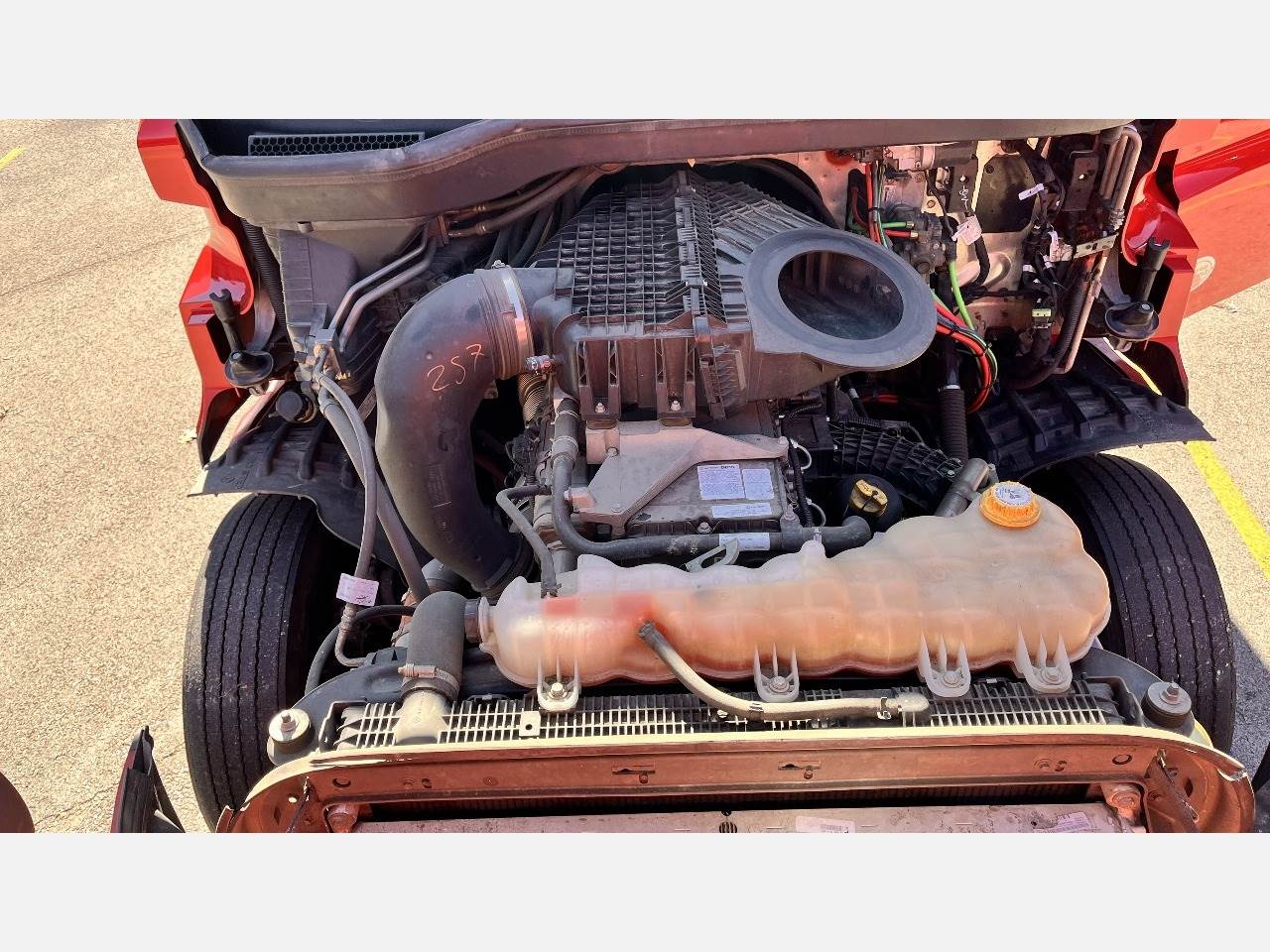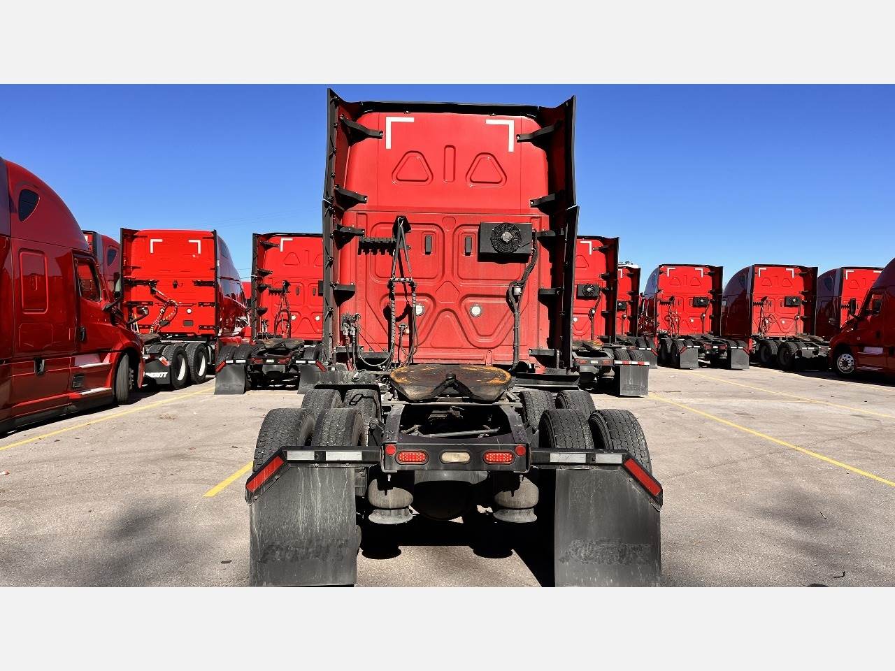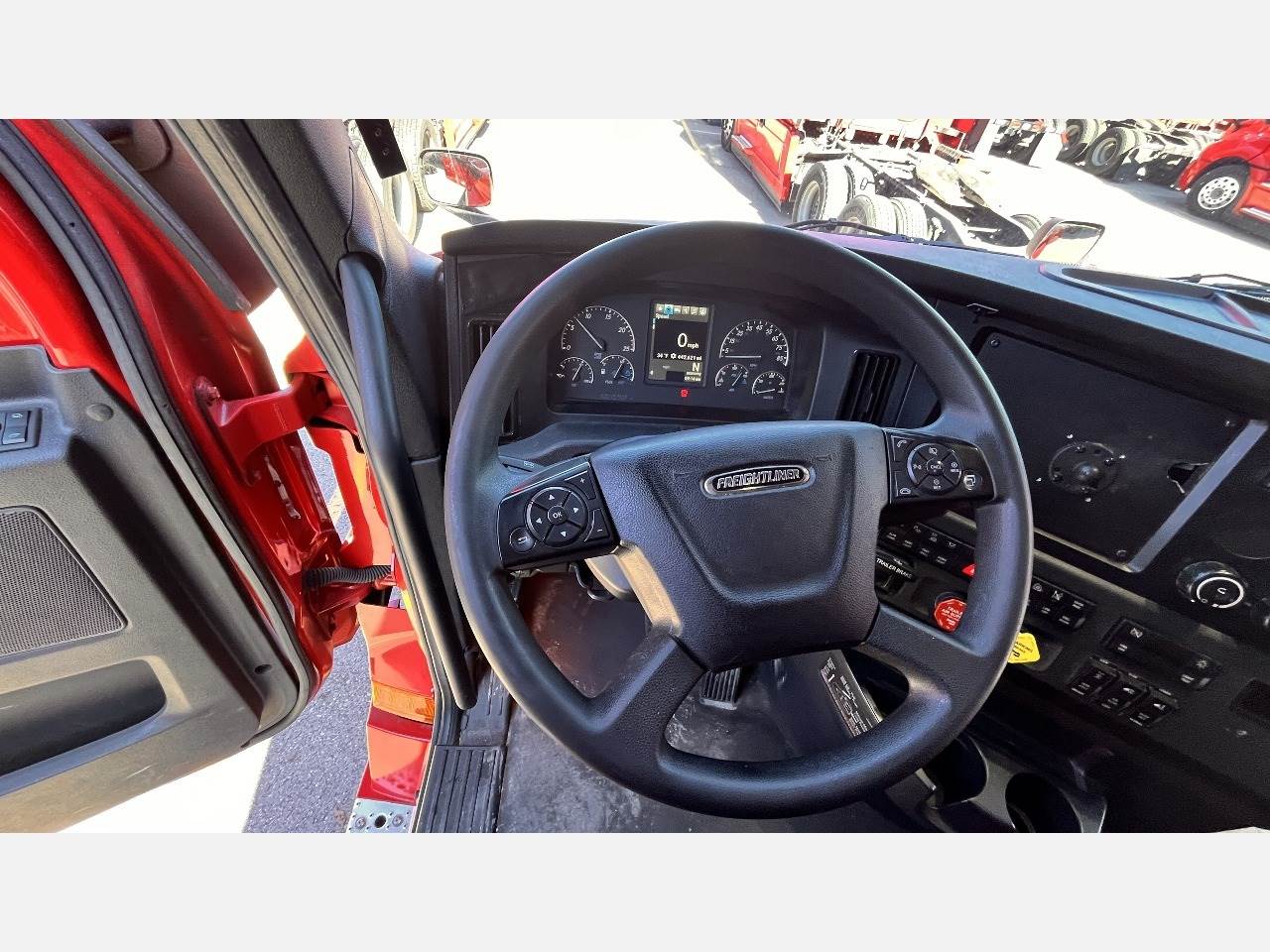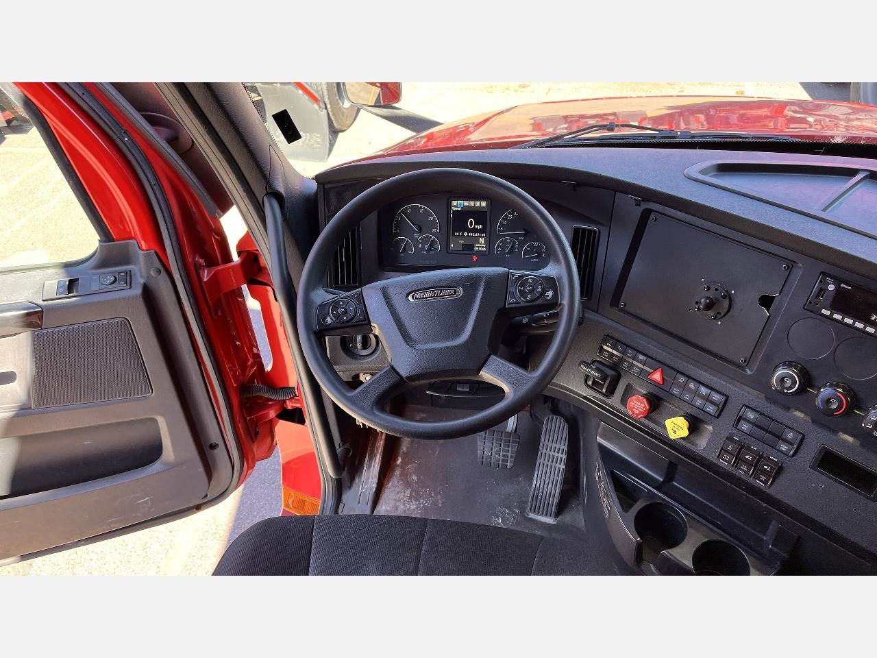 This 2023 Freightliner Cascadia 126 is equipped with a Detroit DD15 14.8 L 455 HP engine with engine brake paired with a Detroit DT12 1550 DH 12 speed automatic transmission and a Meritor 2.47 rear axle ratio. The truck uses a tandem axle configuration rated at 12,000 pounds on the front axle and 40,000 pounds on the rear axle with a 52,000 pound GVWR. It includes dual aluminum fuel tanks totaling 200 gallons, a single exhaust, a steel frame, air ride suspension, and a 225 inch wheelbase. The unit has aluminum front wheels with steel rear wheels and 295 75R22.5 tires and features a stationary fifth wheel. The 72 inch sleeper includes a workstation that converts to dual bunks, gray interior, dual high back seats including an air ride passenger seat, dual power mirrors, operational air conditioning, an AM FM Bluetooth radio, and an operational auxiliary power unit. This truck is exceptionally clean throughout and features a modern digital dash that provides clear system information and improved driver visibility. The engine hours are low for its model year and support the overall condition. Additional equipment includes heated mirrors, full fairings, and collision avoidance. The exterior is red with a painted bumper.