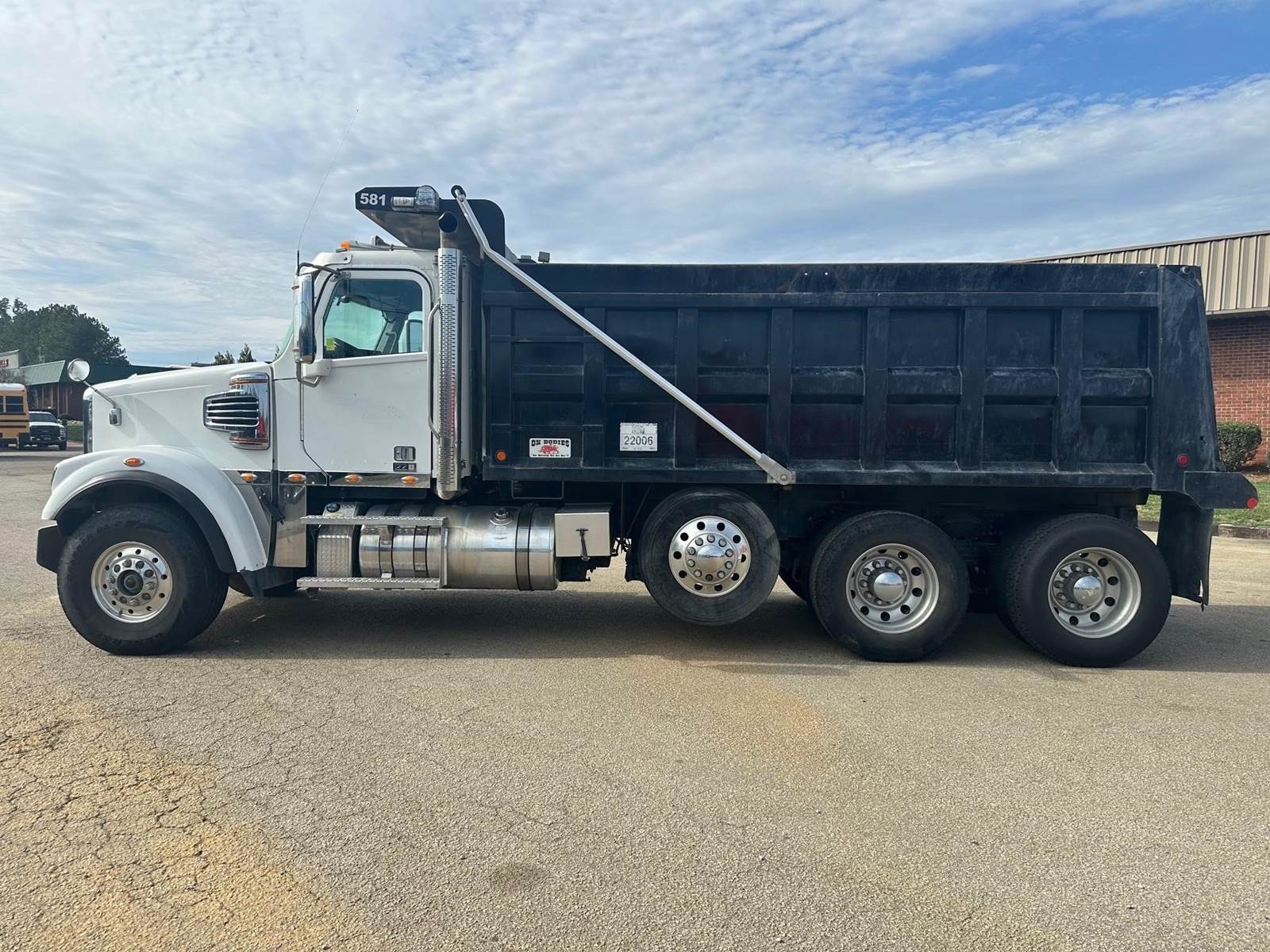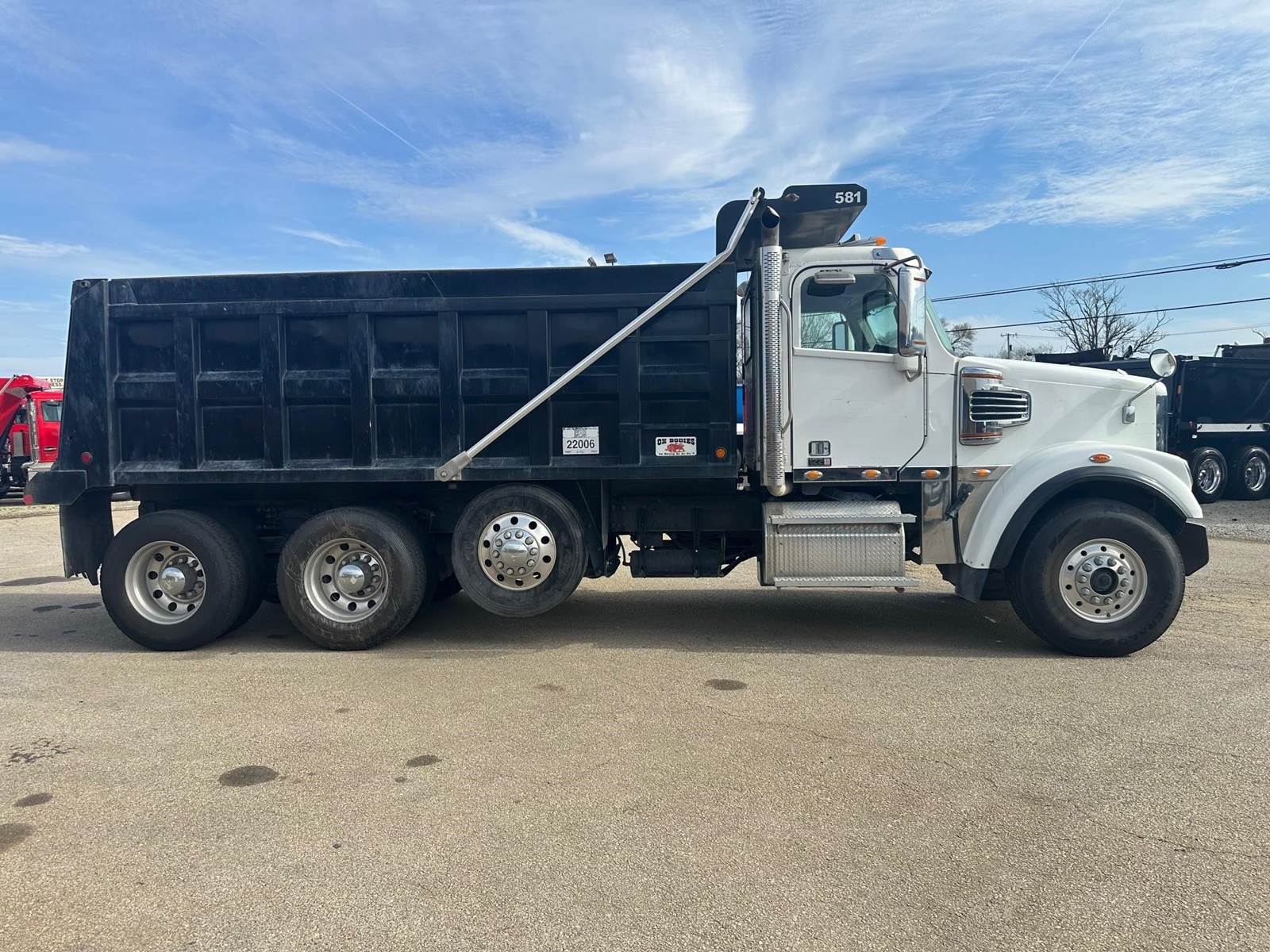 2023 Freightliner 122SD --- Tri Axle, DD-13 Detroit 470 HP, Allison Automatic 6 Speed, 4.56 Ratio, 20,000 Front Axle, 46,000 Rear Axle, 242" Wheelbase, 22' 7" Bridge, TUFTRAC, Double Frame, 2 Stage Engine Brake, Air Brake, Full Locking Rears, 17' Steel OX Dump Body, 50" Sides, Air Gate, Electric Tarp, 1 Steerable Lift Axle, All Aluminum, Single Stack, Aluminum Fuel Tank, Air Ride Cab, Dual High Back Seats, Air Ride Seats, High Level Interior, Wood Grain Dash, Chrome Gauge Package, Heated Mirrors, Cruise Control, Tilt & Telescopic Steering Wheel, AM/FM, Power Windows, P/L, P/S, AC.