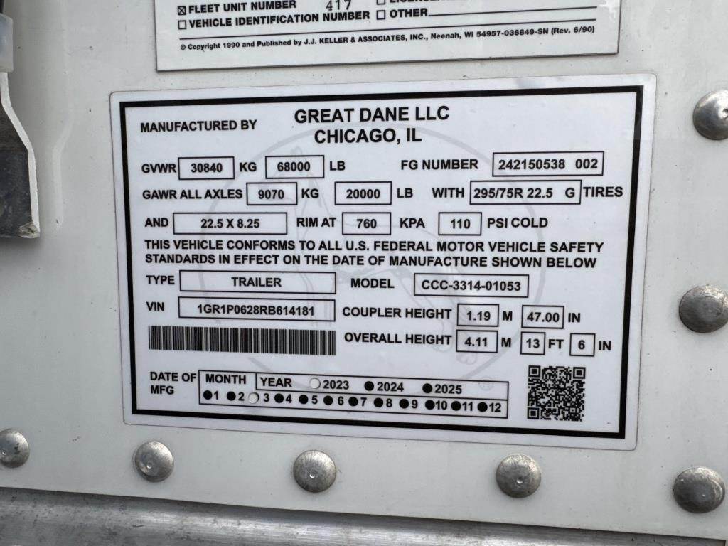 Location: Kaukauna, WI Approx 53' Length, 102" Width, 68000LB GVWR, Air Ride, Sliding Axles, 2 Speed Landing Gear, Rear Swing Doors, Full Aluminum Rims, 295/75R22.5 Tires, Spare Tire VIN: 1GR1P0628RB614181