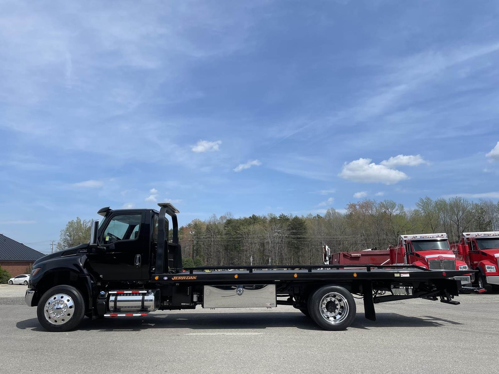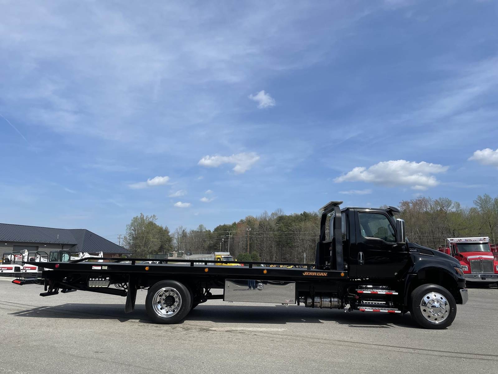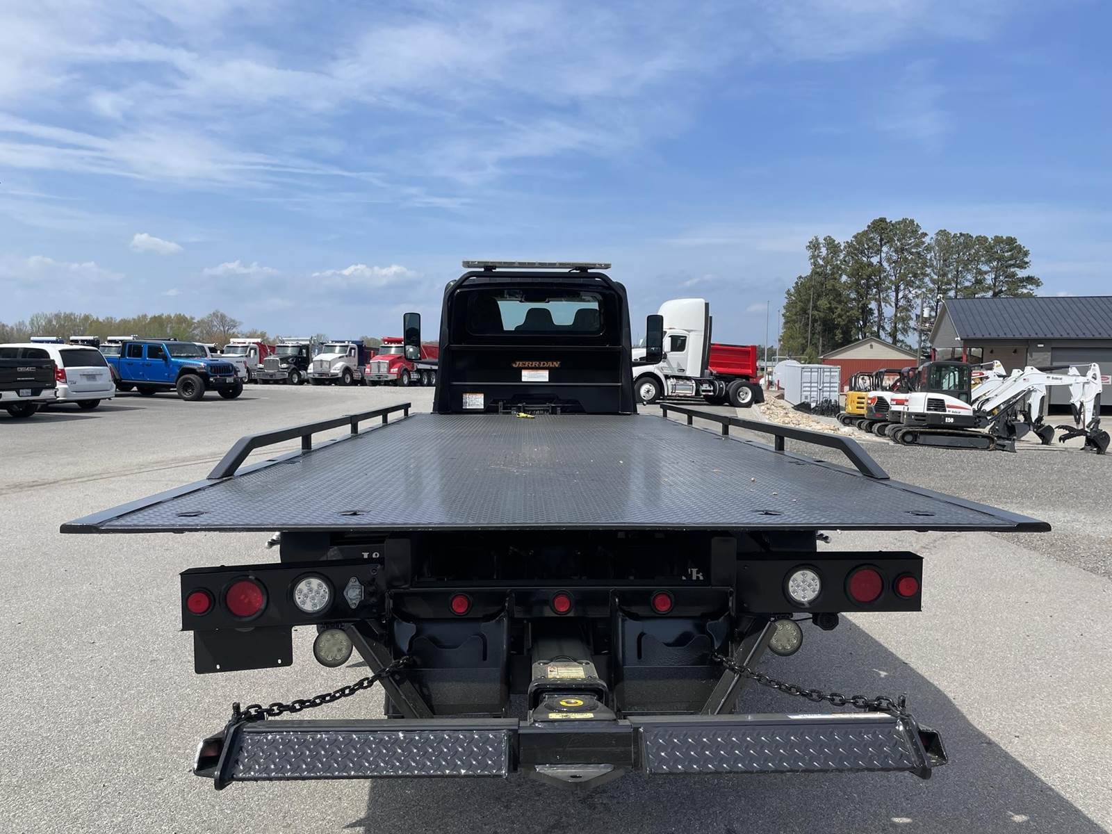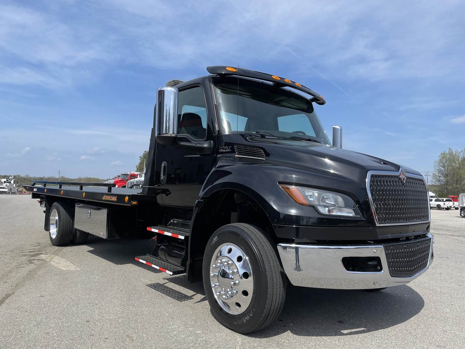 Under CDL, Single Axle, 22' JerrDan Steel Rollback, 102" W, Wheel Lift, Ramsey 5K Winch, Hydraulic Tilt, Cummins B6.7L 260 HP, Allison Automatic 6 Speed, Exhaust Brake, 4.63 Ratio, Air Ride, 8,000 FA, 17,500 RA, 25,500 GVWR, Tool Boxes, Air Brakes, P/S, A/C, AM/FM, Heated Mirrors, Cruise, Tilt/Tele Wheel, Power Windows, Locks, and Mirrors, High Back Driver Seat, 50 Gallon Aluminum Fuel Tank, 255/70R22.5 Tires on Aluminum Wheels Front and Outside Rear, Chrome Bumper, Under CDL 25,500 Lb. GVWR