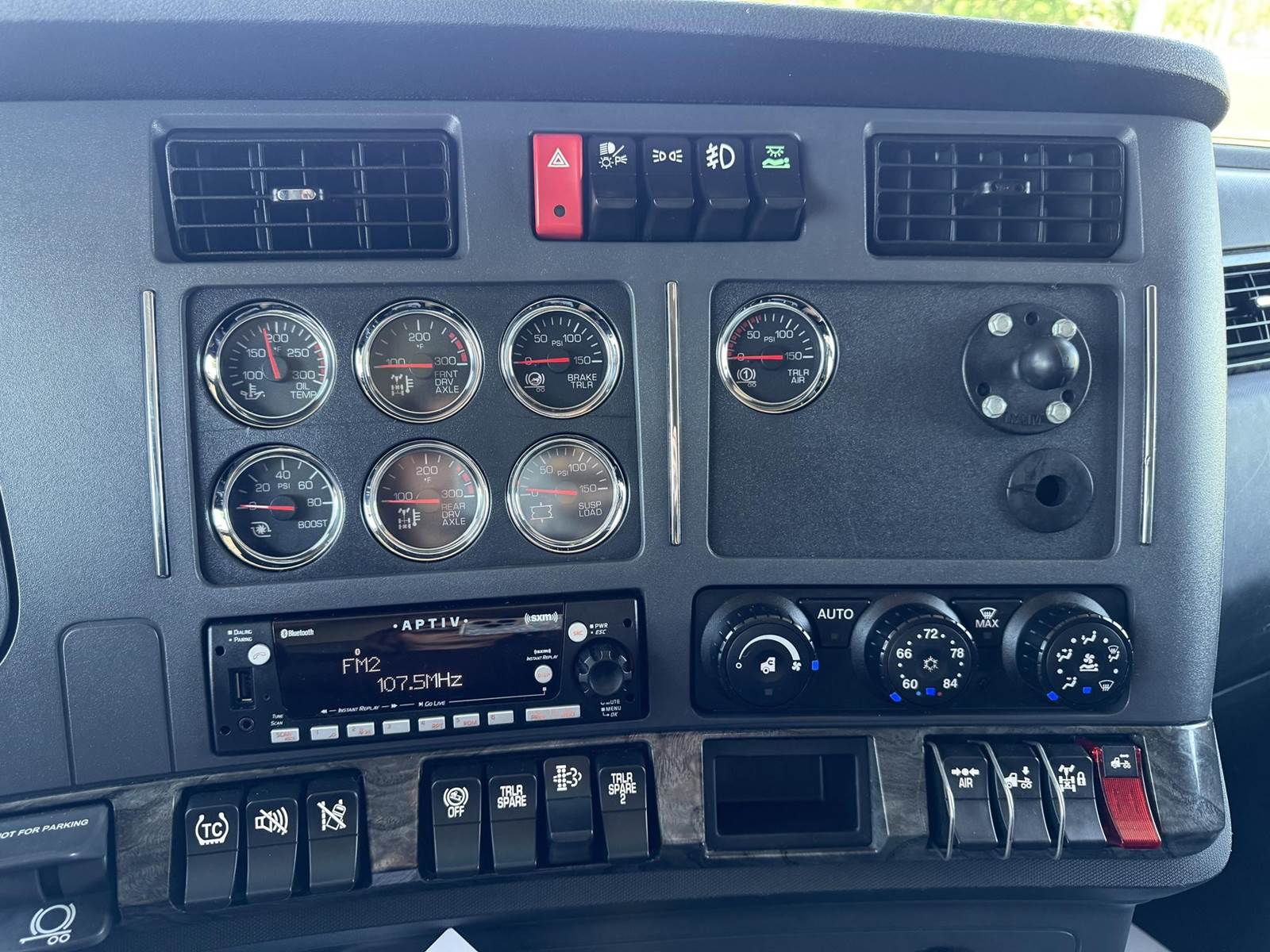 Exterior upgrades include dual exhaust stacks, chrome bumper, visor, and hood mirrors. Inside, enjoy smart wheel controls, digital dash, and extra gauges for a modern driver experience. Espar heater, sliding 5th wheel, and air ride suspension round out this fully loaded unit.