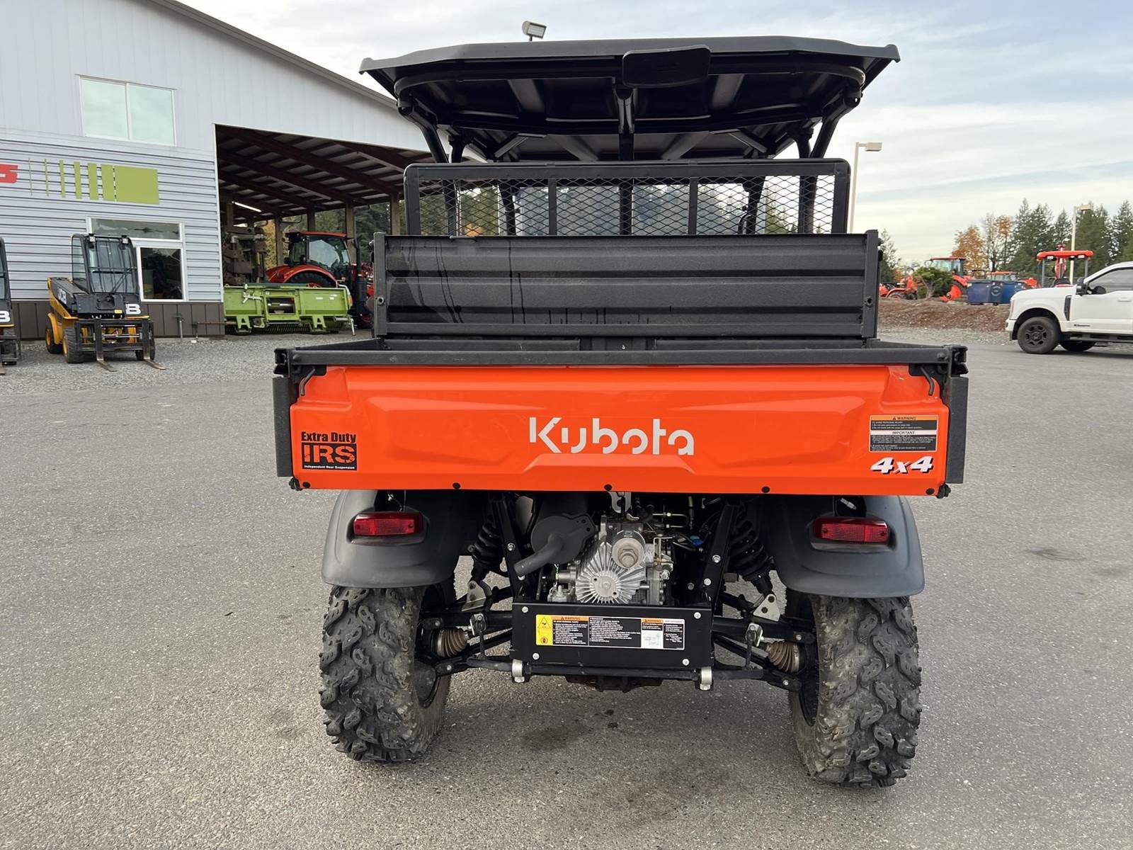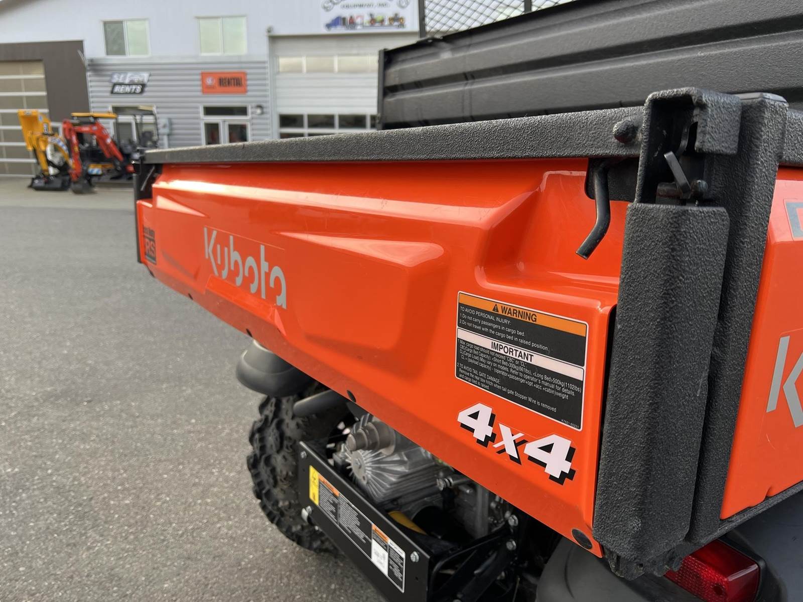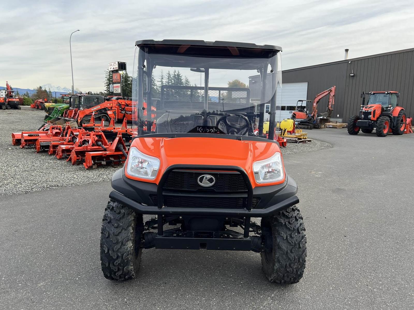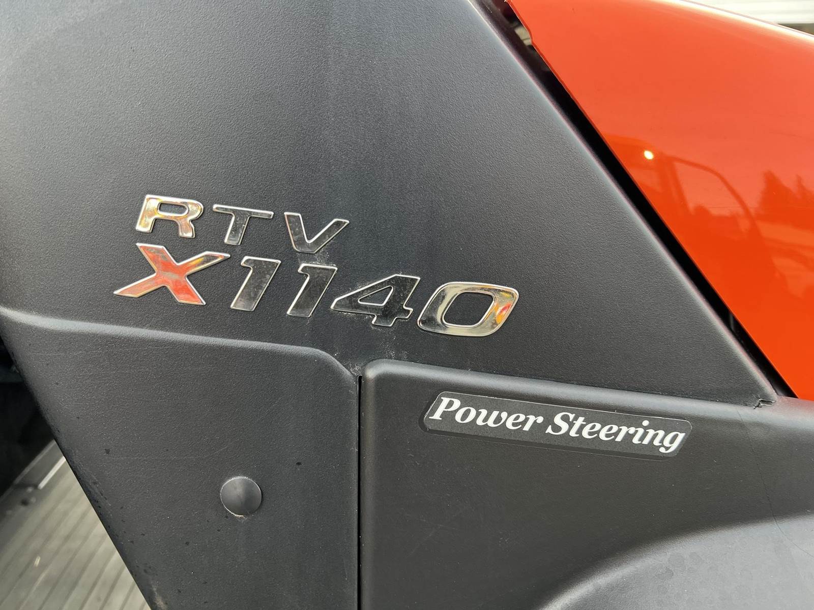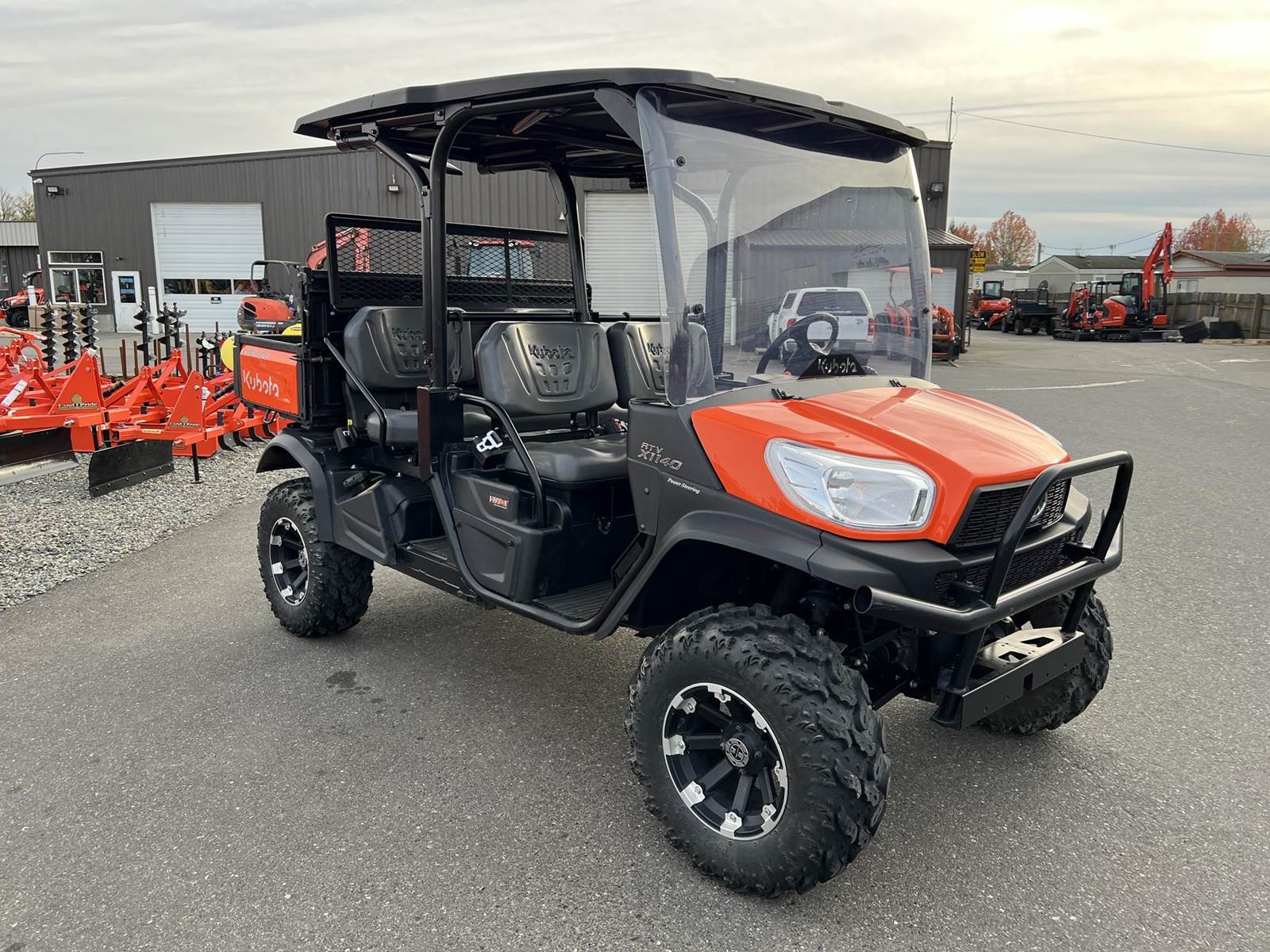 2023 KUBOTA RTV-X1140W Utility Vehicle - Kubota diesel engine, flip up the rear seat and fold down the industry-leading cargo bed, hydraulic tilt bed, front and rear independent suspension, power steering, digital meter cluster, variable hydro transmission, grill guard, glass windshield and roof—Worksite orange. Has a two inch lift with 27X11.00R14 off-road tires.