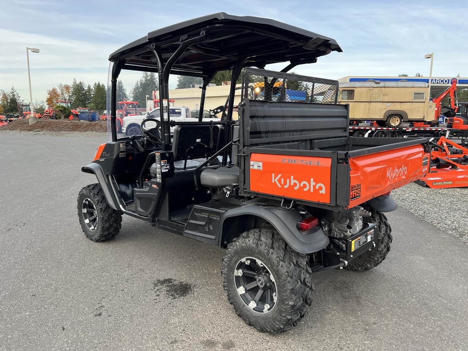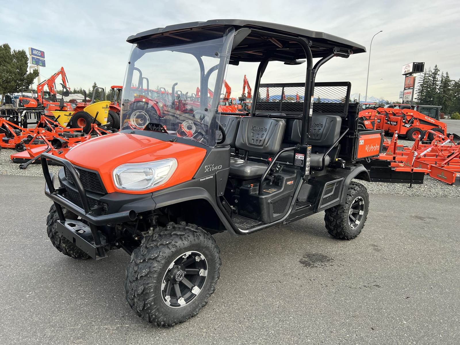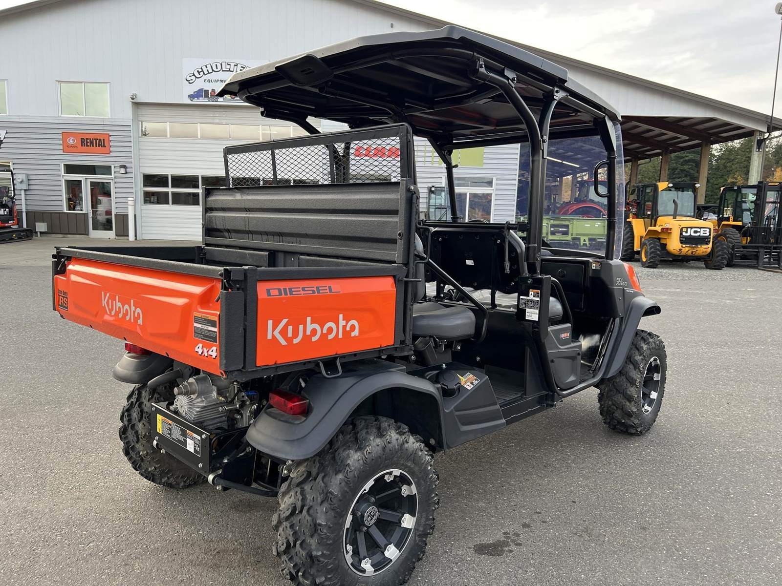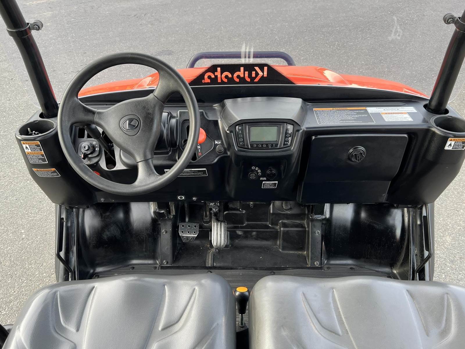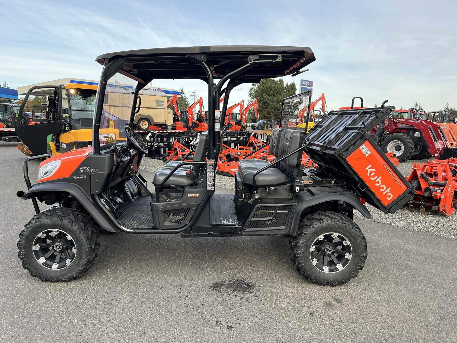 2023 KUBOTA RTV-X1140W Utility Vehicle - Kubota diesel engine, flip up the rear seat and fold down the industry-leading cargo bed, hydraulic tilt bed, front and rear independent suspension, power steering, digital meter cluster, variable hydro transmission, grill guard, glass windshield and roof—Worksite orange. Has a two inch lift with 27X11.00R14 off-road tires.